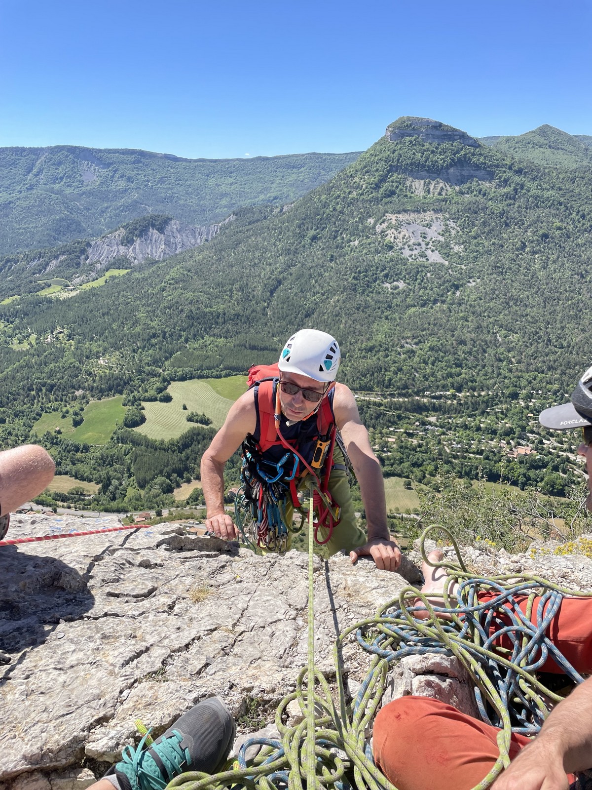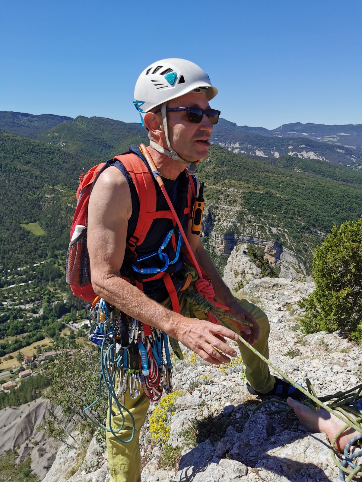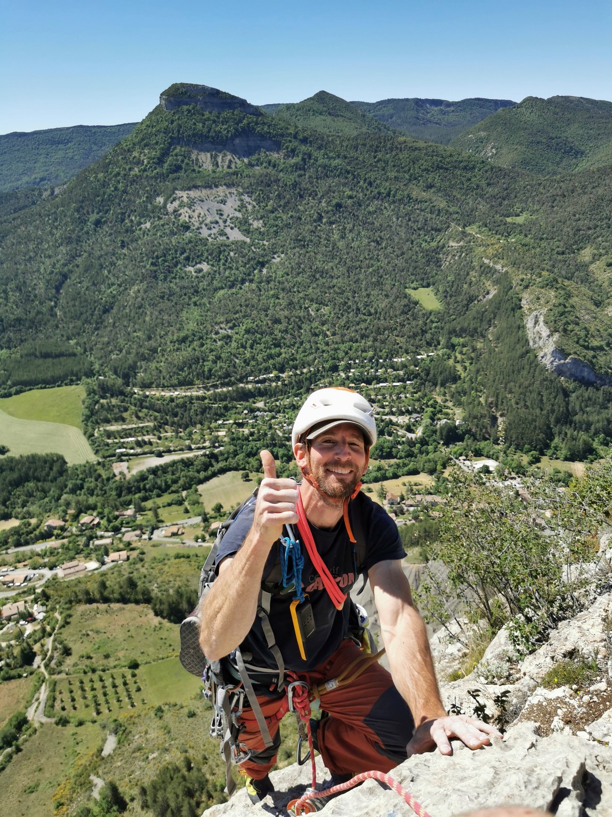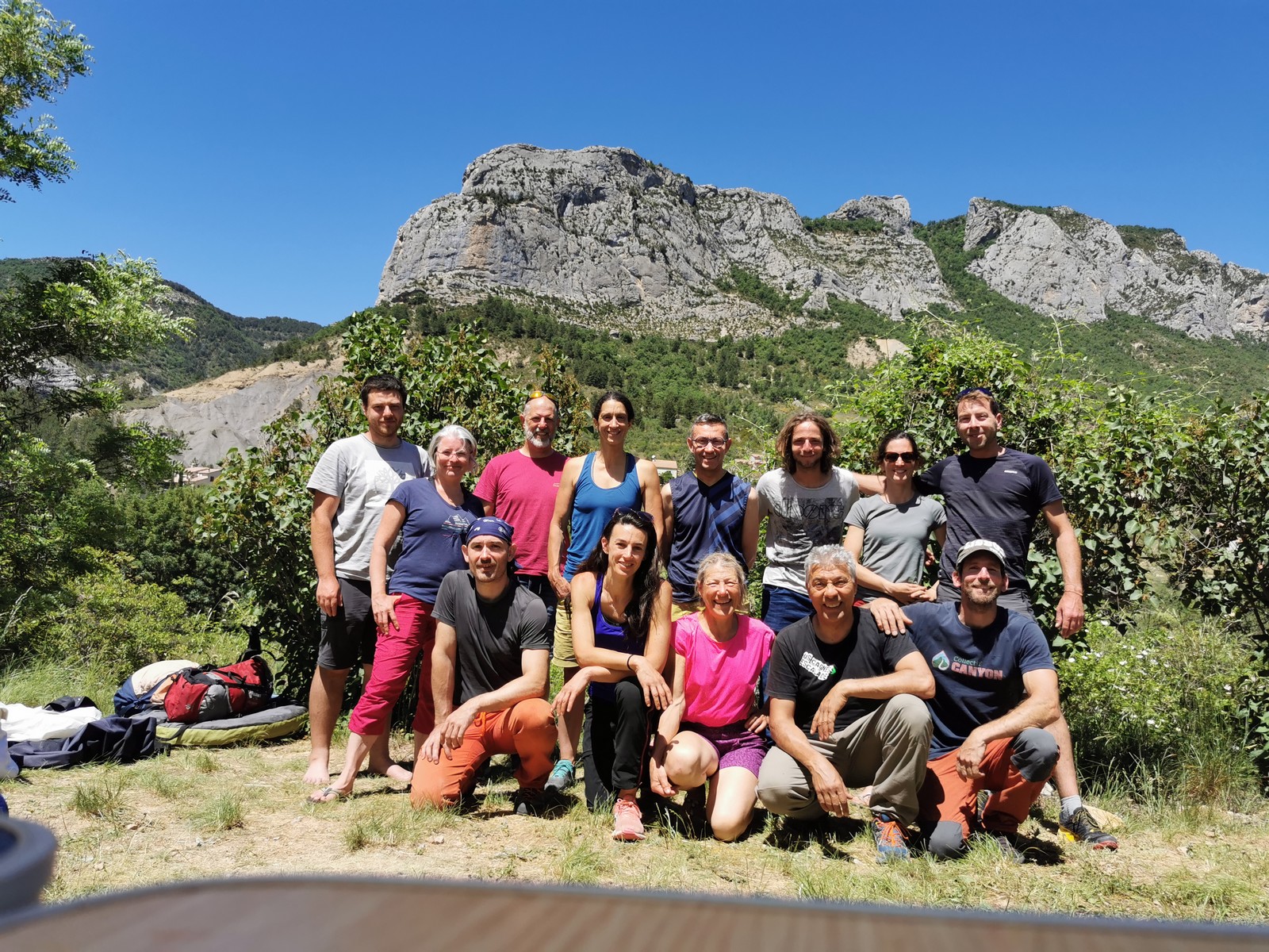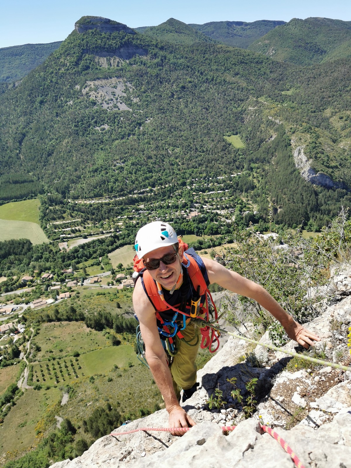 Les stagiaires sont fatigués et ce sont souvent les plus expérimentés qui gardent la tête dans les cordées. Ça nous permet aussi d’avancer assez vite et comme j’étais dans le coin la veille, j’ai pu repérer un peu les relais et les itinéraires un peu paumatoires parfois. Comme on est tous proches, c’est assez fun. On s’entraide, on se guide, ça fonctionne bien. Nous sortons tous plus ou moins en même temps au sommet peu après midi. Les visages sont épuisés, mais les sourires radieux. Nous avons grimpé de très belles voies et la réputation d’Orpierre n’est pas usurpée. Nous retournons au camping pour rejoindre Sandra qui, en fée du logis, a travaillé fort. Reste à plier le barnum et organiser le matos dans les voitures. Il est 14h quand nous décollons pour un retour à la vraie vie !