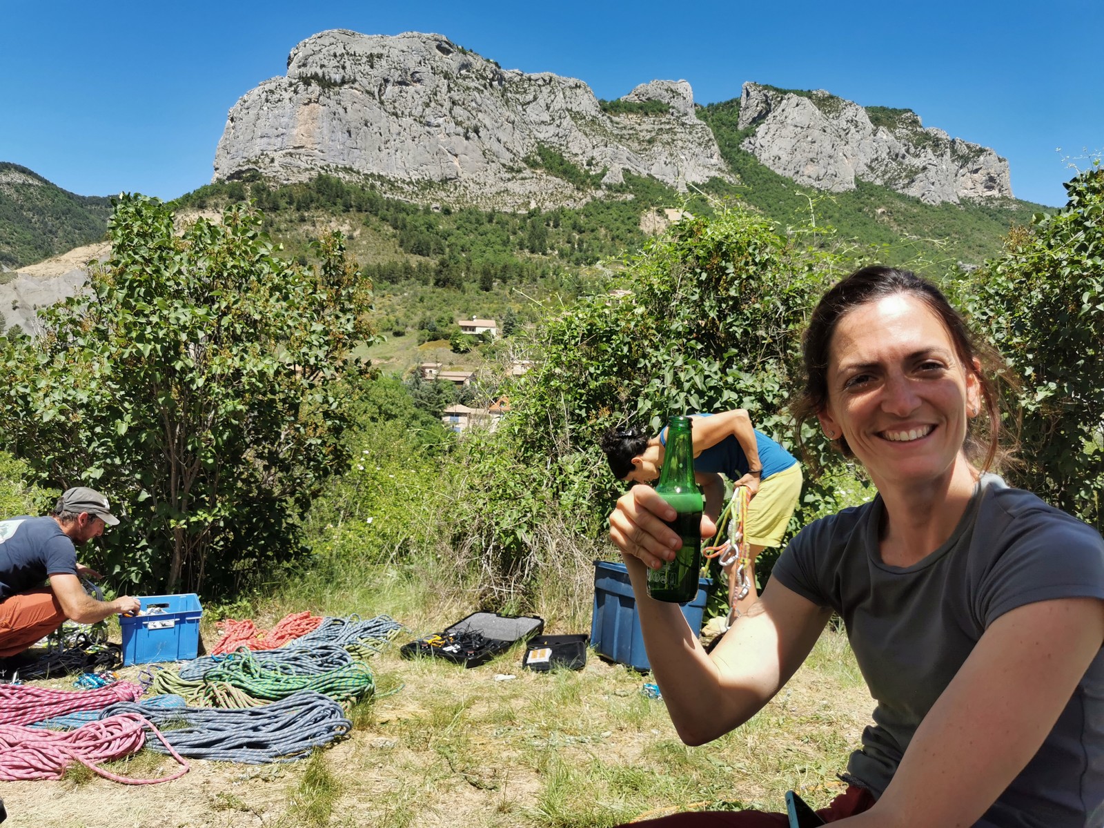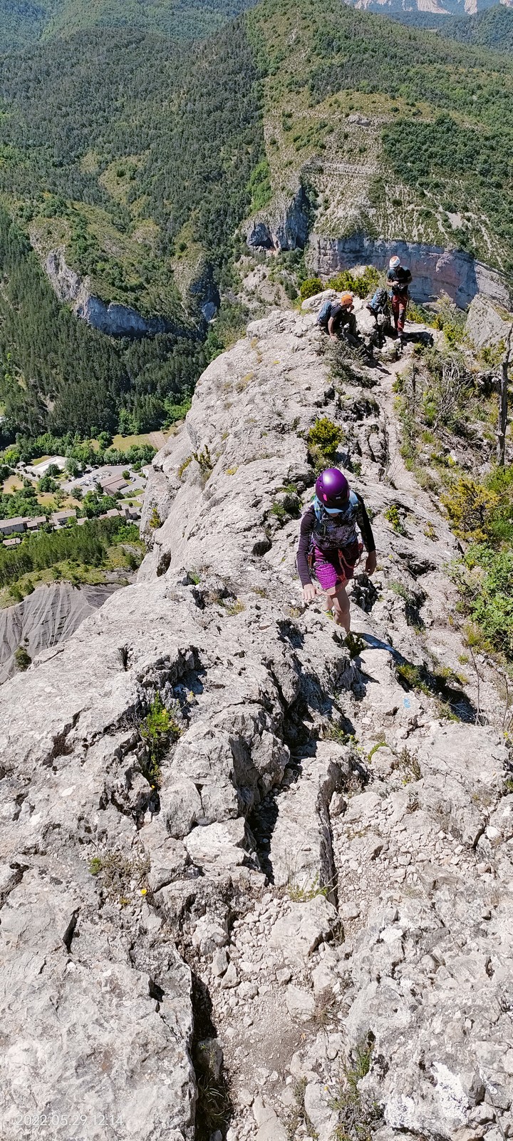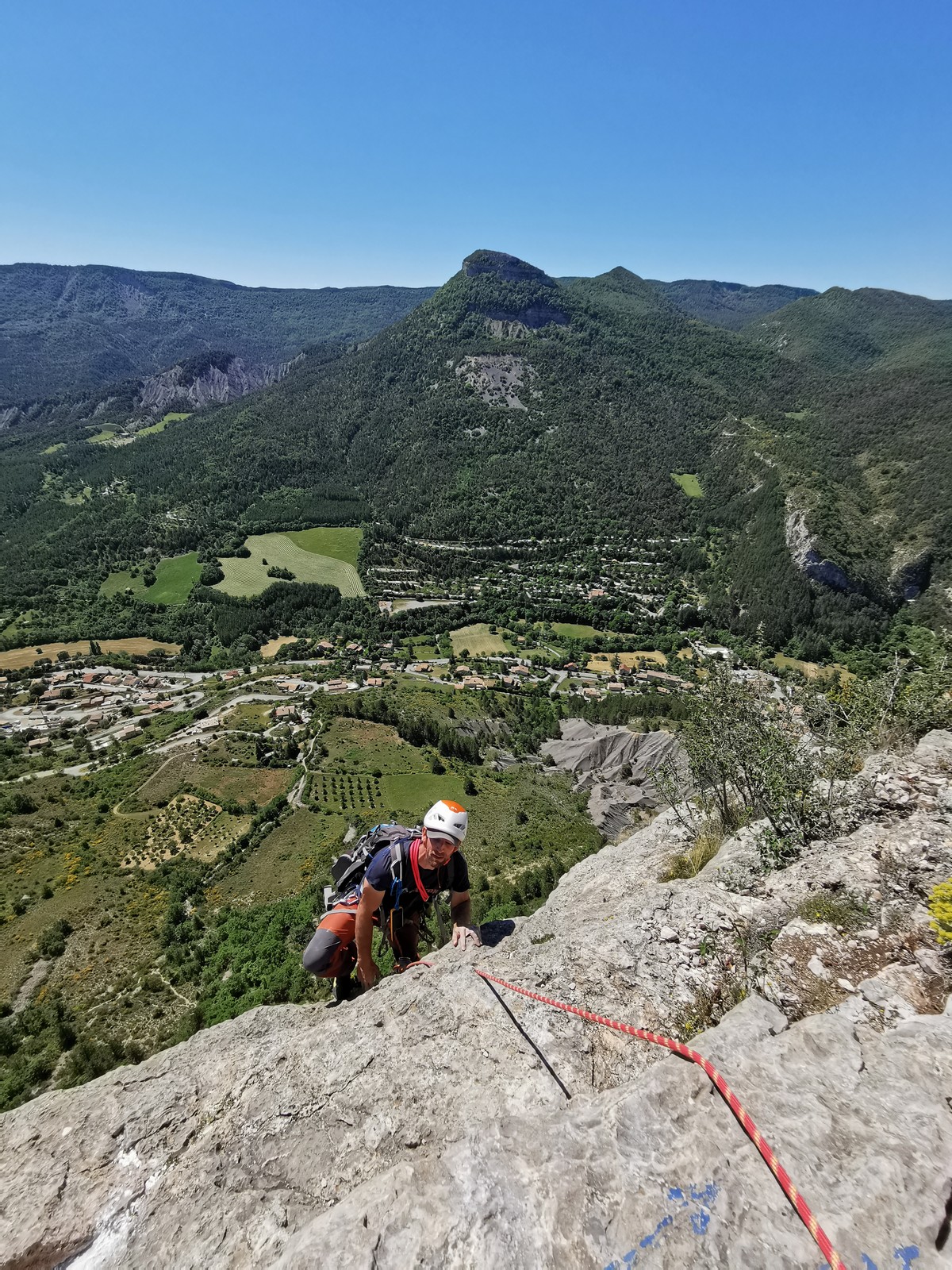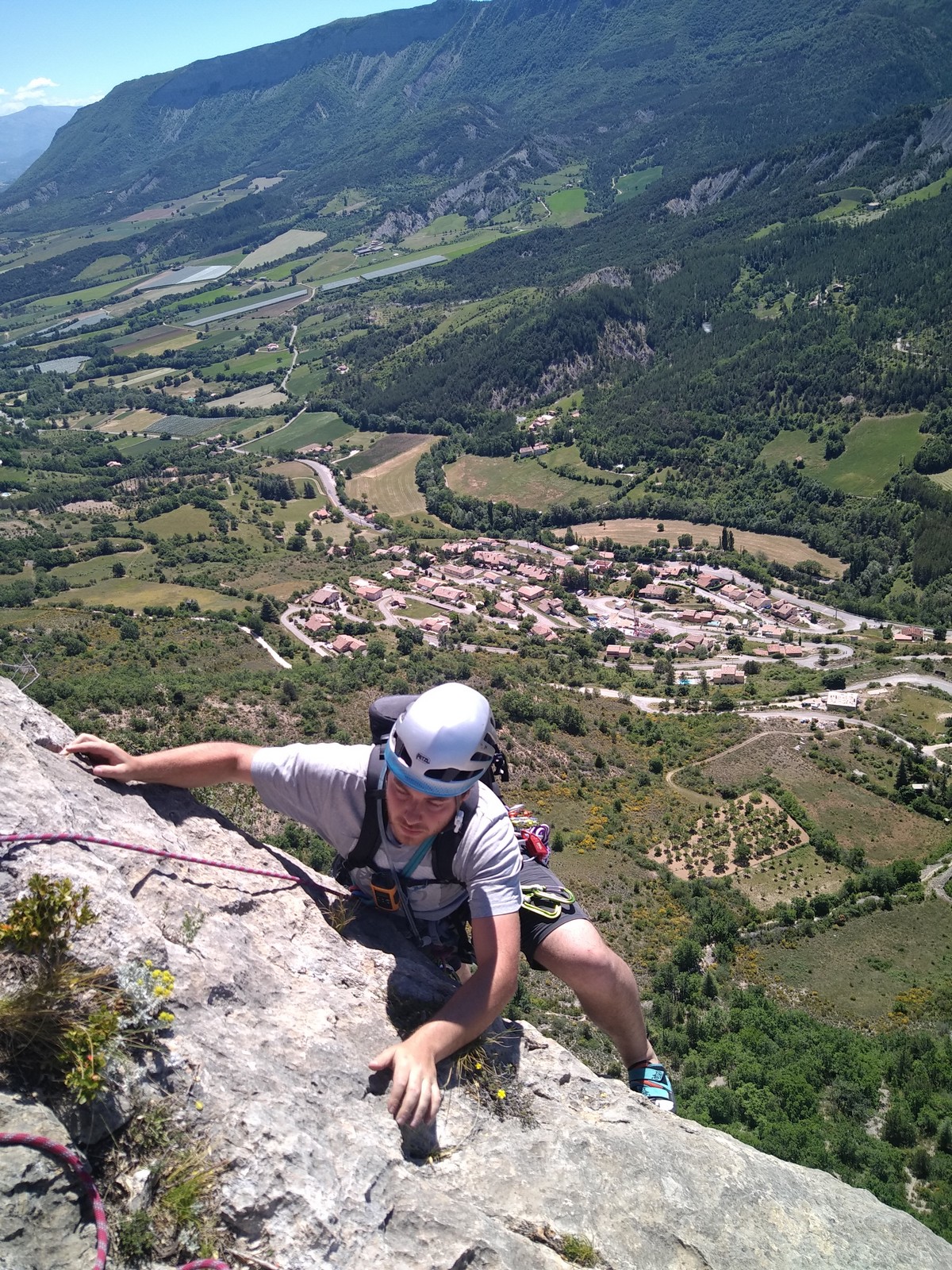 Les stagiaires sont fatigués et ce sont souvent les plus expérimentés qui gardent la tête dans les cordées. Ça nous permet aussi d’avancer assez vite et comme j’étais dans le coin la veille, j’ai pu repérer un peu les relais et les itinéraires un peu paumatoires parfois. Comme on est tous proches, c’est assez fun. On s’entraide, on se guide, ça fonctionne bien. Nous sortons tous plus ou moins en même temps au sommet peu après midi. Les visages sont épuisés, mais les sourires radieux. Nous avons grimpé de très belles voies et la réputation d’Orpierre n’est pas usurpée. Nous retournons au camping pour rejoindre Sandra qui, en fée du logis, a travaillé fort. Reste à plier le barnum et organiser le matos dans les voitures. Il est 14h quand nous décollons pour un retour à la vraie vie !