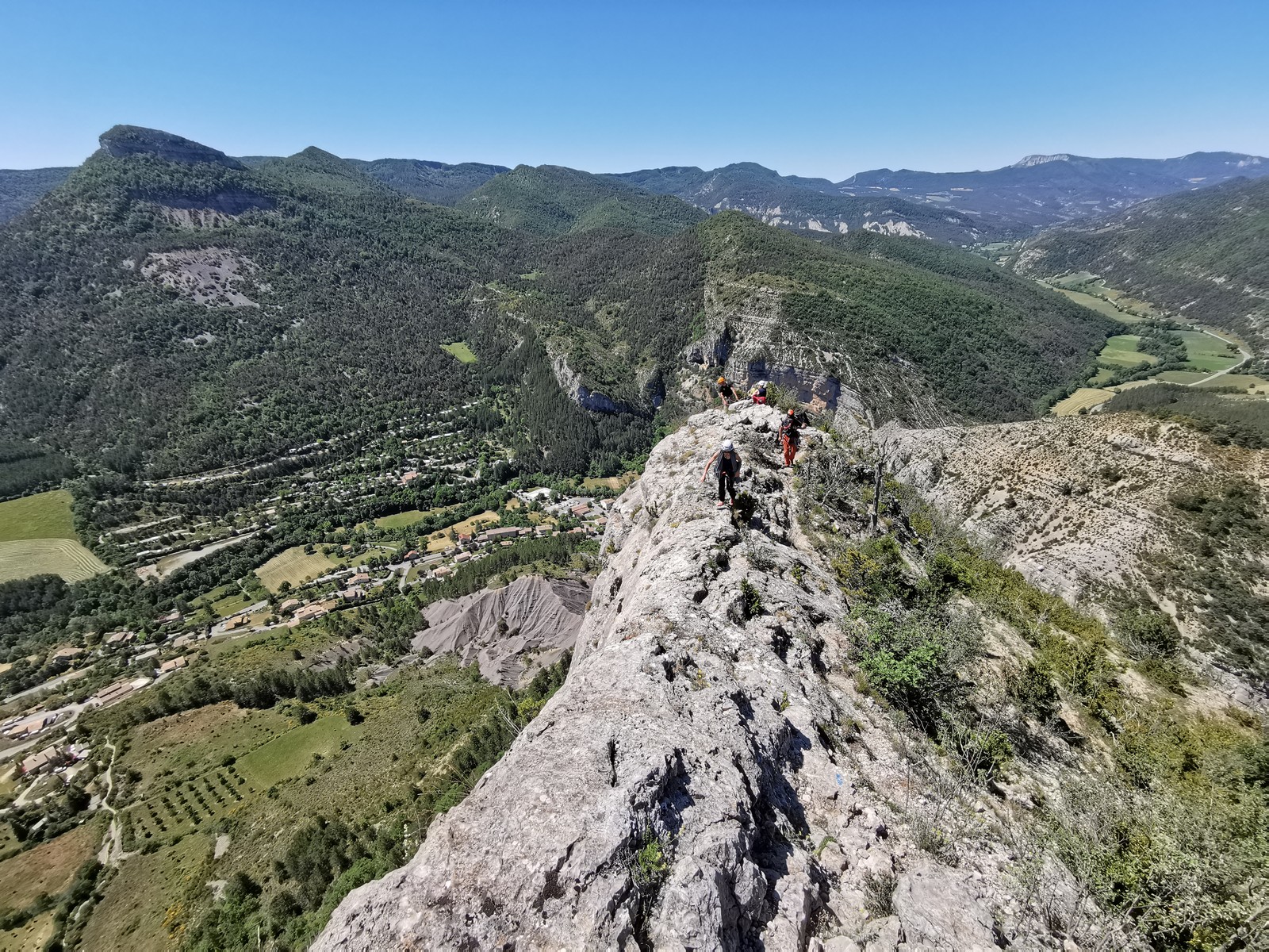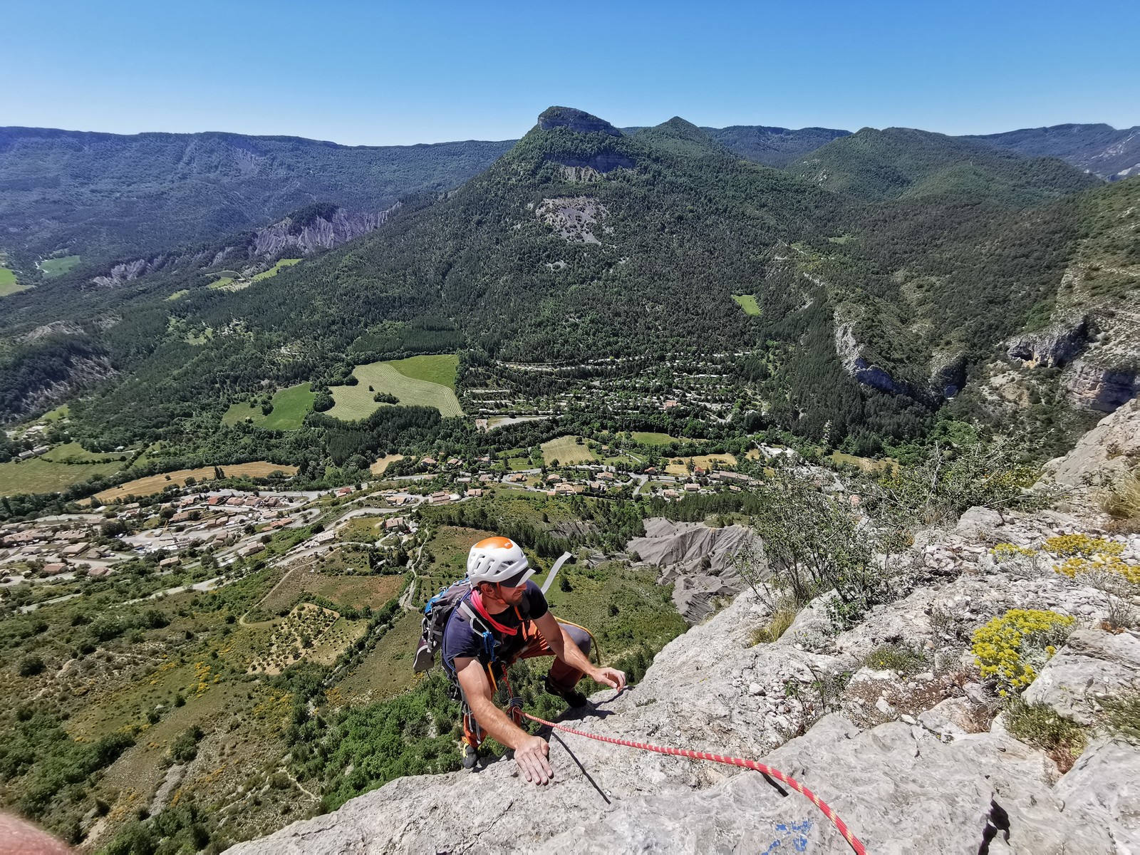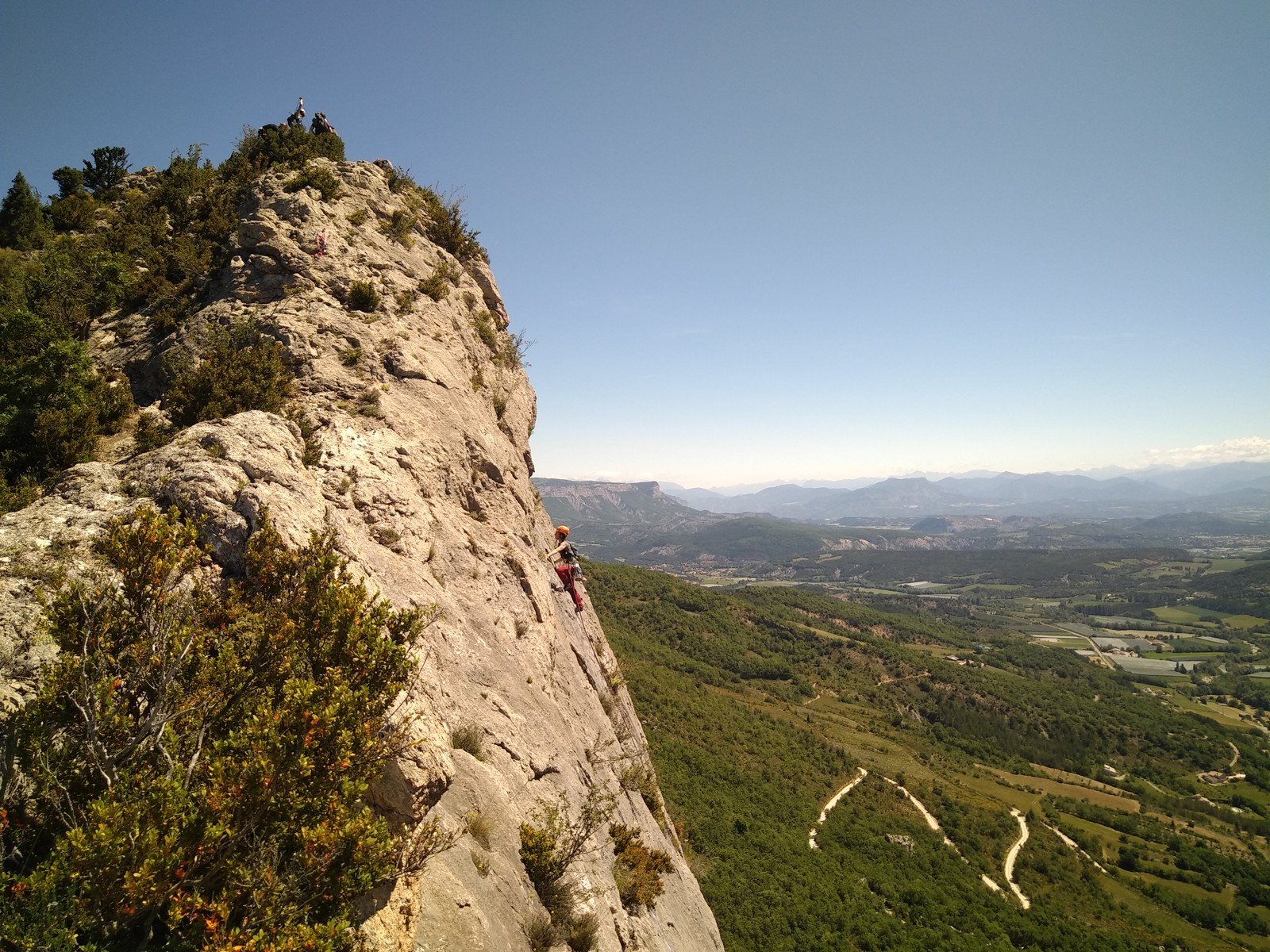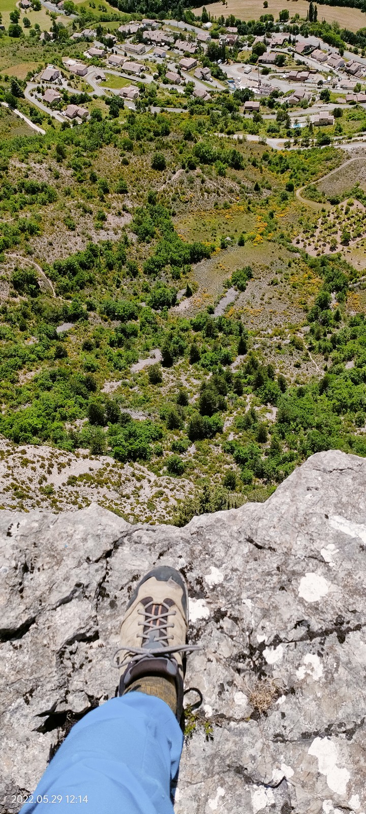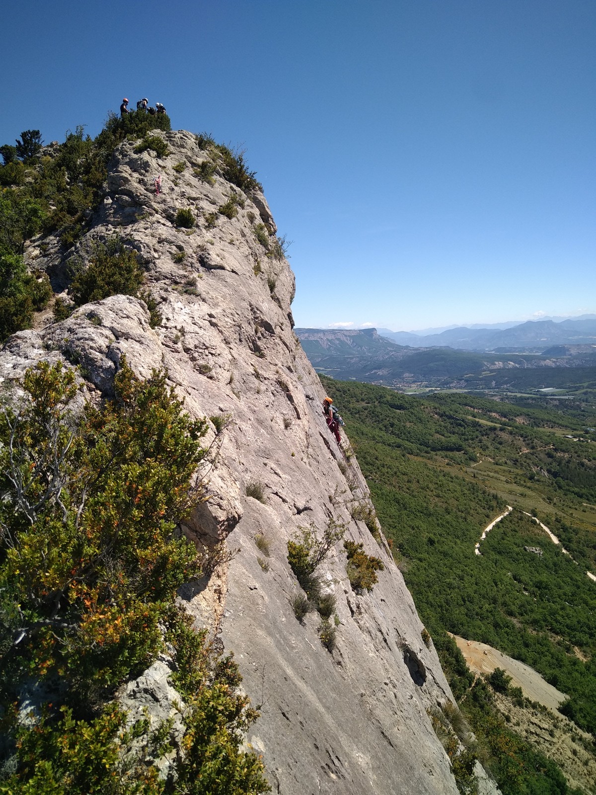 Les stagiaires sont fatigués et ce sont souvent les plus expérimentés qui gardent la tête dans les cordées. Ça nous permet aussi d’avancer assez vite et comme j’étais dans le coin la veille, j’ai pu repérer un peu les relais et les itinéraires un peu paumatoires parfois. Comme on est tous proches, c’est assez fun. On s’entraide, on se guide, ça fonctionne bien. Nous sortons tous plus ou moins en même temps au sommet peu après midi. Les visages sont épuisés, mais les sourires radieux. Nous avons grimpé de très belles voies et la réputation d’Orpierre n’est pas usurpée. Nous retournons au camping pour rejoindre Sandra qui, en fée du logis, a travaillé fort. Reste à plier le barnum et organiser le matos dans les voitures. Il est 14h quand nous décollons pour un retour à la vraie vie !