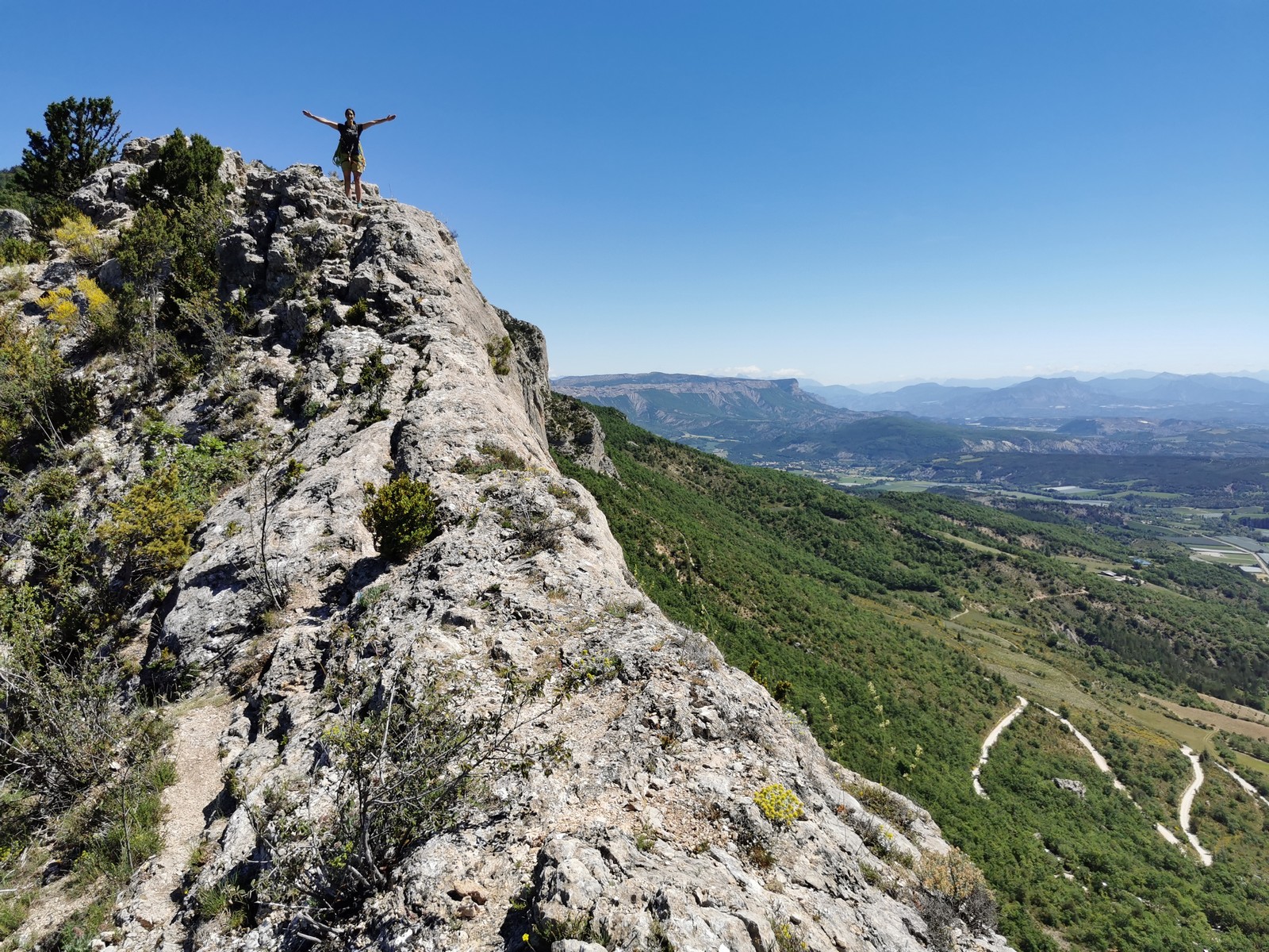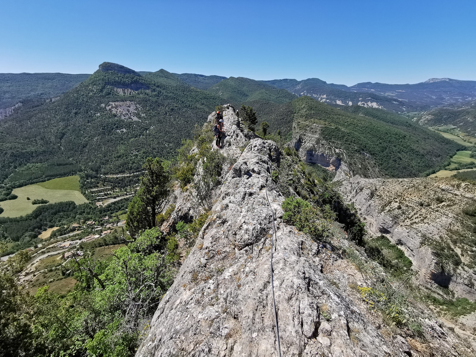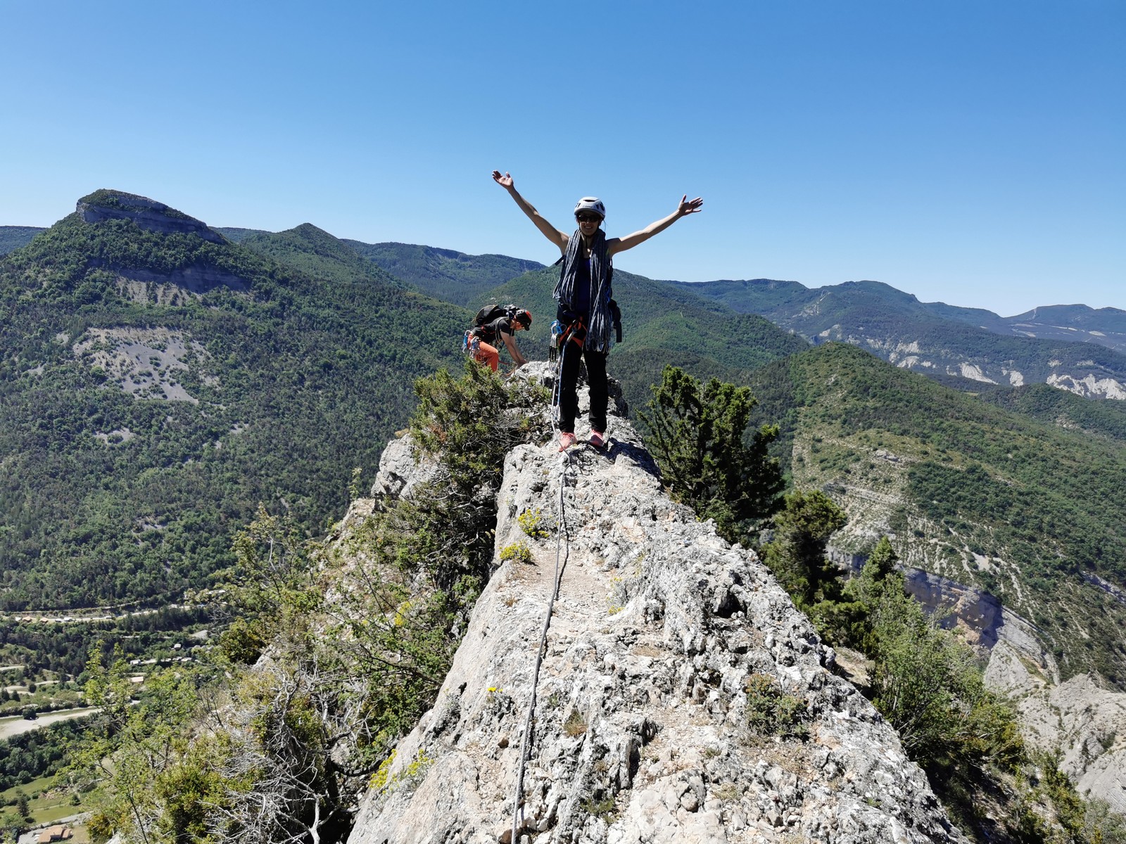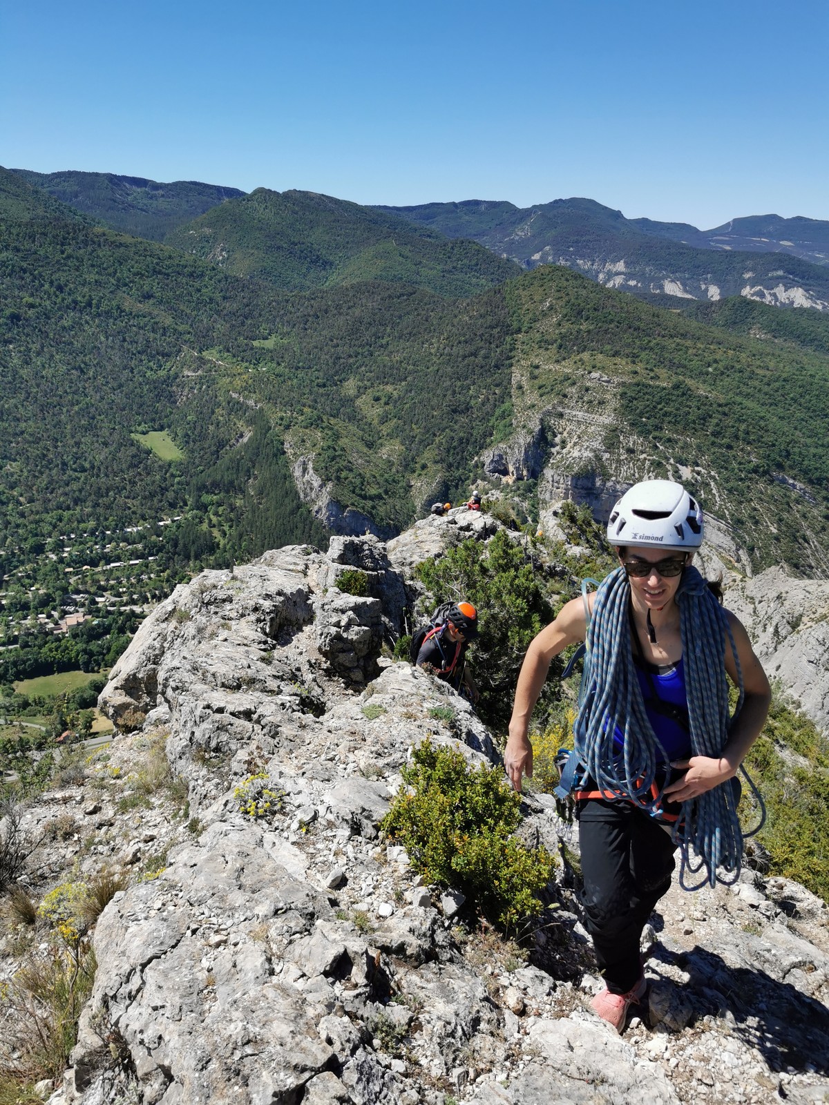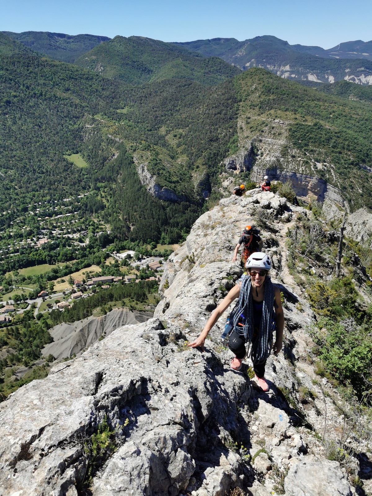 Les stagiaires sont fatigués et ce sont souvent les plus expérimentés qui gardent la tête dans les cordées. Ça nous permet aussi d’avancer assez vite et comme j’étais dans le coin la veille, j’ai pu repérer un peu les relais et les itinéraires un peu paumatoires parfois. Comme on est tous proches, c’est assez fun. On s’entraide, on se guide, ça fonctionne bien. Nous sortons tous plus ou moins en même temps au sommet peu après midi. Les visages sont épuisés, mais les sourires radieux. Nous avons grimpé de très belles voies et la réputation d’Orpierre n’est pas usurpée. Nous retournons au camping pour rejoindre Sandra qui, en fée du logis, a travaillé fort. Reste à plier le barnum et organiser le matos dans les voitures. Il est 14h quand nous décollons pour un retour à la vraie vie !