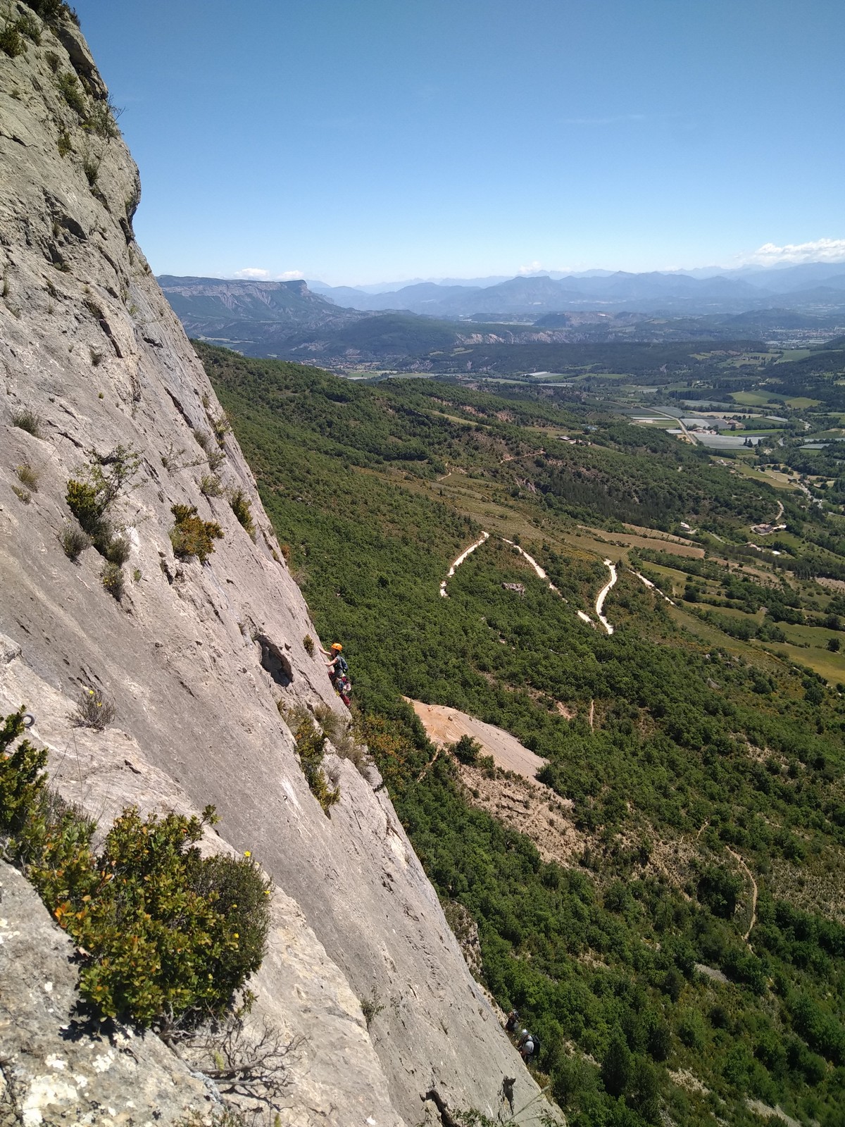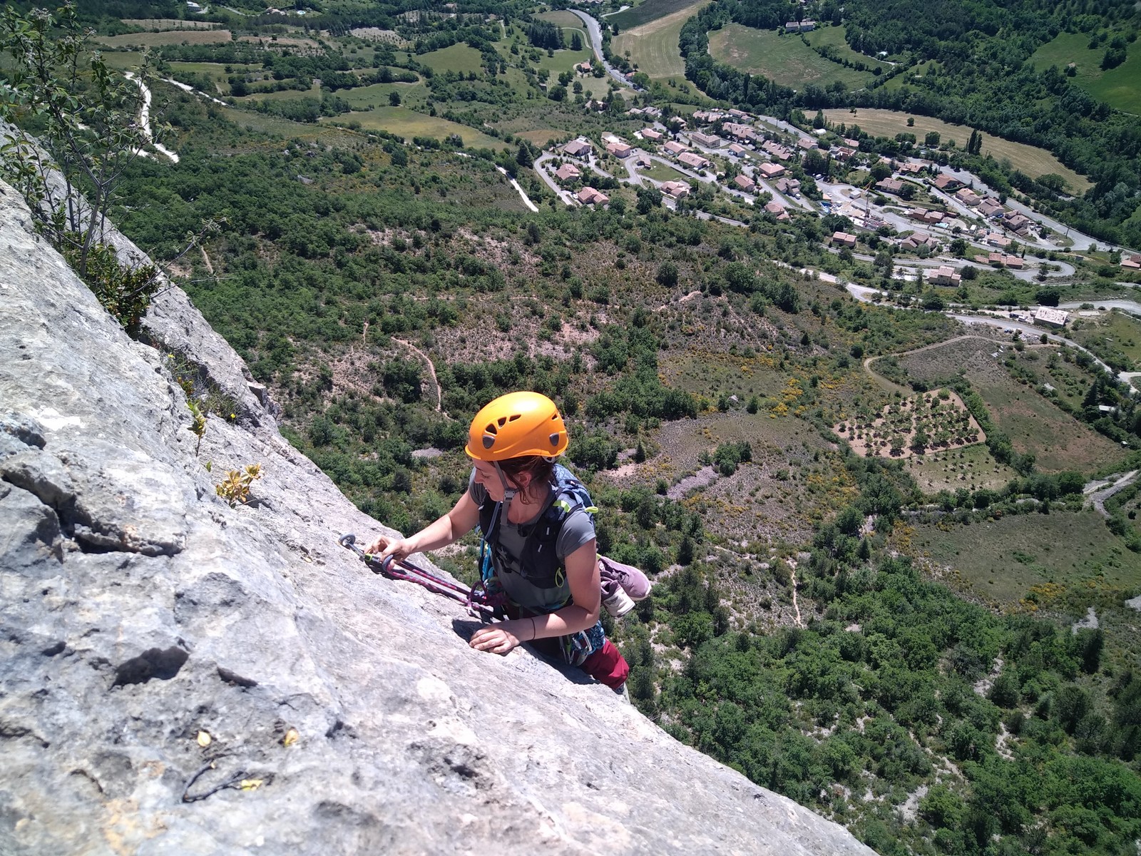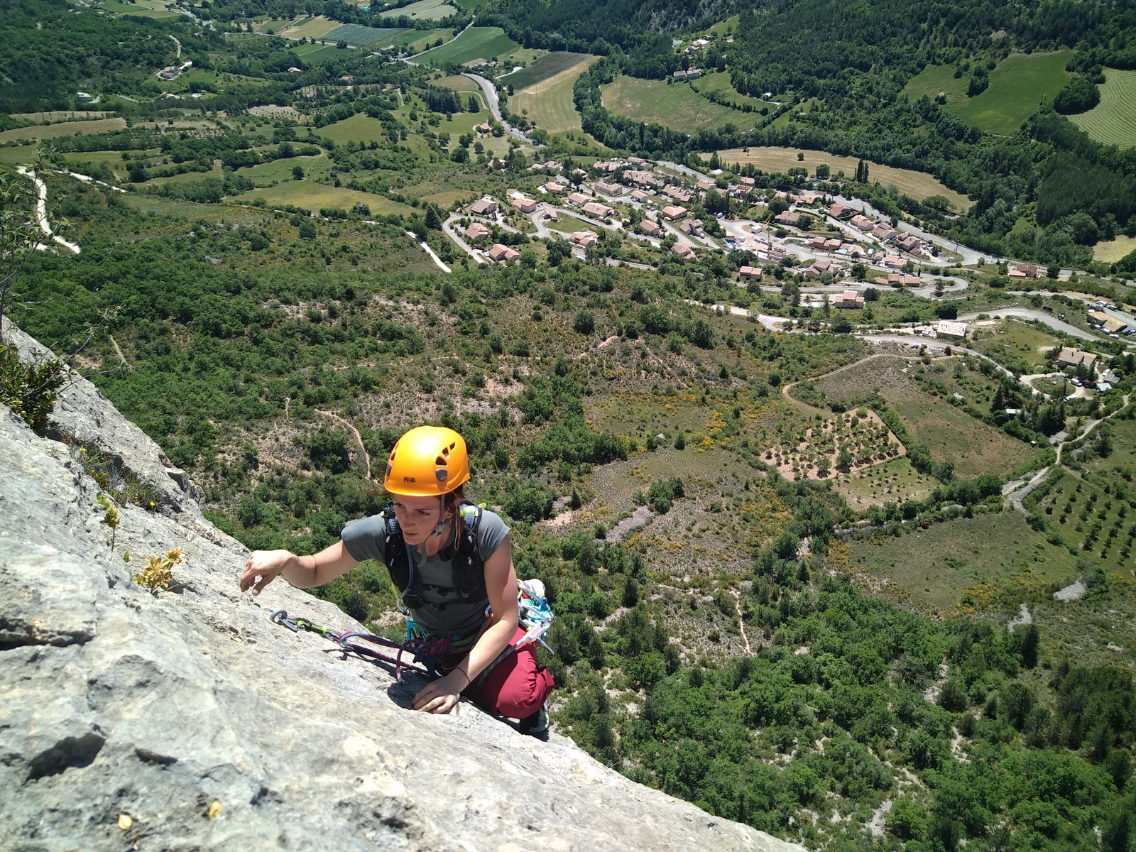 Le troisième jour est le jour où on s’attaque au Quiquillon, falaise emblématique d’Orpierre, avec ses voies un peu plus longues et plus soutenues. Nous avions fait la répartition des cordées la veille et gardé le même horaire. Mais cette fois, lorsque nous arrivons au pied des voies, c’est très compliqué. J’avais choisi la classique Brazil avec Jean, Jean-Luc et Hélène mais il y a trop de monde dans la voie et celles avoisinantes du même niveau. Mais il reste de libre « la princesse des astres », 160m, 6b max alors nous décidons de nous y atteler. Je pars en tête dans les premières longueurs afin de gagner un peu de temps.