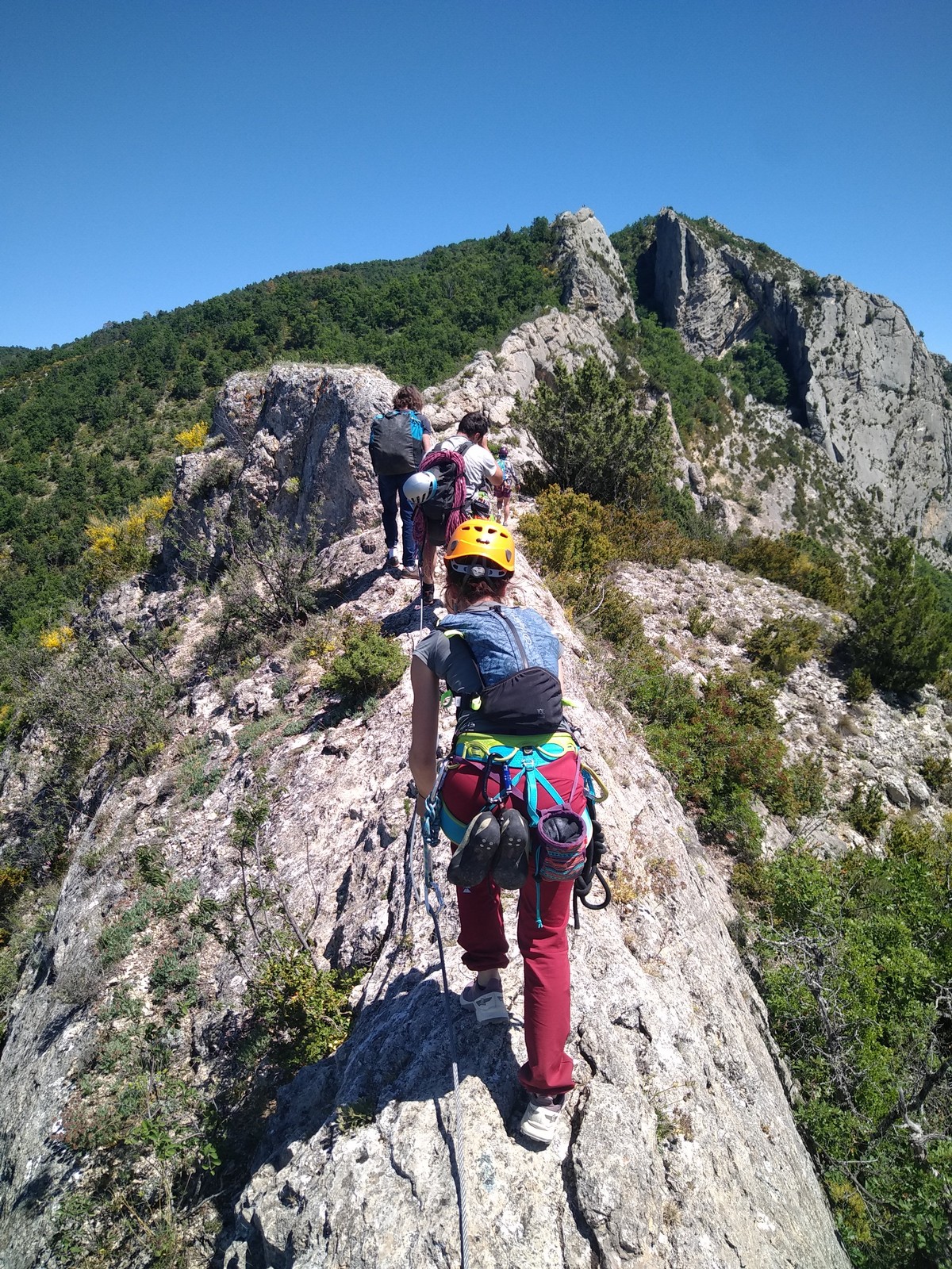 Cécile et Djé s’attaquent au « Pèlerin de Compostelle », 90m, 6a max, suivis par Phil et Hélène.