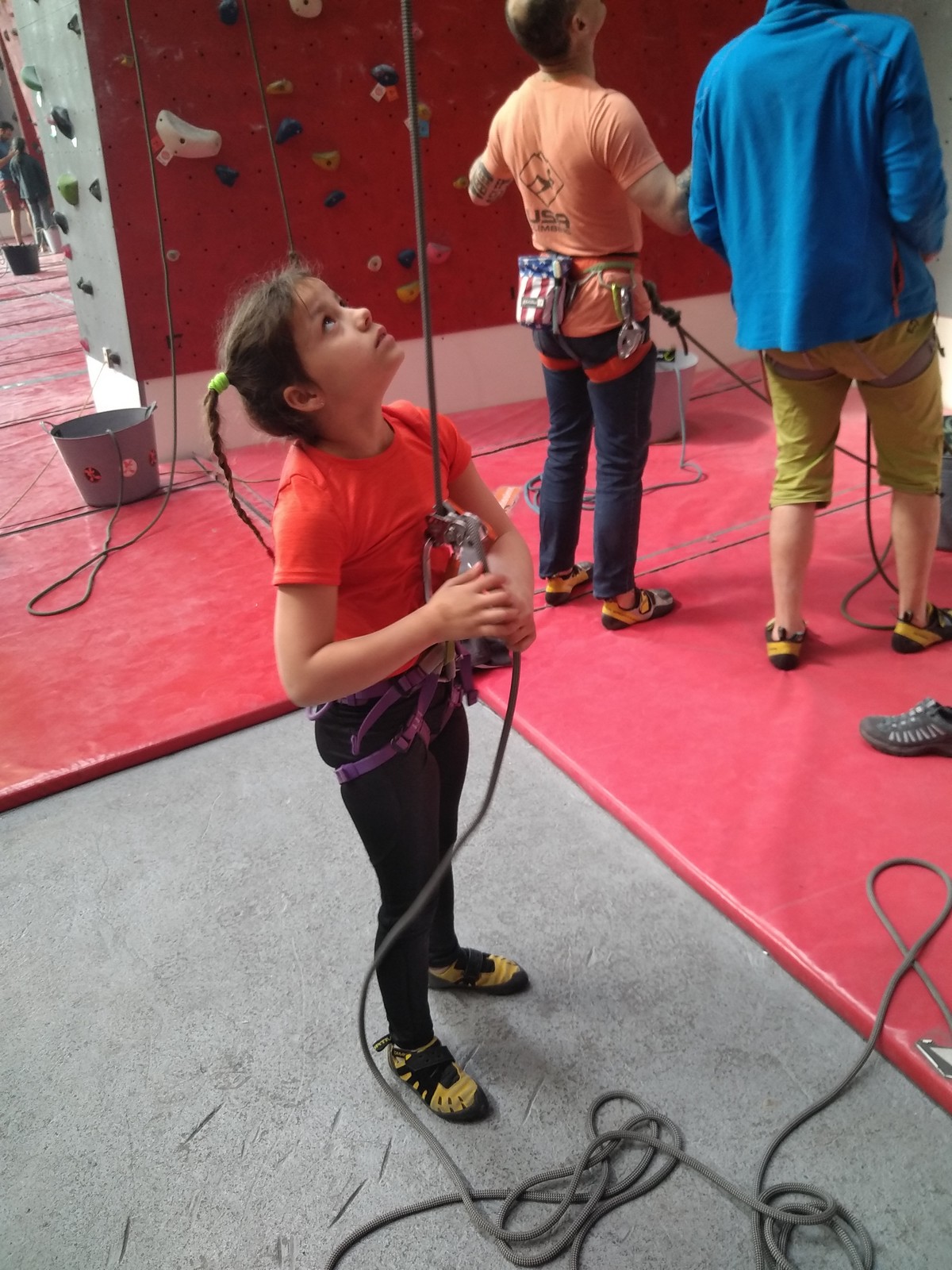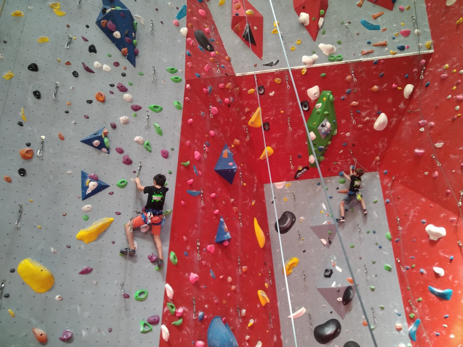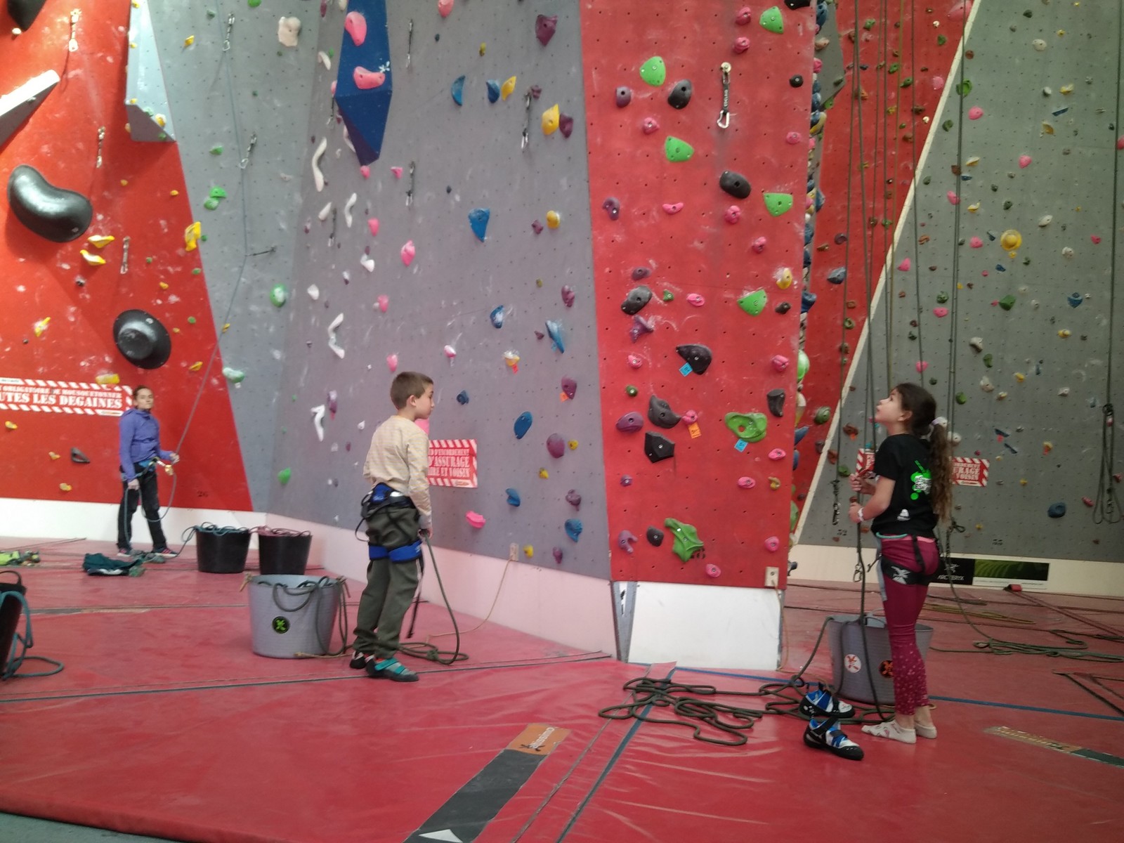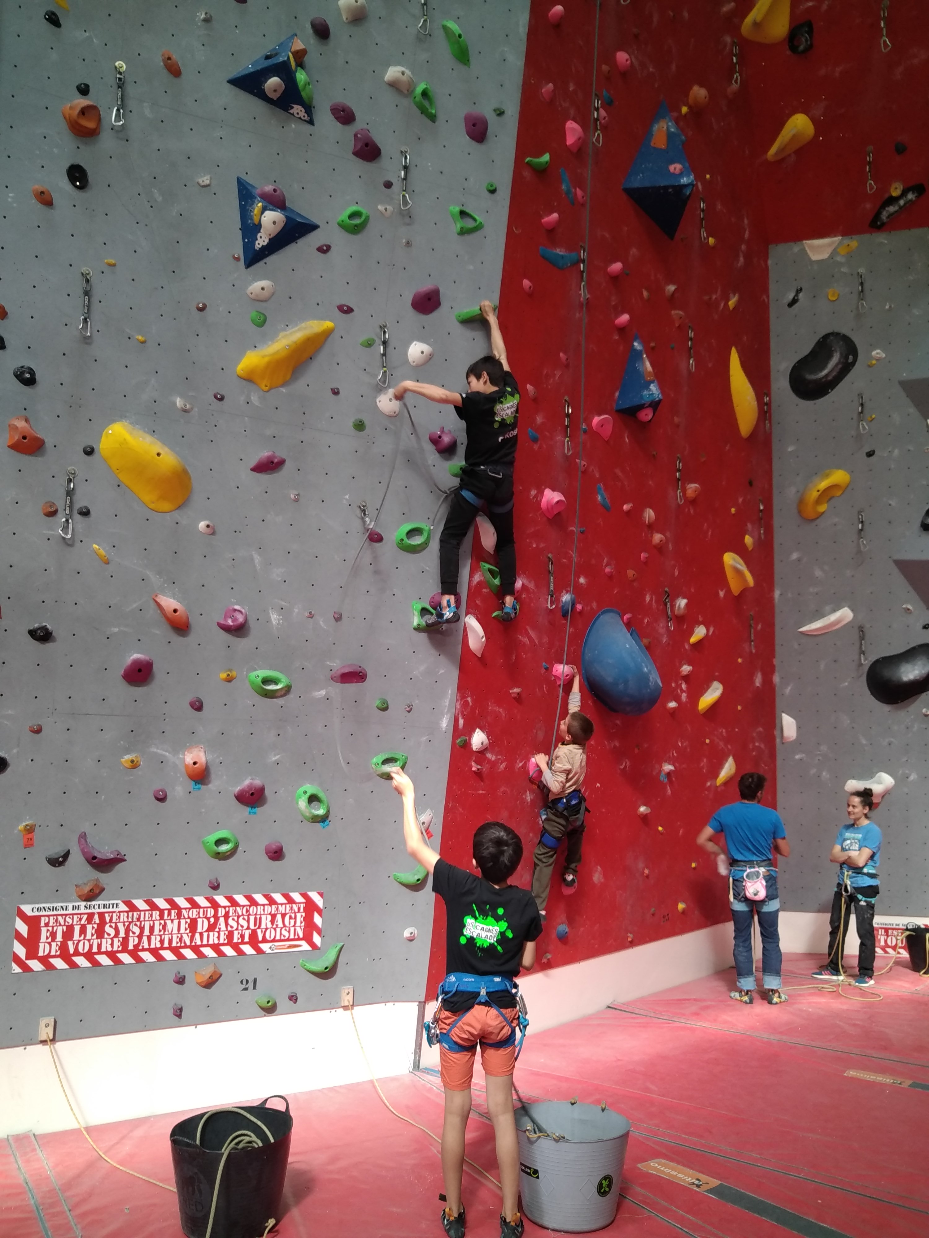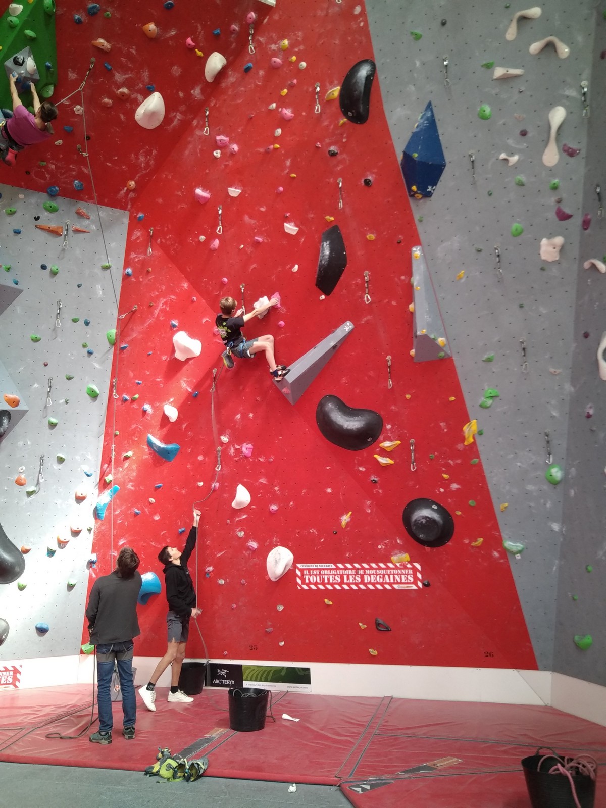 Chez les plus petits, ça se bagarre un cran en dessous. Leur écart de niveau entre l’escalade en tête et en moulinette est encore important car ils manquent d’expérience. Je les fais alterner entre pas trop dur en tête et dur en moulinette. Ils apprennent de leurs erreurs et progressent bien.