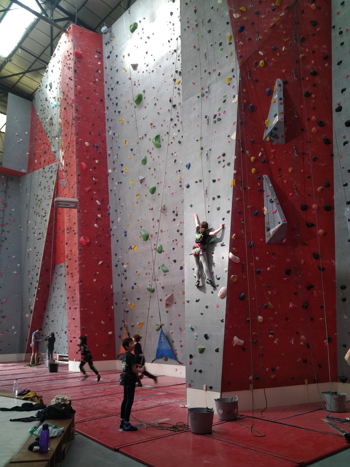 Les grands ne sont pas en reste et ça bagarre fort dans les 7b/+. Mathis tente même jusqu’à 7c+ dans le grand penché. Léane et Hanaé expérimentent également dans ce niveau. Dur pour elles dès que le mur se raidit. Mais elles se battent bien au jeu des petites prises dans du pas trop raide. Va falloir bosser un peu le physique.