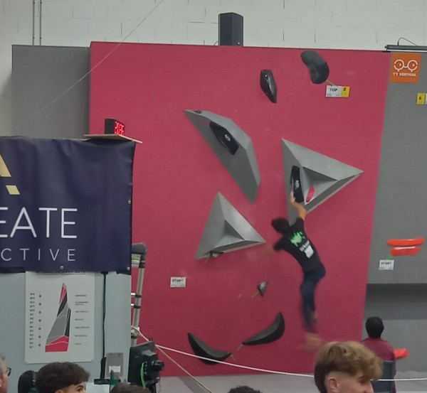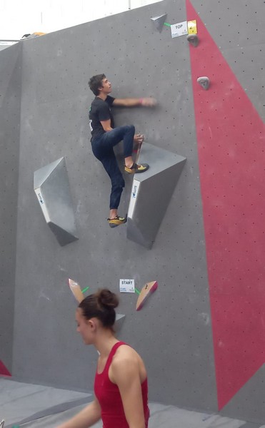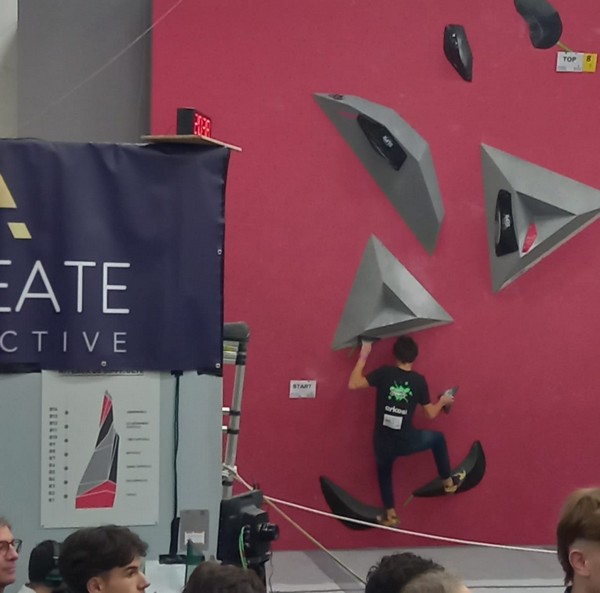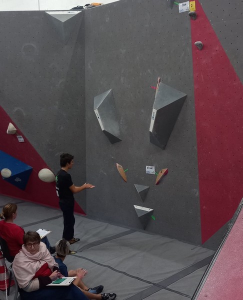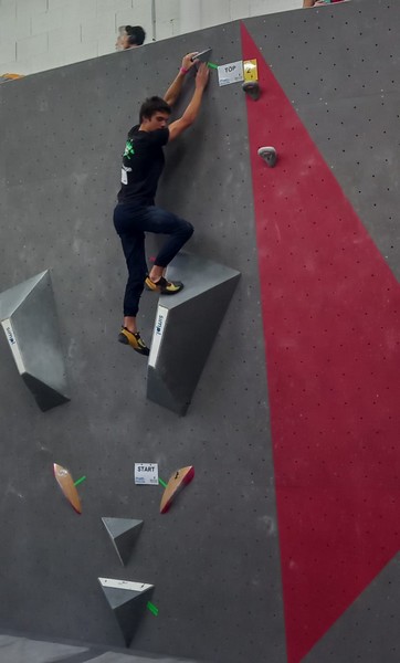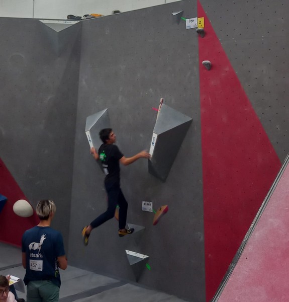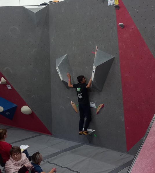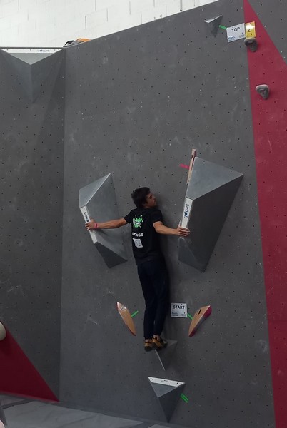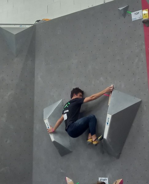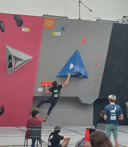 Mathis est donc le seul représentant du club à grimper le samedi. Au programme 9 blocs avec 5 essais par bloc. A première vue la lecture des blocs ne l’enchante pas, avec beaucoup de dalles, ce qui n’est pas son profil préféré. Son début de compétition est plutôt difficile, il lâche 5 essais avant de venir à bout du bloc 2, et mettra 3 essais pour toper le bloc 3. Mais il parvient à se reprendre et finit plutôt bien la compétition, en flashant 2 autres blocs et validant une zone supplémentaire. Il se classe 35ème chez les U20 garçons.