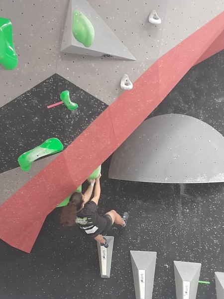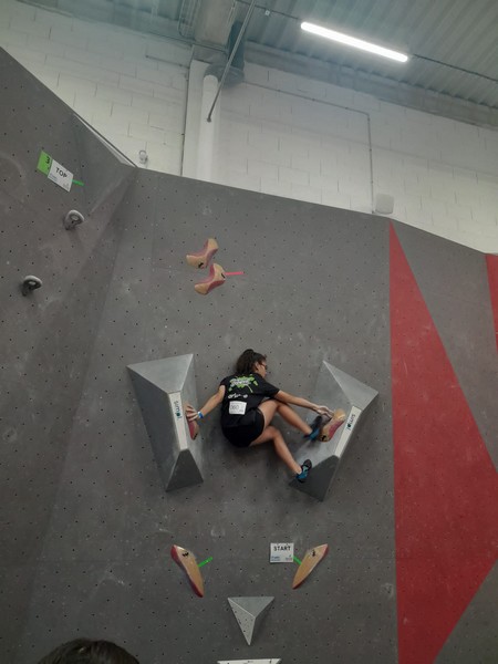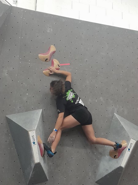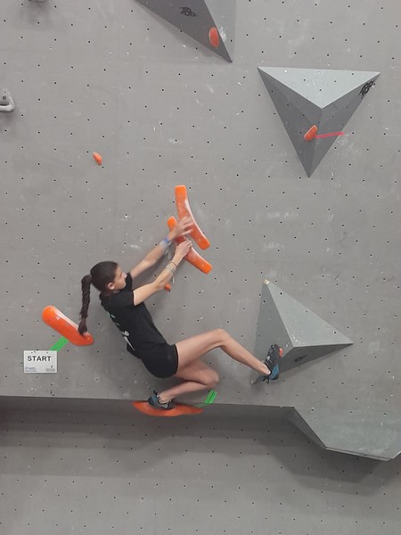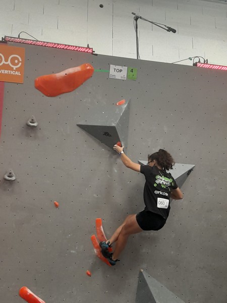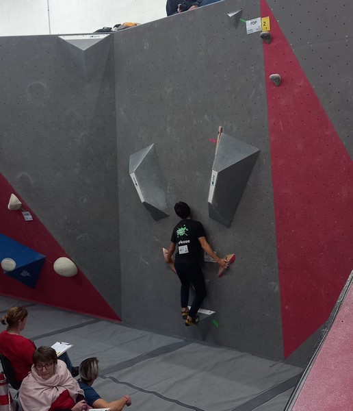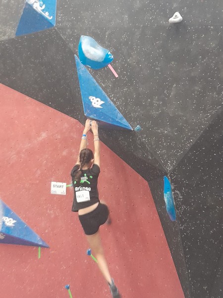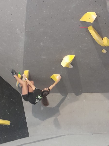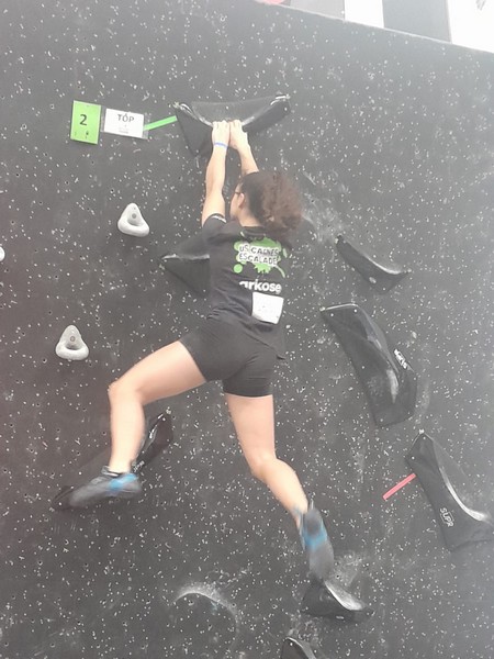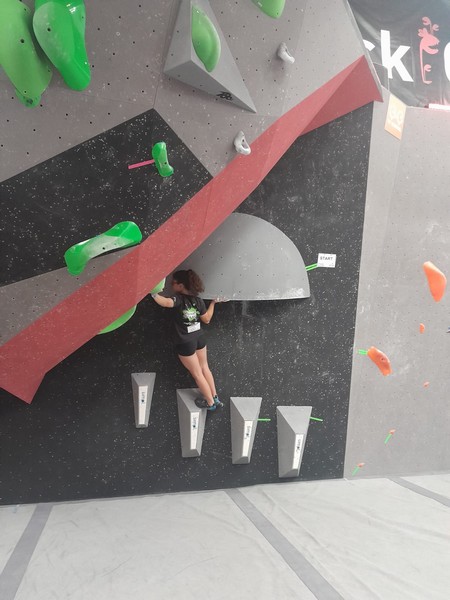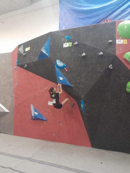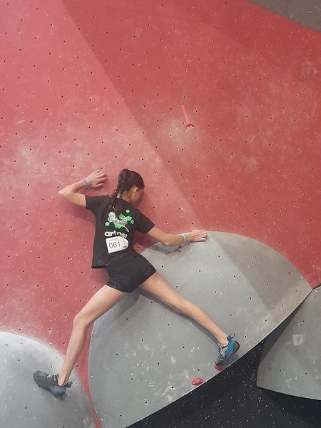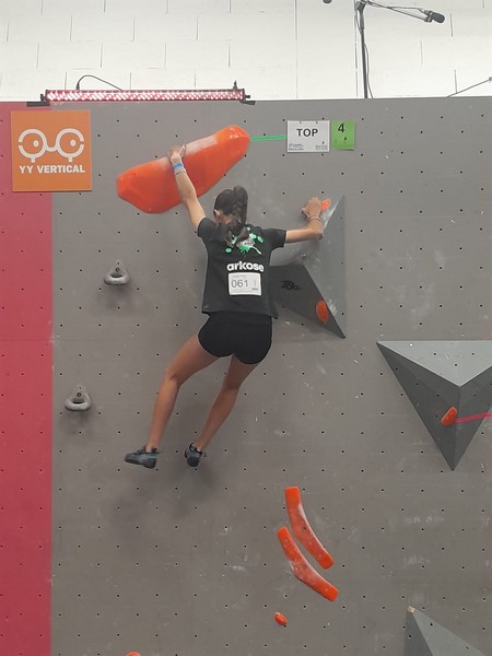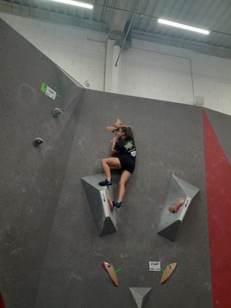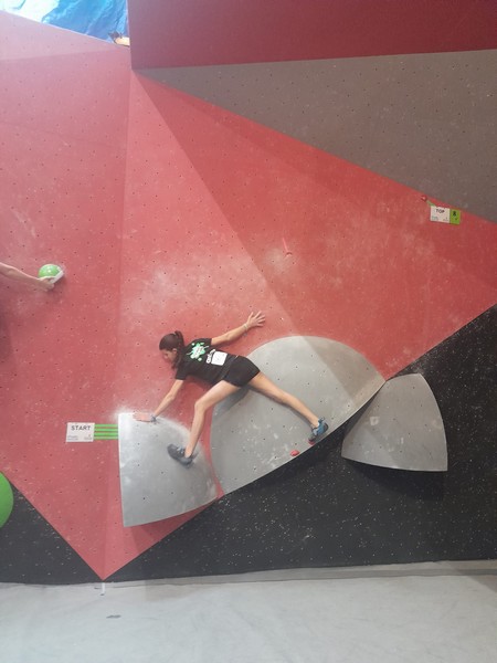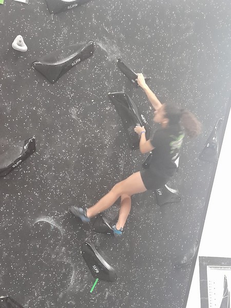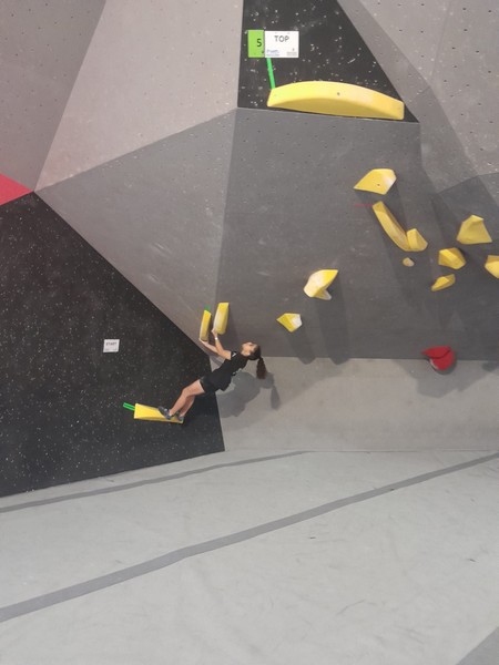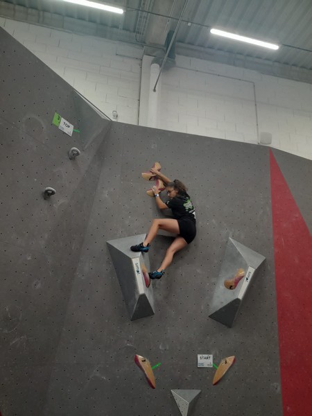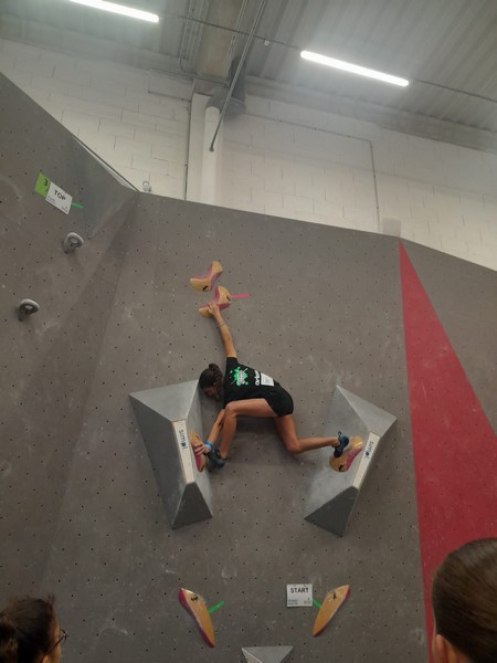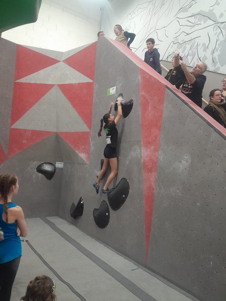 Efficace, Hanaé flashe les 4 premiers blocs. Elle parvient également à valider en quelques essais la zone du bloc 6 avec un jeté au départ et celle du bloc 8 en équilibre sur de gros volumes. Avec 4 blocs et 6 zones, elle se classe 28ème de cette étape de coupe de France.