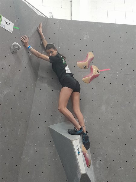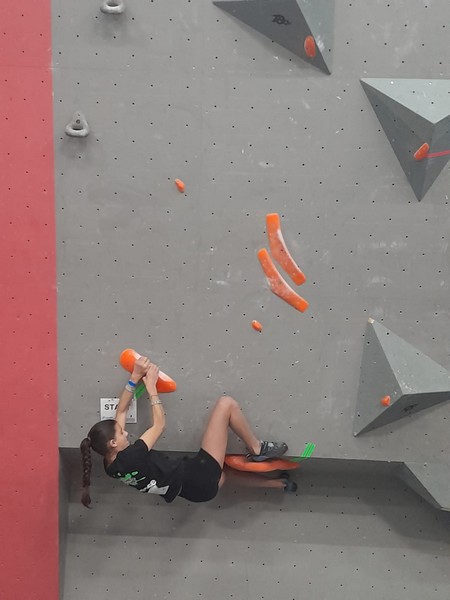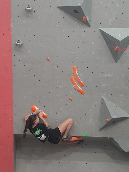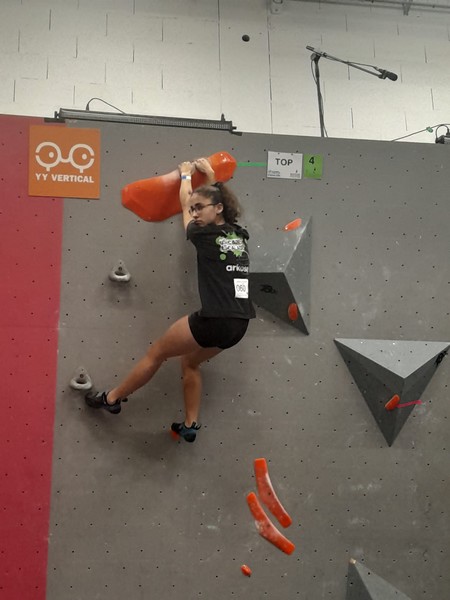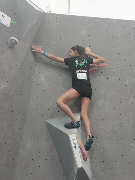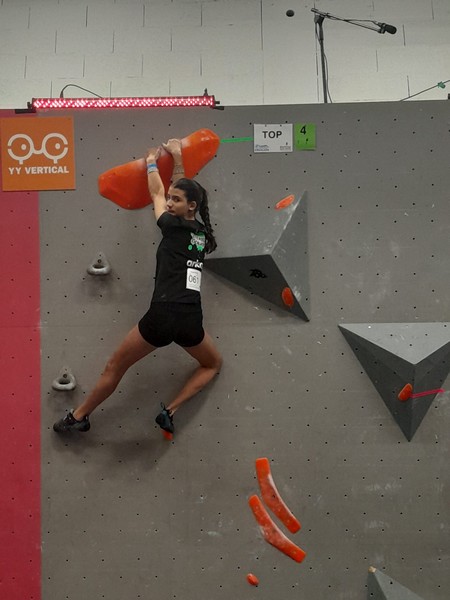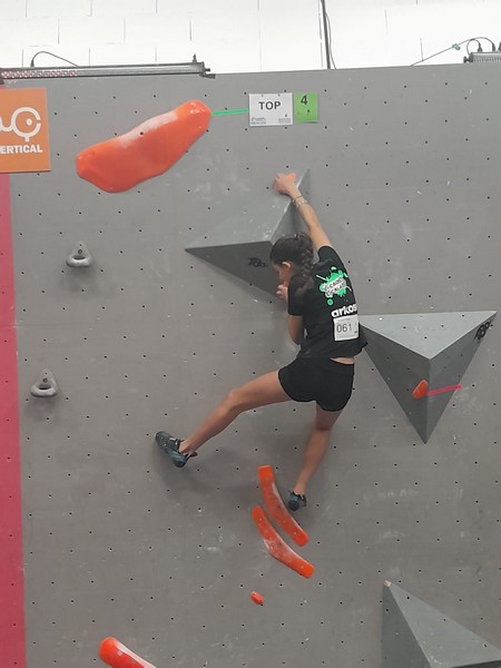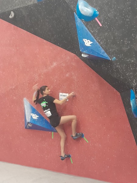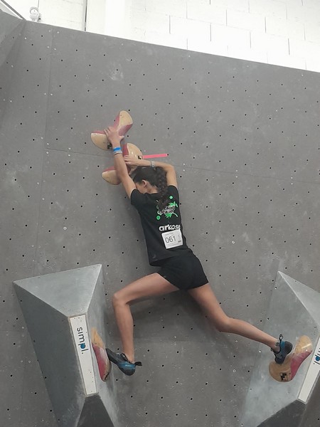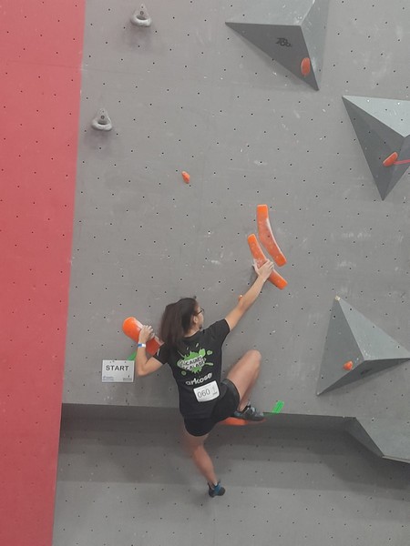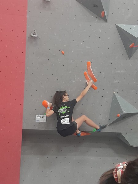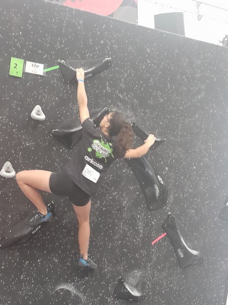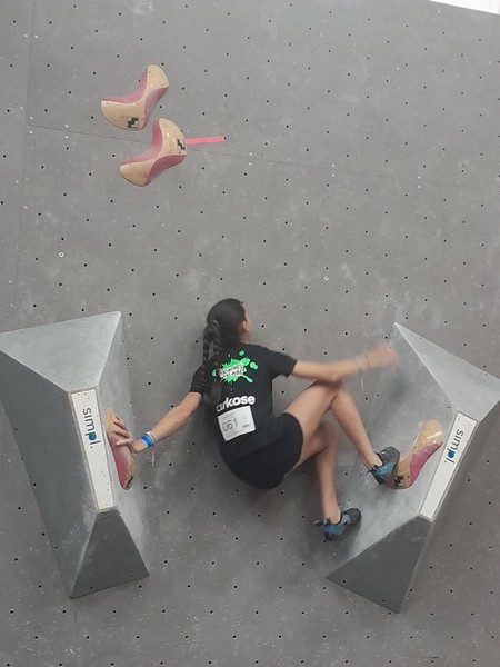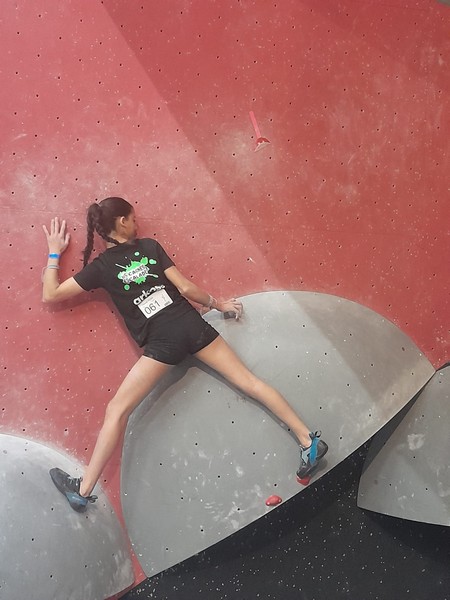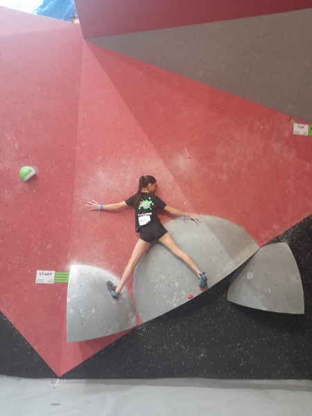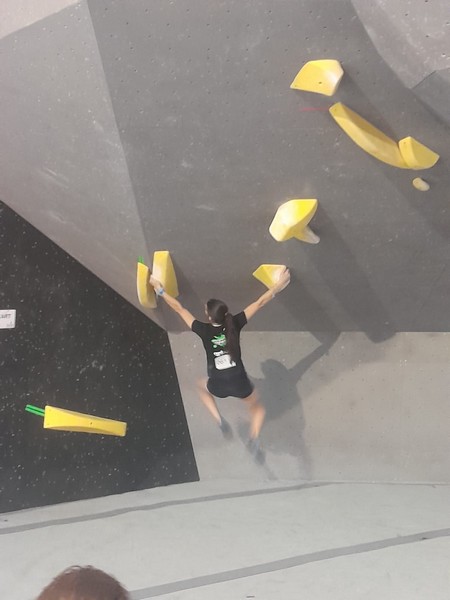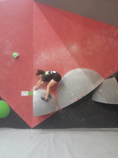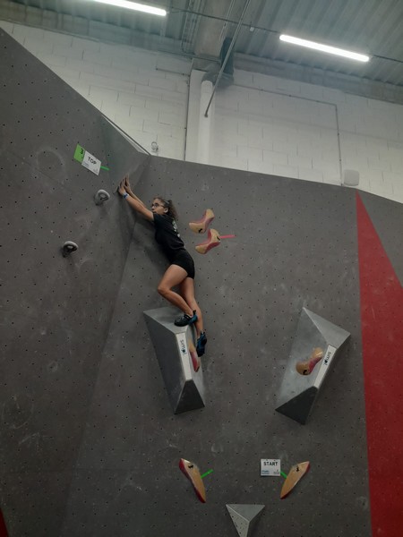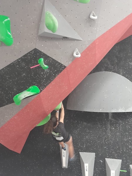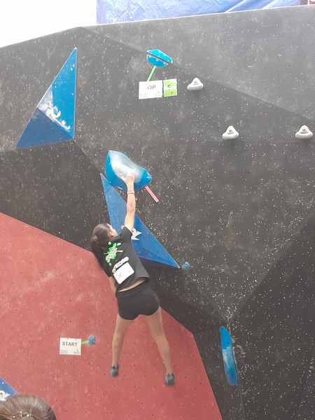 Efficace, Hanaé flashe les 4 premiers blocs. Elle parvient également à valider en quelques essais la zone du bloc 6 avec un jeté au départ et celle du bloc 8 en équilibre sur de gros volumes. Avec 4 blocs et 6 zones, elle se classe 28ème de cette étape de coupe de France.