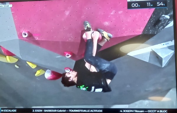 Léane coche également les 4 premiers blocs, en lâchant un essai pour avoir dépassé un scotch noir dans le bloc 2 et un autre dans le bloc 3. Petit manque de concentration sans doute en ce début de compétition. La jolie coordo du bloc 9 semble en revanche l’inspirer, puisqu’elle parviendra à flasher ce bloc à son premier essai, ce qu’elles ne seront que deux à réaliser. Elle valide également la zone du bloc 8 au premier essai, mais ne parvient pas à caler le premier mouv du bloc 6, préférant s’acharner dans le bloc 5 très physique et un peu morpho, sans succès. Qu’à cela ne tienne, avec ses 5 blocs et 6 zones, elle rentre dans le top 20, en accrochant la 19ème place.