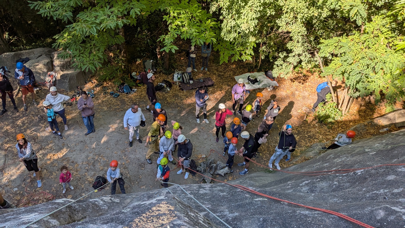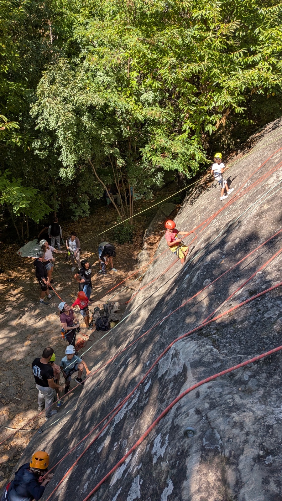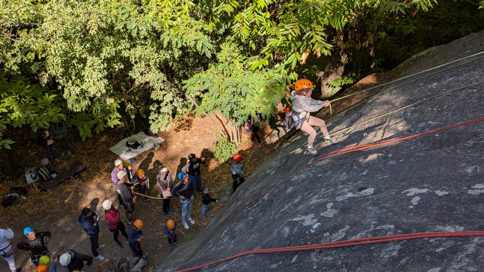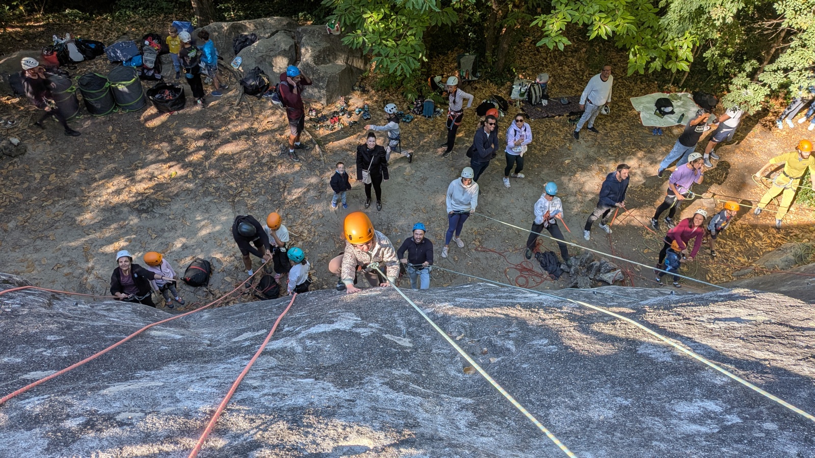 Il est neuf heure et la journée s’annonce intense, presque 90 personnes sont attendues ! Par bonheur, les renforts sont nombreux, Aude, Milo, Dona, Nico, Djé, Julien et Romain sont présents pour acheminer le matériel nécessaire au pied du secteur. La suite consiste à installer l’intégralité des voies d’une corde afin que chacun puisse s’occuper et ainsi pleinement profiter de sa journée. Là encore l’équipe est bien rodée et, malgré quelques questionnement, la falaise est rapidement décorée de brins de cordes roses, rouges ou verts.
