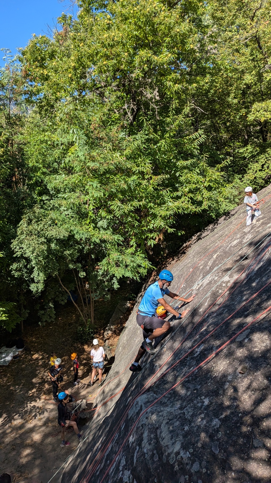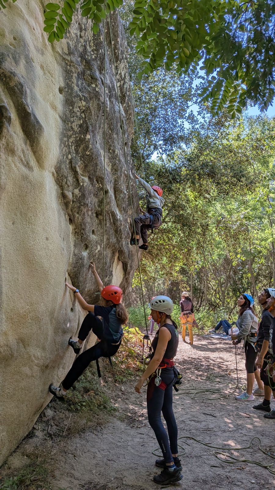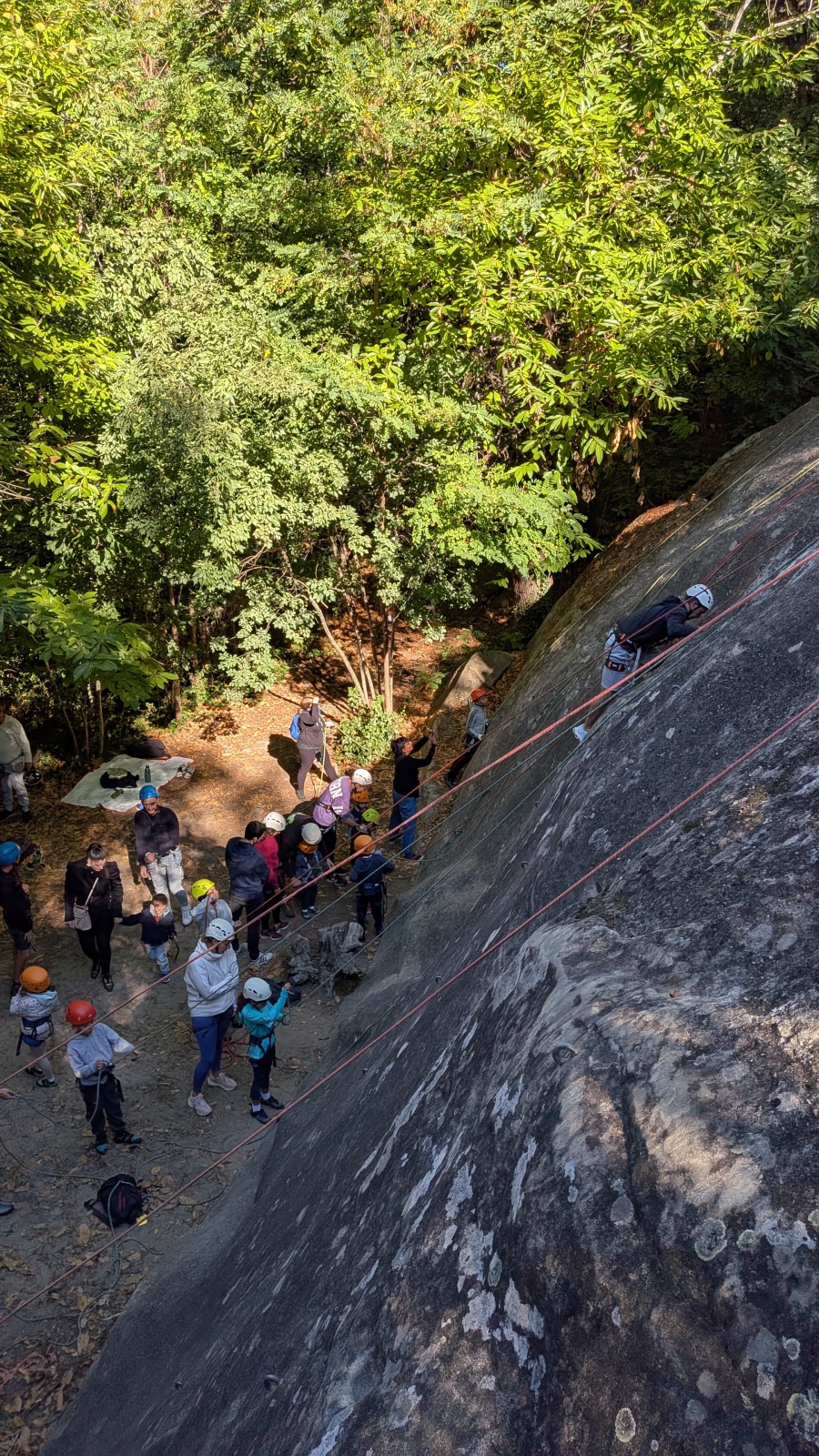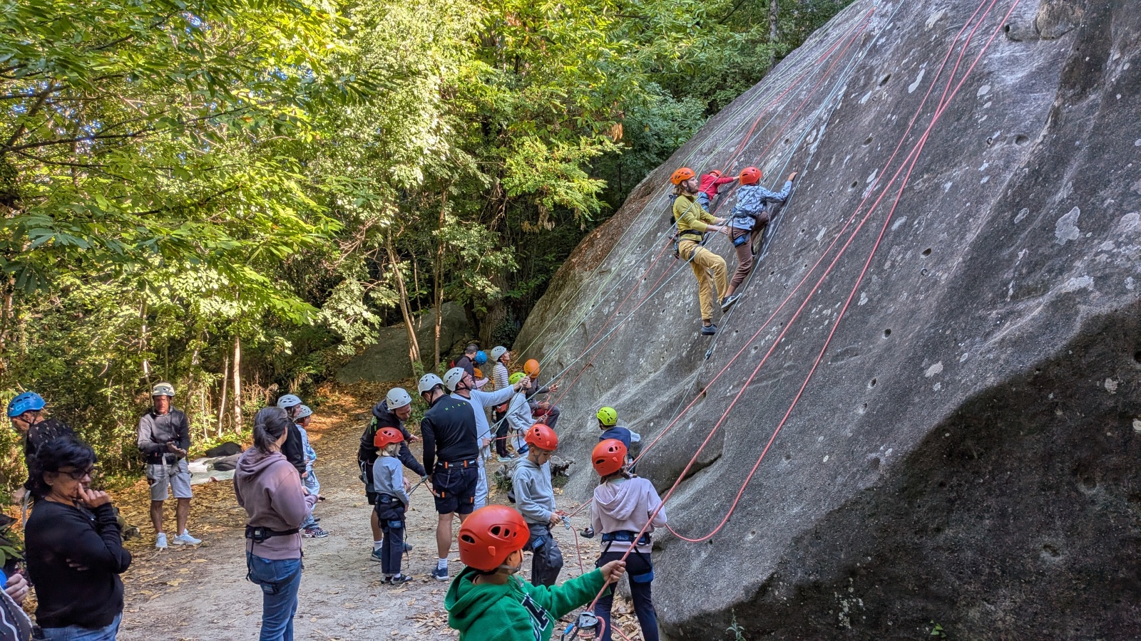 Il est neuf heure et la journée s’annonce intense, presque 90 personnes sont attendues ! Par bonheur, les renforts sont nombreux, Aude, Milo, Dona, Nico, Djé, Julien et Romain sont présents pour acheminer le matériel nécessaire au pied du secteur. La suite consiste à installer l’intégralité des voies d’une corde afin que chacun puisse s’occuper et ainsi pleinement profiter de sa journée. Là encore l’équipe est bien rodée et, malgré quelques questionnement, la falaise est rapidement décorée de brins de cordes roses, rouges ou verts.