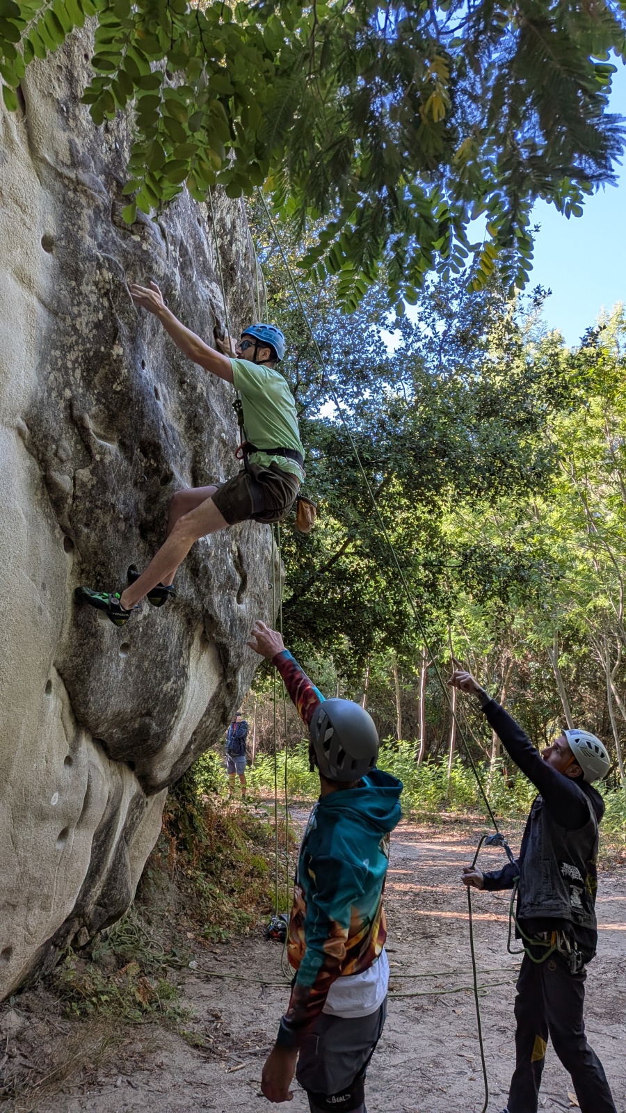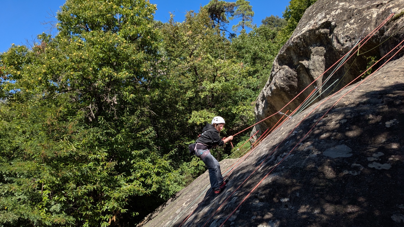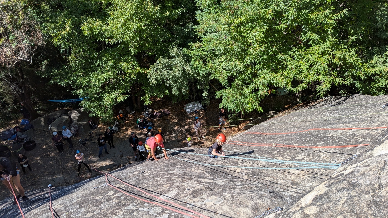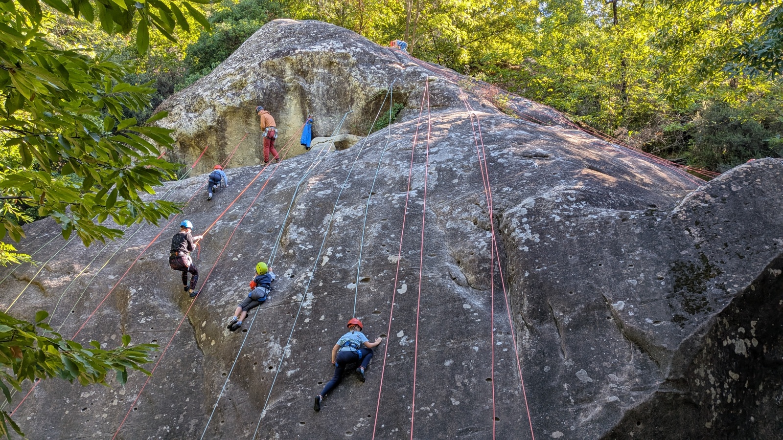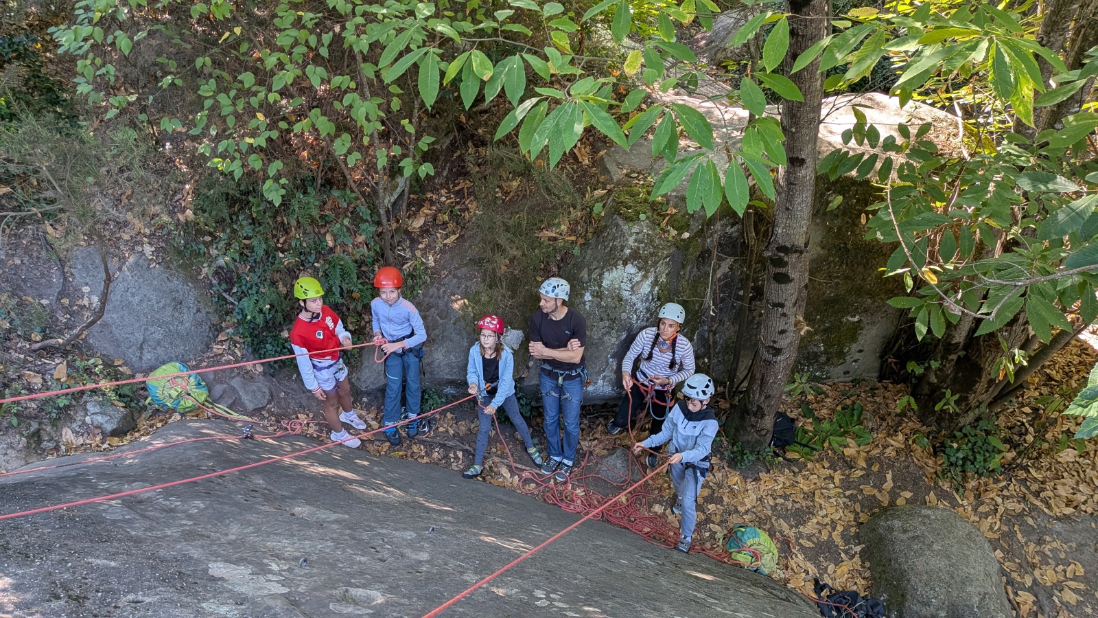 Il est neuf heure et la journée s’annonce intense, presque 90 personnes sont attendues ! Par bonheur, les renforts sont nombreux, Aude, Milo, Dona, Nico, Djé, Julien et Romain sont présents pour acheminer le matériel nécessaire au pied du secteur. La suite consiste à installer l’intégralité des voies d’une corde afin que chacun puisse s’occuper et ainsi pleinement profiter de sa journée. Là encore l’équipe est bien rodée et, malgré quelques questionnement, la falaise est rapidement décorée de brins de cordes roses, rouges ou verts.