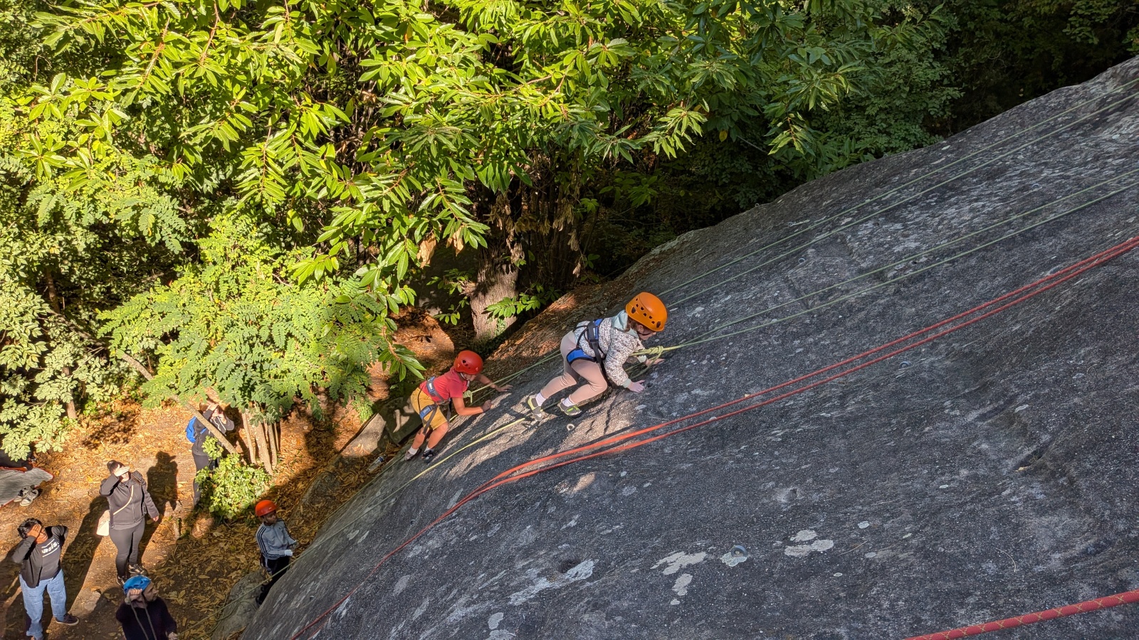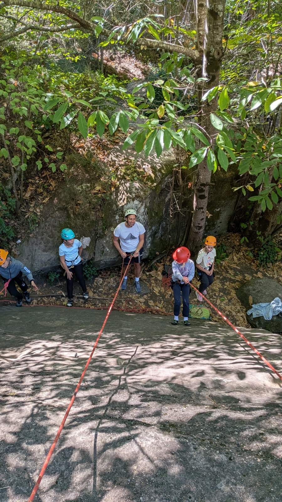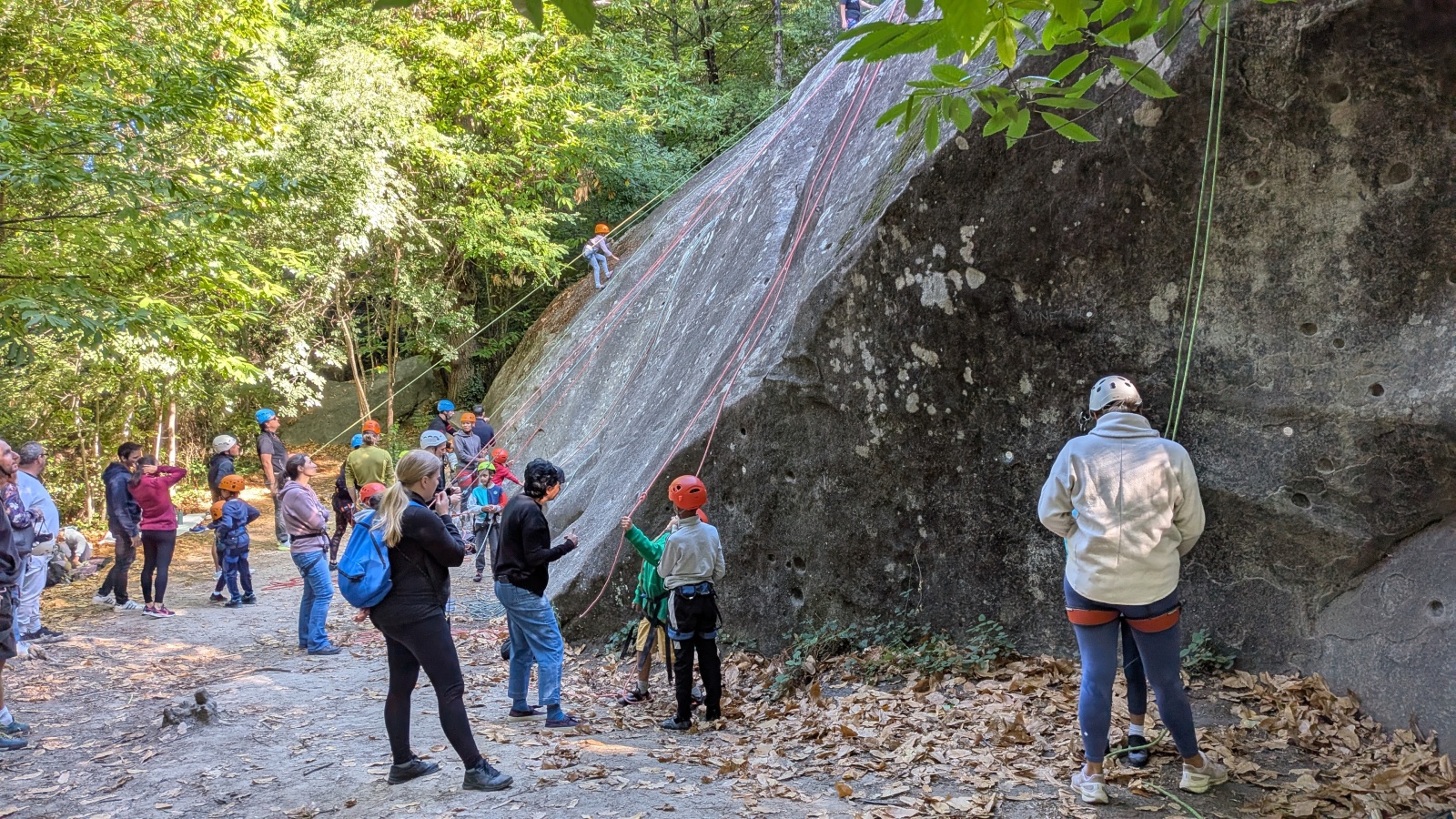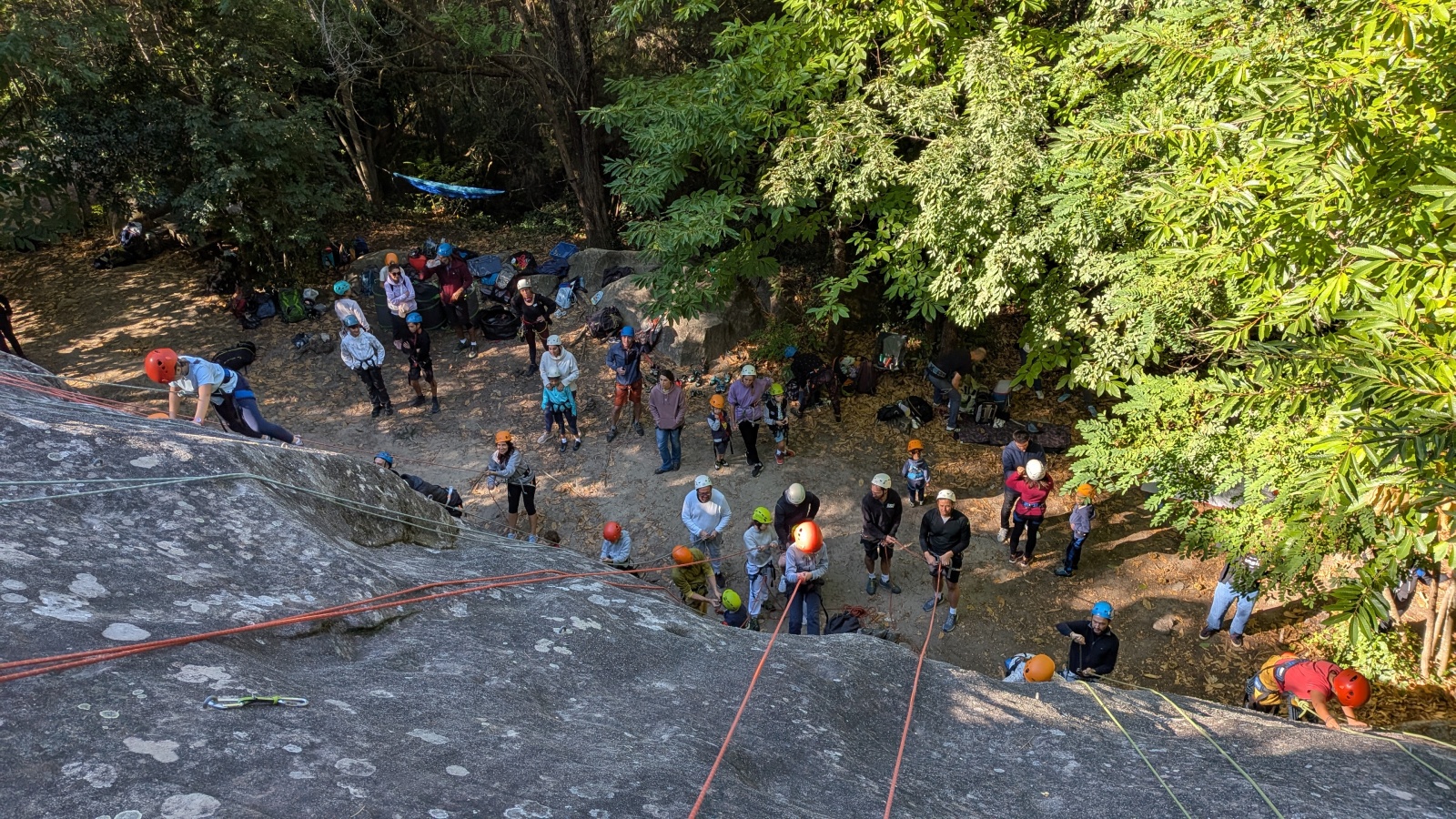 Il est neuf heure et la journée s’annonce intense, presque 90 personnes sont attendues ! Par bonheur, les renforts sont nombreux, Aude, Milo, Dona, Nico, Djé, Julien et Romain sont présents pour acheminer le matériel nécessaire au pied du secteur. La suite consiste à installer l’intégralité des voies d’une corde afin que chacun puisse s’occuper et ainsi pleinement profiter de sa journée. Là encore l’équipe est bien rodée et, malgré quelques questionnement, la falaise est rapidement décorée de brins de cordes roses, rouges ou verts.
