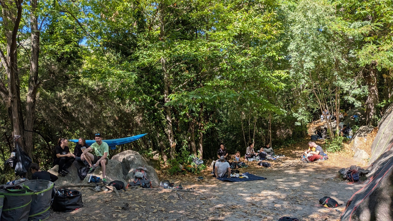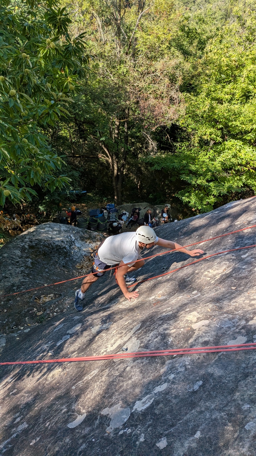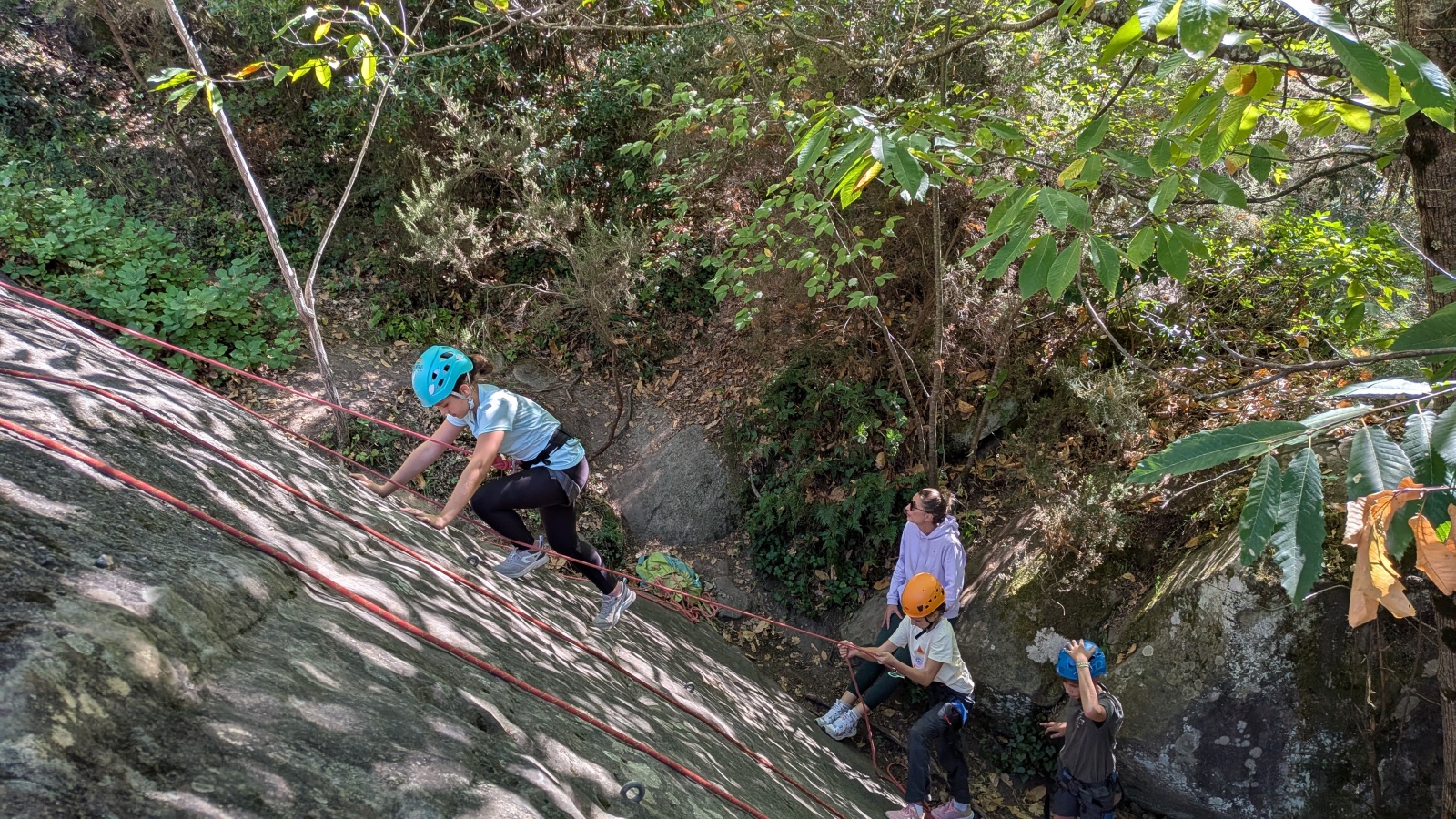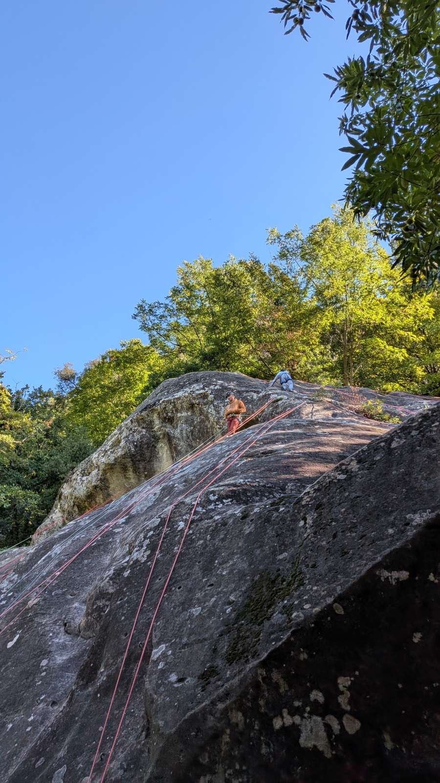 Il est neuf heure et la journée s’annonce intense, presque 90 personnes sont attendues ! Par bonheur, les renforts sont nombreux, Aude, Milo, Dona, Nico, Djé, Julien et Romain sont présents pour acheminer le matériel nécessaire au pied du secteur. La suite consiste à installer l’intégralité des voies d’une corde afin que chacun puisse s’occuper et ainsi pleinement profiter de sa journée. Là encore l’équipe est bien rodée et, malgré quelques questionnement, la falaise est rapidement décorée de brins de cordes roses, rouges ou verts.