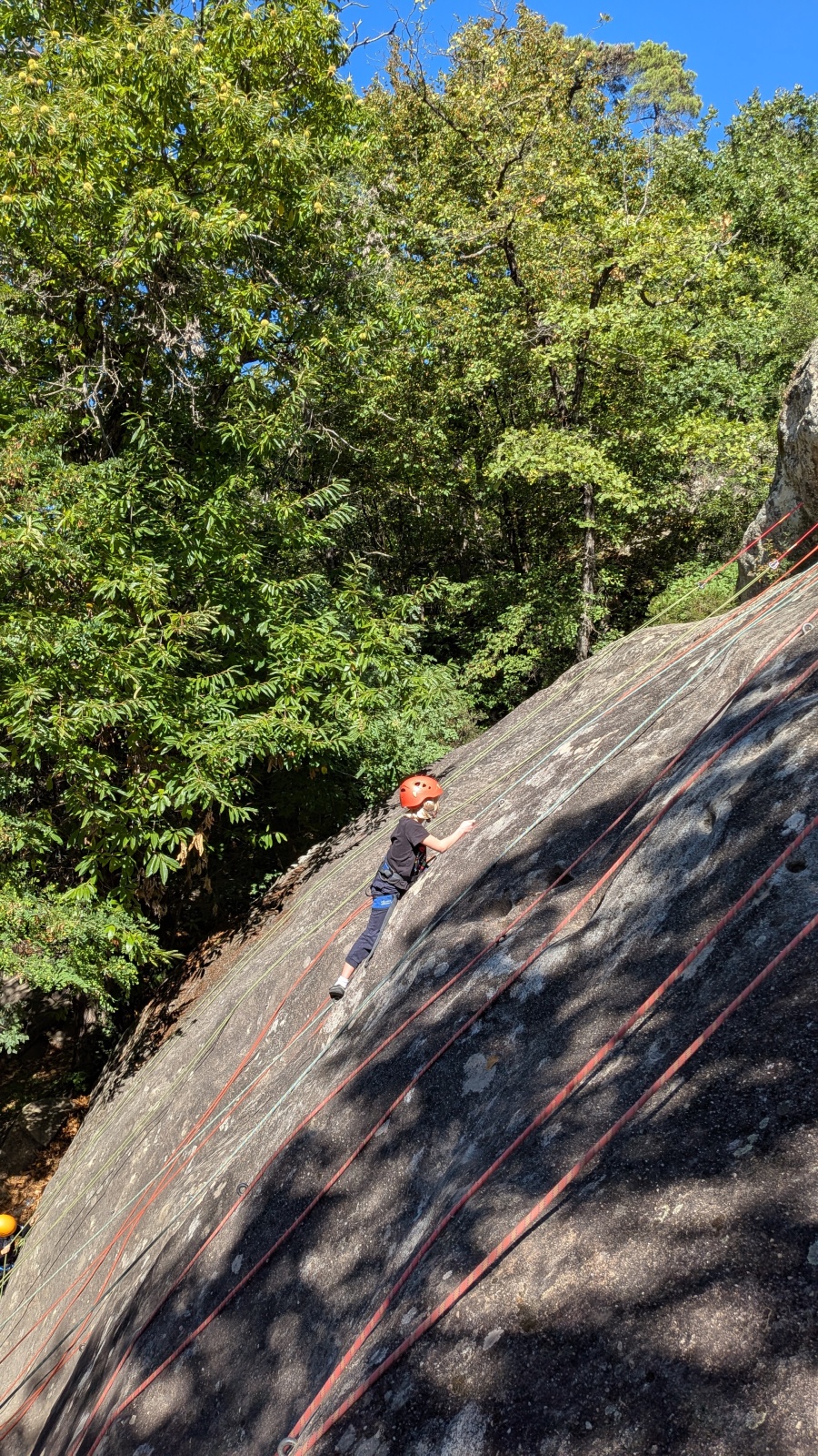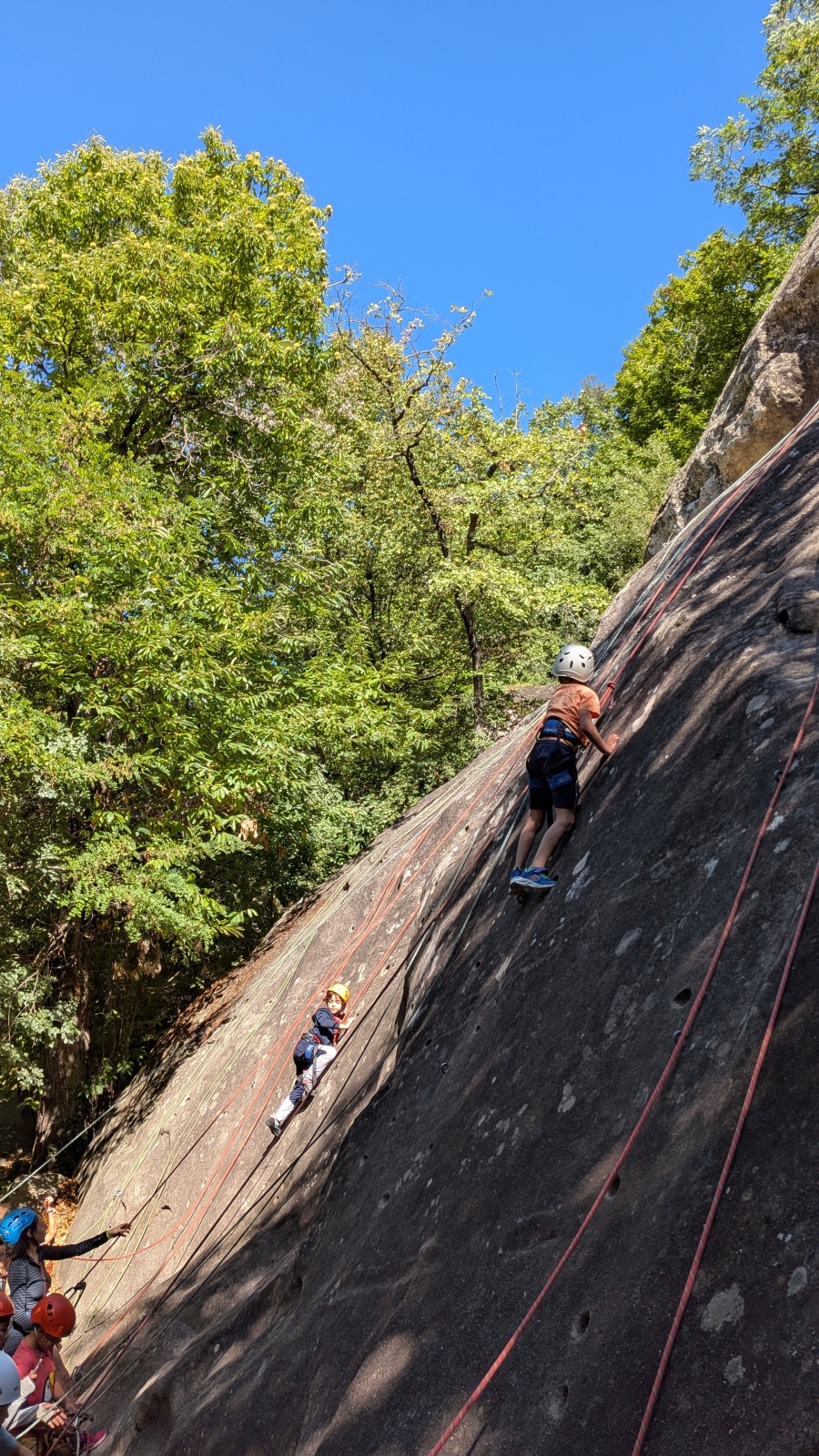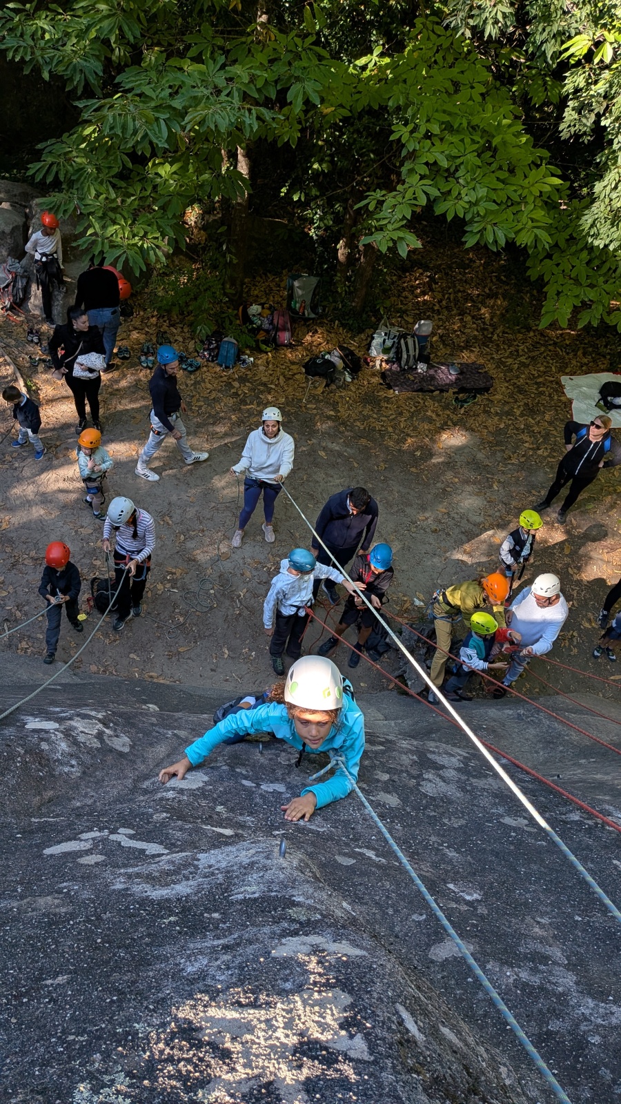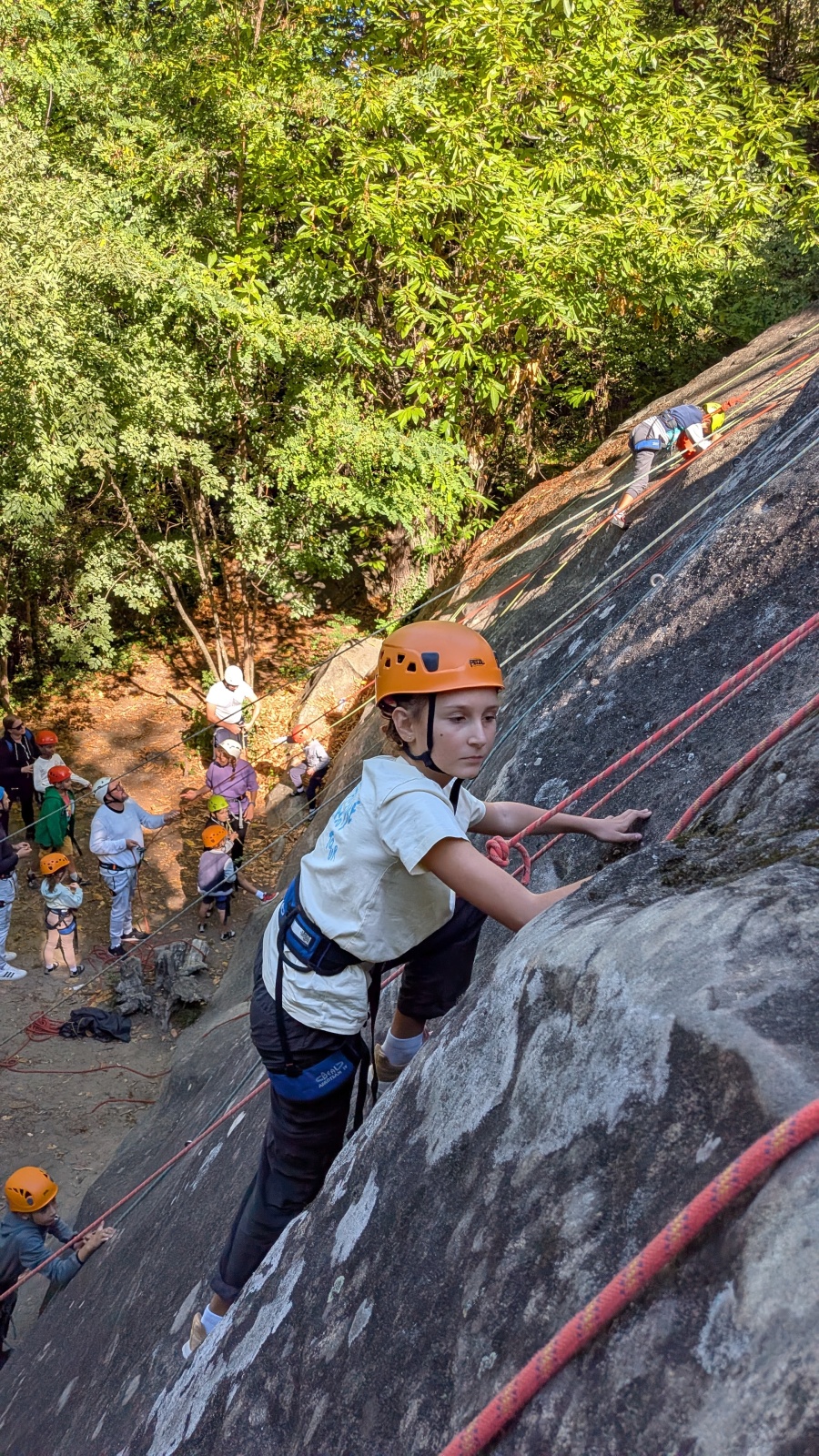 Stella, quelque peu impatiente ou intensément passionnée par la varrape, est la première à se remettre en route. Elle est rapidement suivi par une myriade de grimpeurs en herbe et notamment la petite Alice qui depuis le tout début de matinée grimpe avec frénésie tout ce qu’elle peut. Le papa me disait qu’ils étaient venus s’assurer qu’elle aimait l’escalade… Eh bien j’ai l’impression que la réponse est claire !