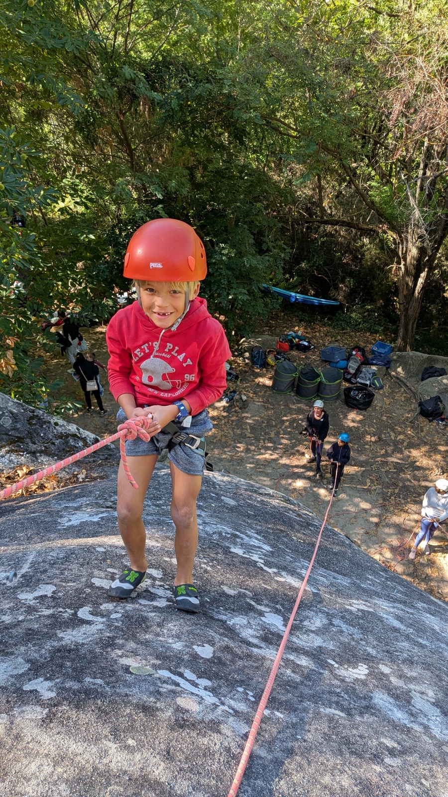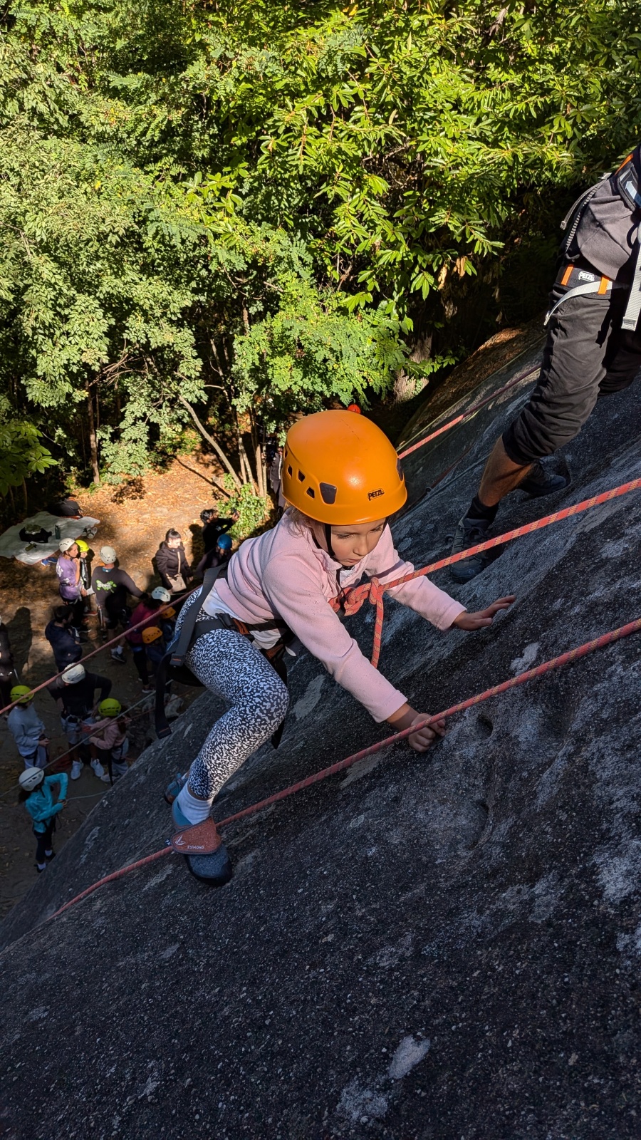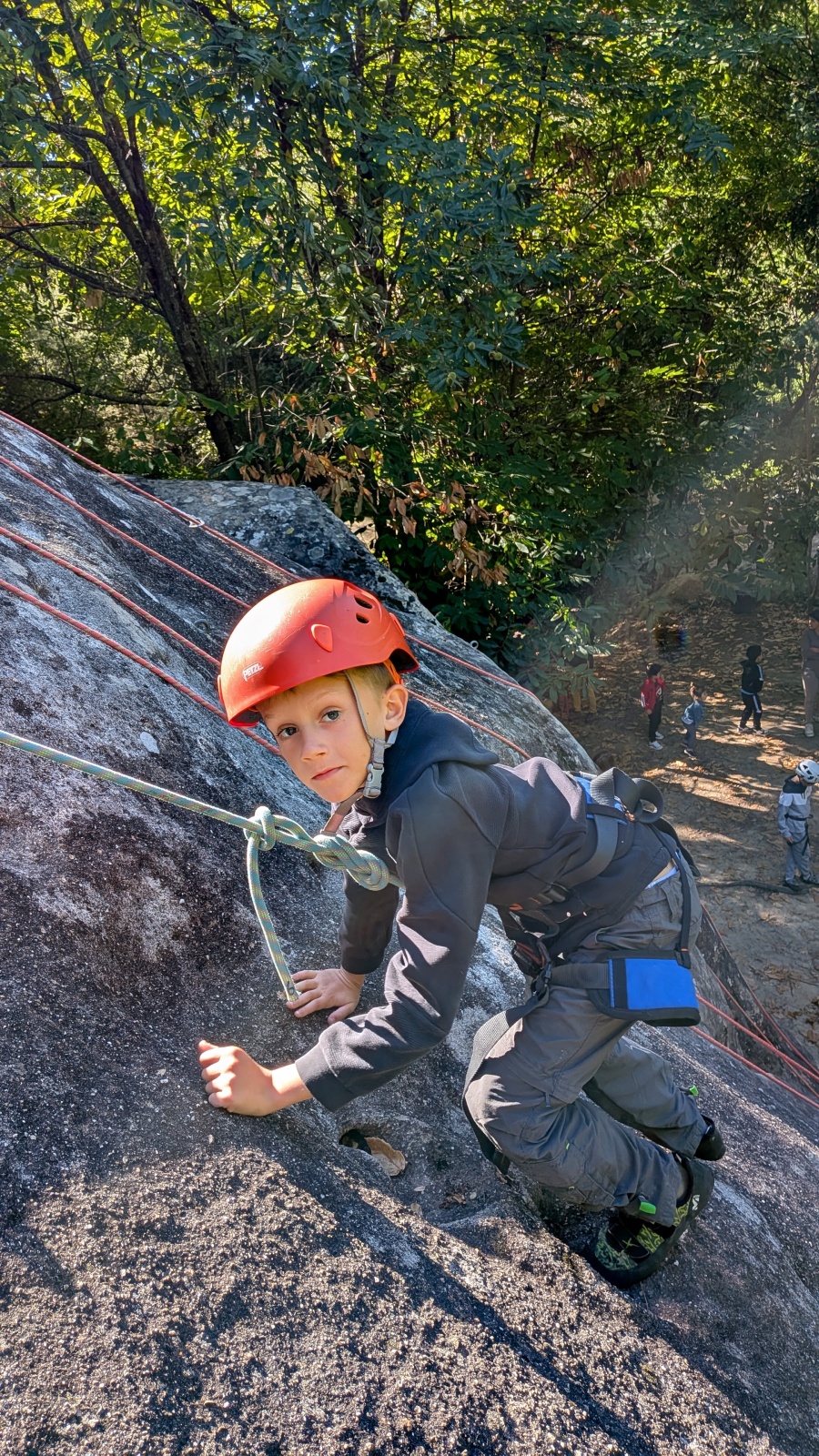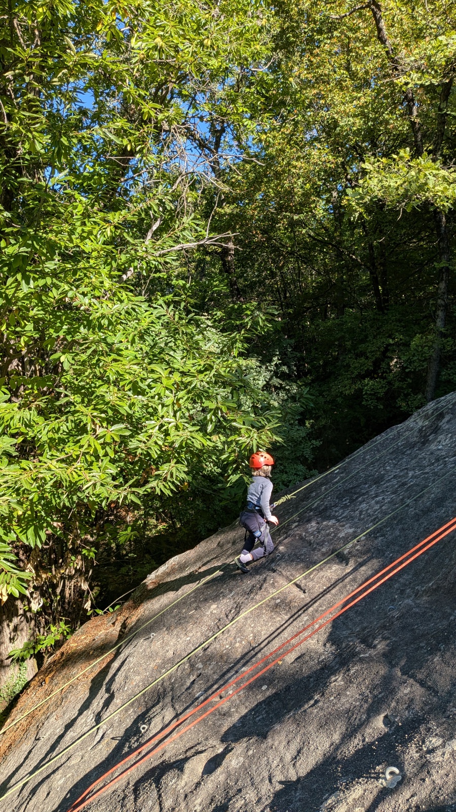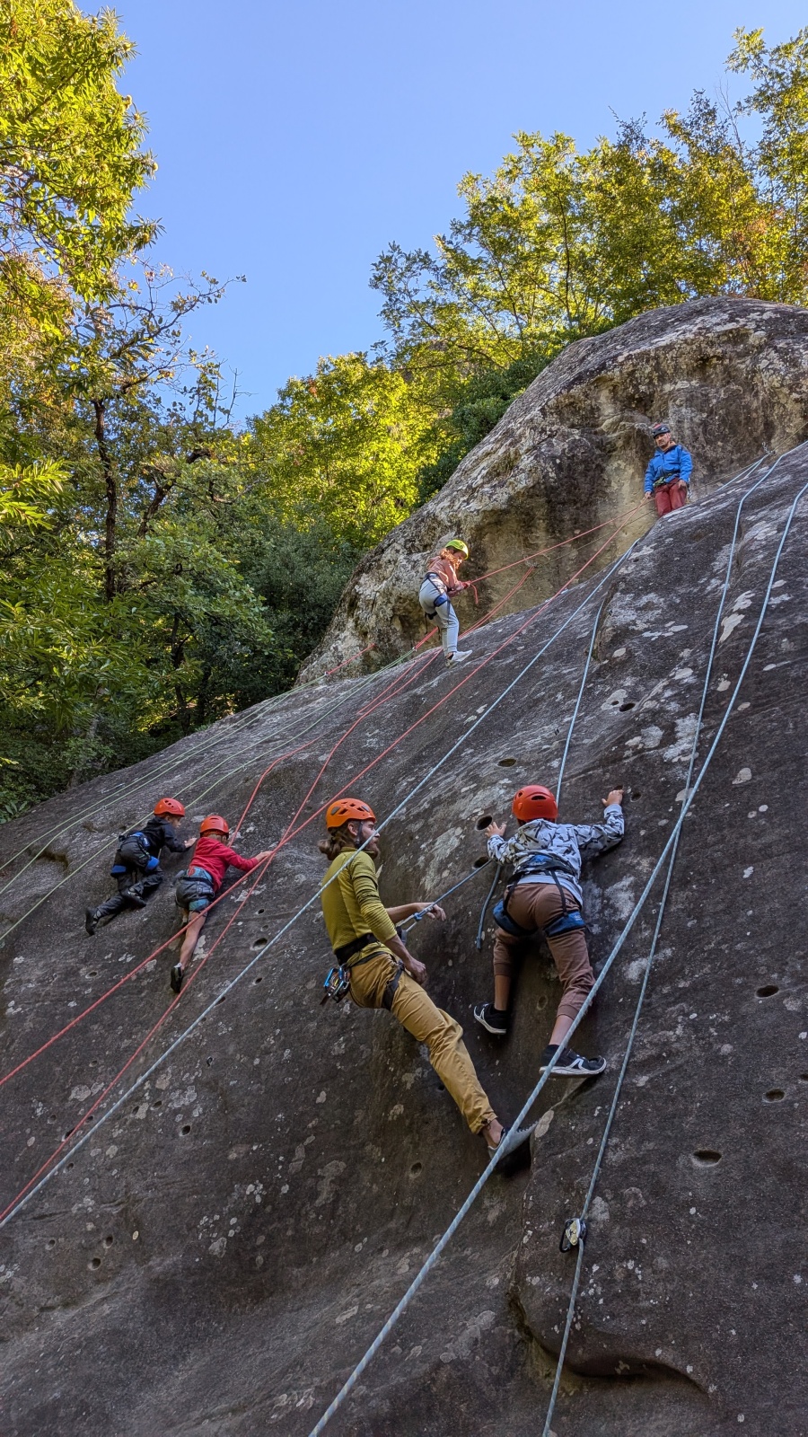 Stella, quelque peu impatiente ou intensément passionnée par la varrape, est la première à se remettre en route. Elle est rapidement suivi par une myriade de grimpeurs en herbe et notamment la petite Alice qui depuis le tout début de matinée grimpe avec frénésie tout ce qu’elle peut. Le papa me disait qu’ils étaient venus s’assurer qu’elle aimait l’escalade… Eh bien j’ai l’impression que la réponse est claire !