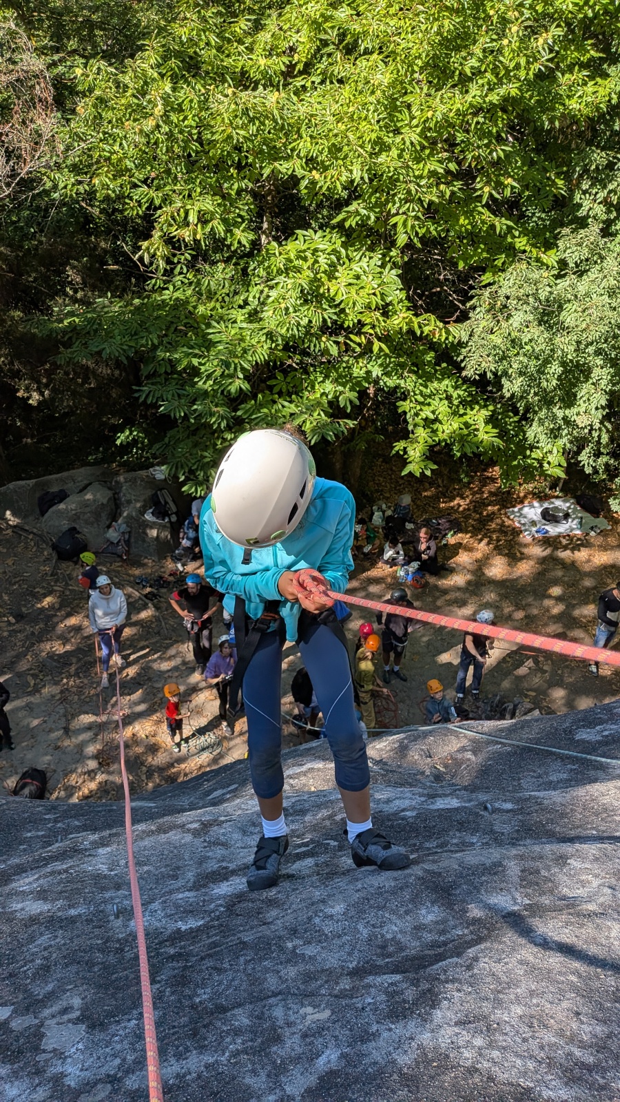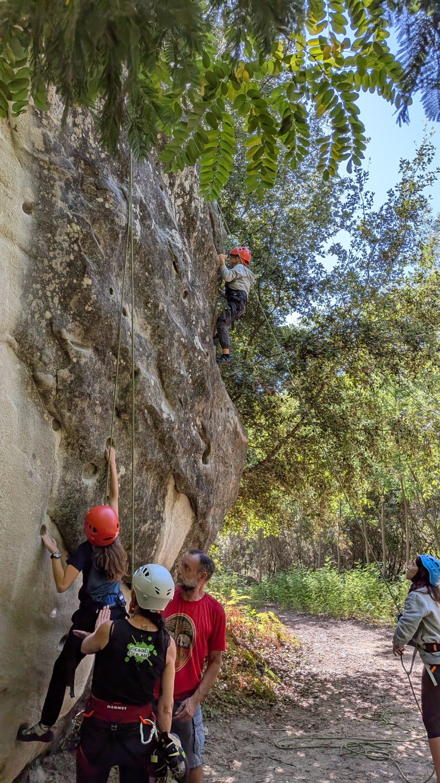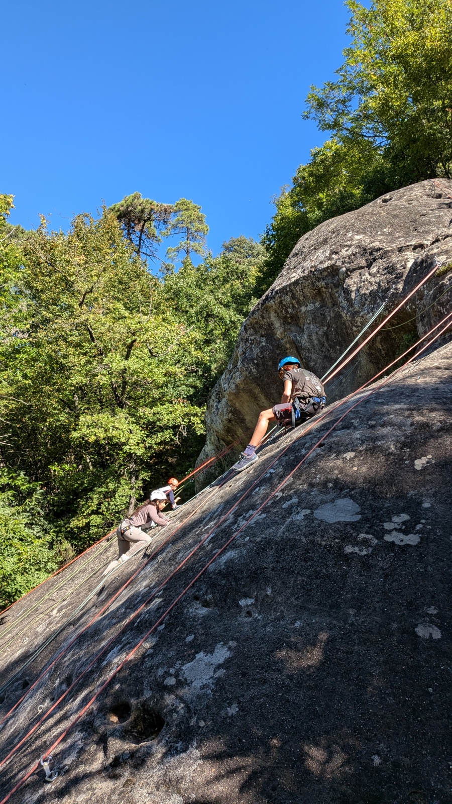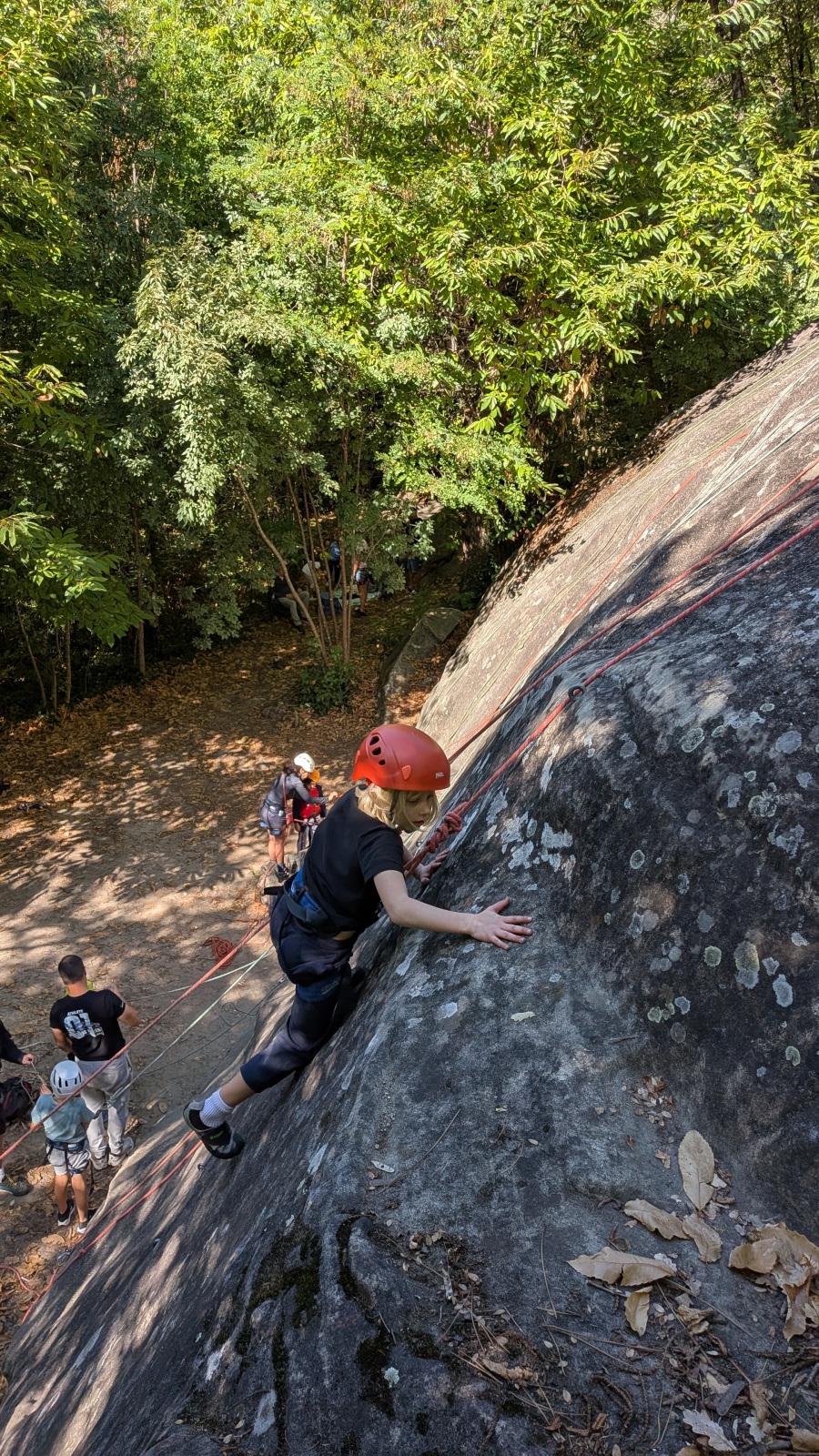 Stella, quelque peu impatiente ou intensément passionnée par la varrape, est la première à se remettre en route. Elle est rapidement suivi par une myriade de grimpeurs en herbe et notamment la petite Alice qui depuis le tout début de matinée grimpe avec frénésie tout ce qu’elle peut. Le papa me disait qu’ils étaient venus s’assurer qu’elle aimait l’escalade… Eh bien j’ai l’impression que la réponse est claire !
