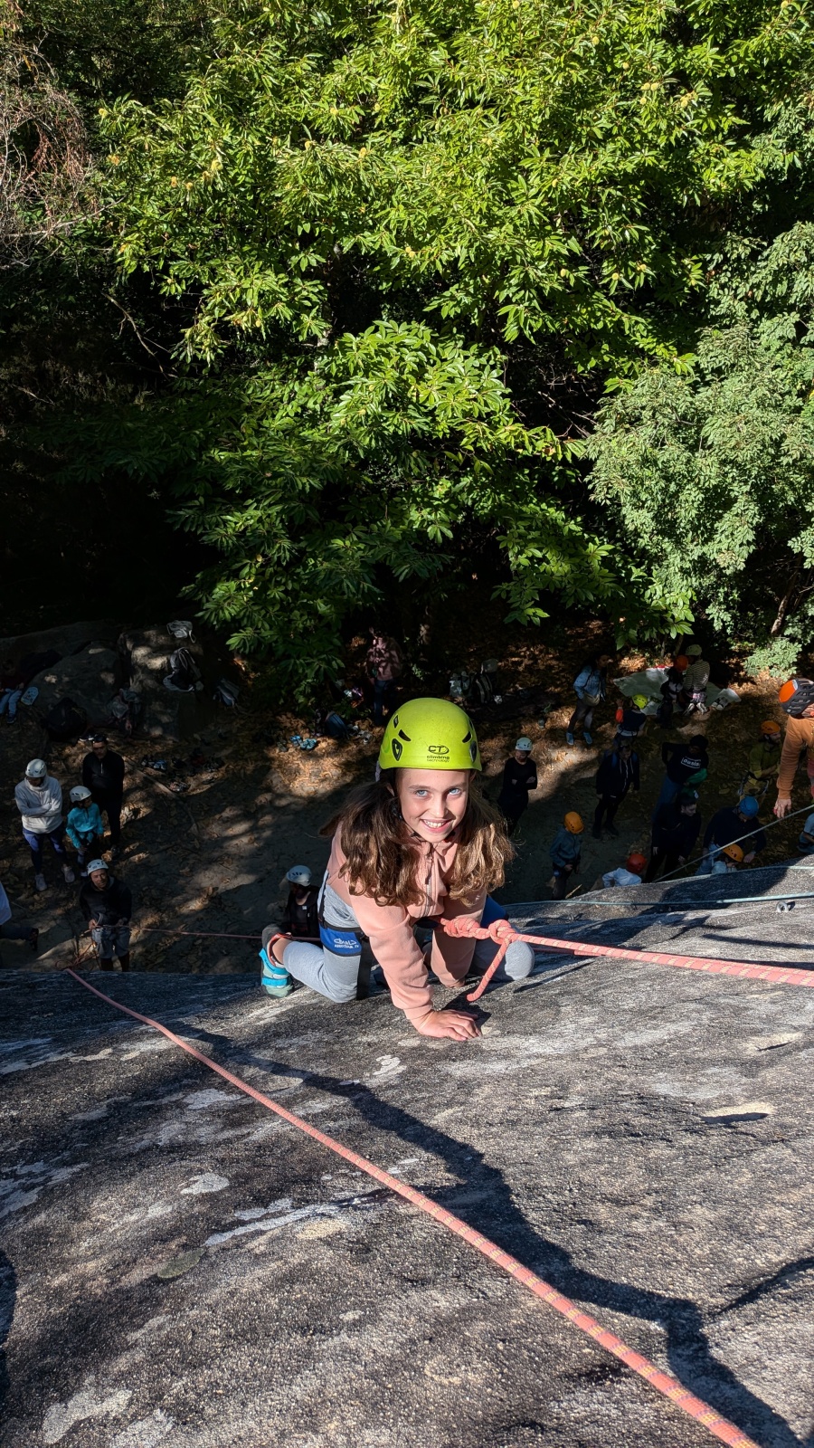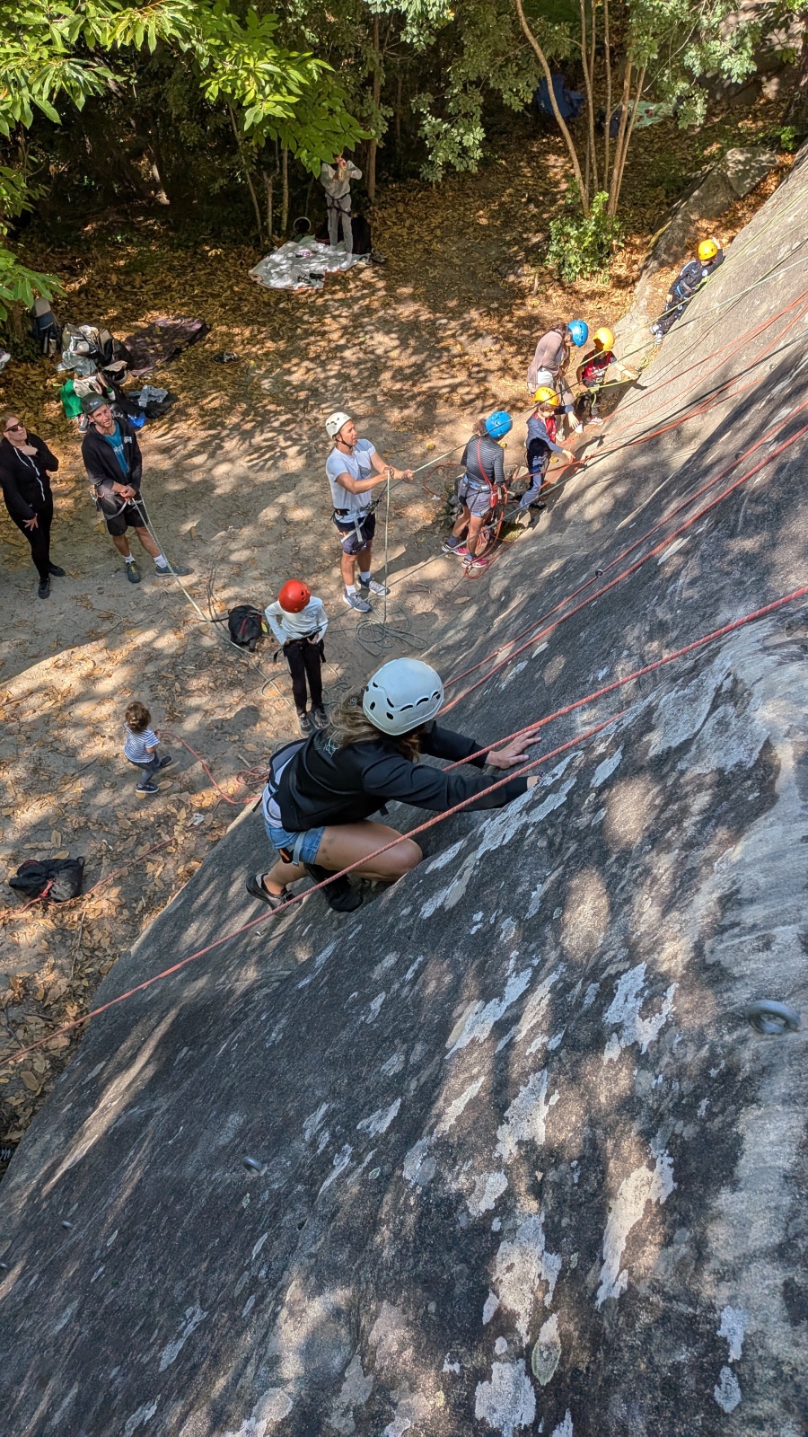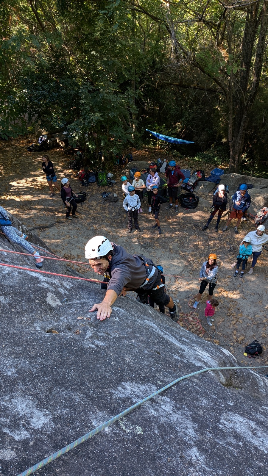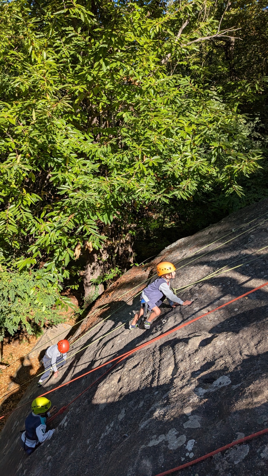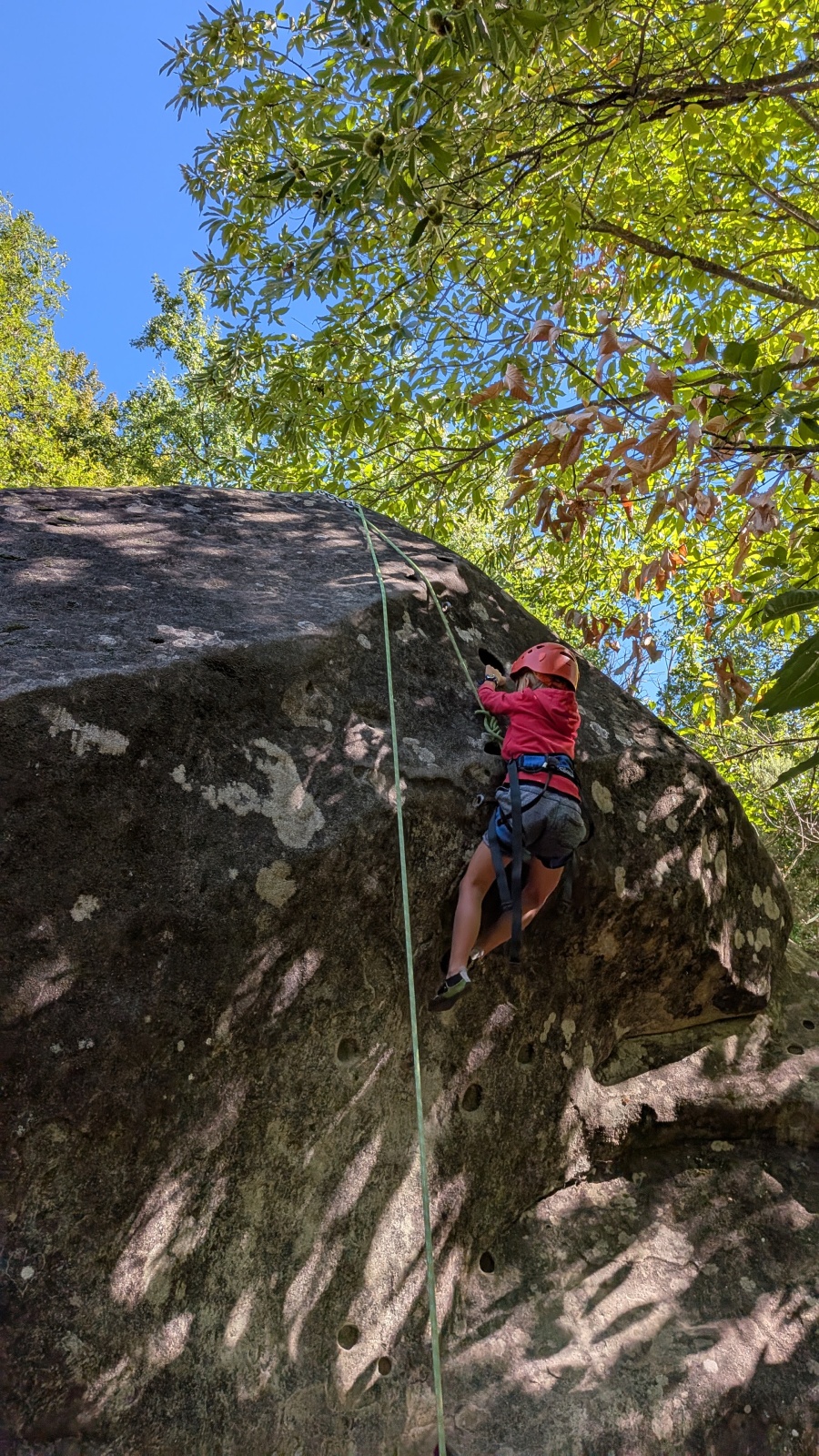 Stella, quelque peu impatiente ou intensément passionnée par la varrape, est la première à se remettre en route. Elle est rapidement suivi par une myriade de grimpeurs en herbe et notamment la petite Alice qui depuis le tout début de matinée grimpe avec frénésie tout ce qu’elle peut. Le papa me disait qu’ils étaient venus s’assurer qu’elle aimait l’escalade… Eh bien j’ai l’impression que la réponse est claire !