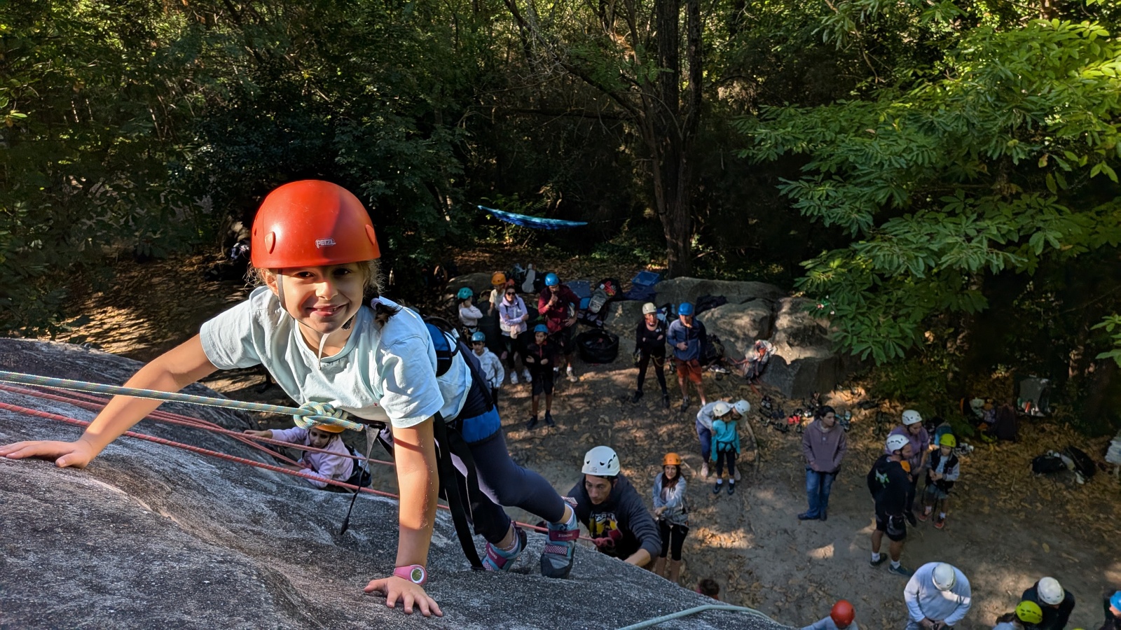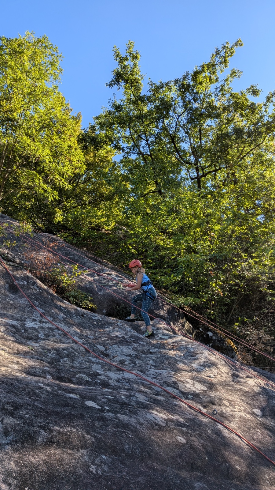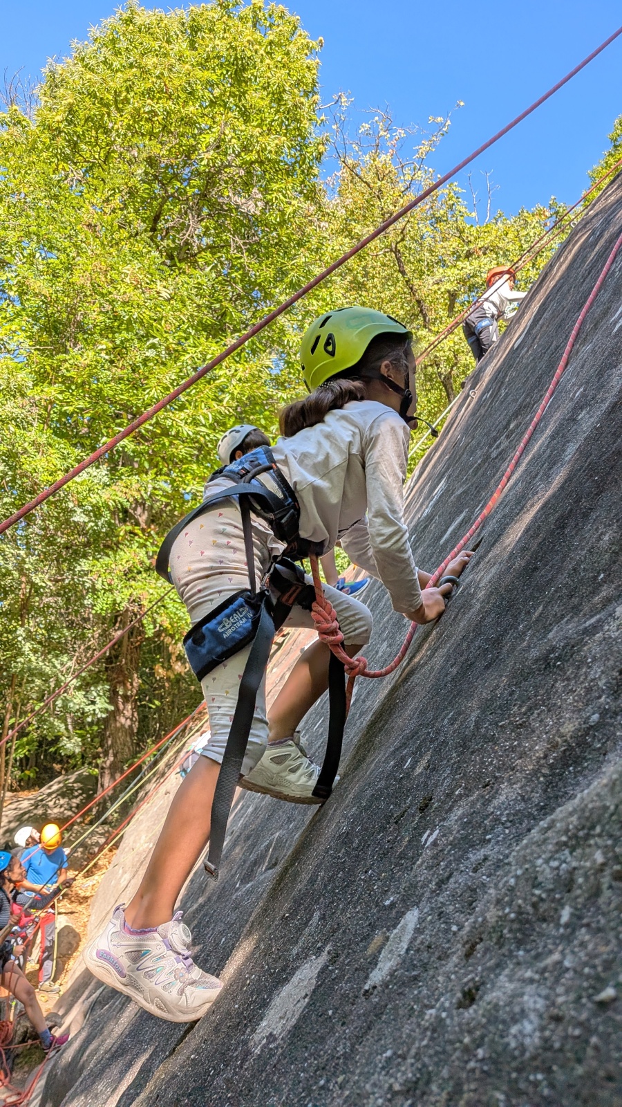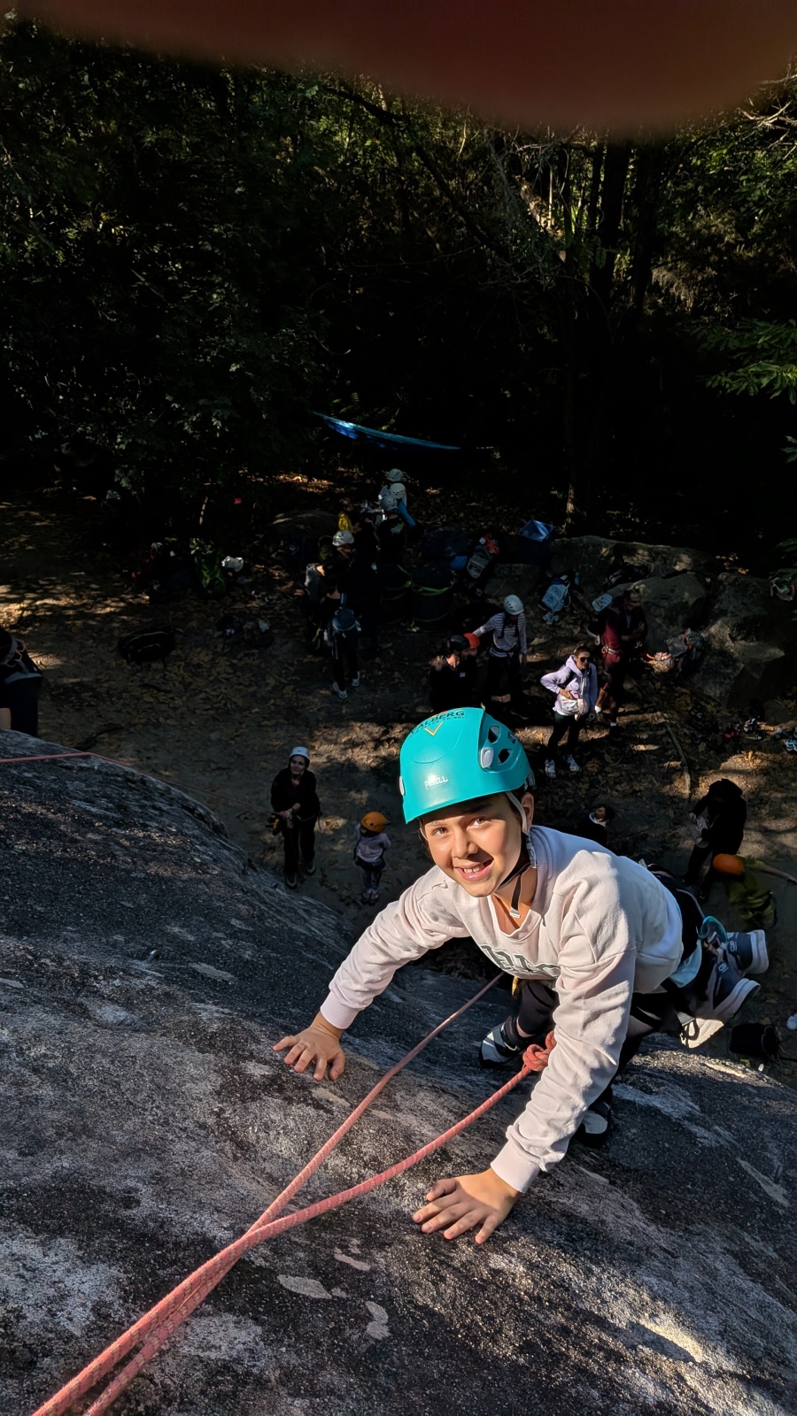 Stella, quelque peu impatiente ou intensément passionnée par la varrape, est la première à se remettre en route. Elle est rapidement suivi par une myriade de grimpeurs en herbe et notamment la petite Alice qui depuis le tout début de matinée grimpe avec frénésie tout ce qu’elle peut. Le papa me disait qu’ils étaient venus s’assurer qu’elle aimait l’escalade… Eh bien j’ai l’impression que la réponse est claire !