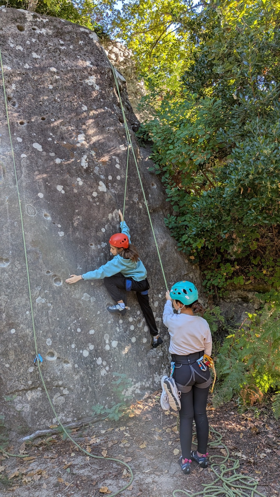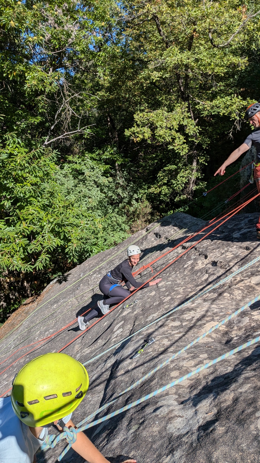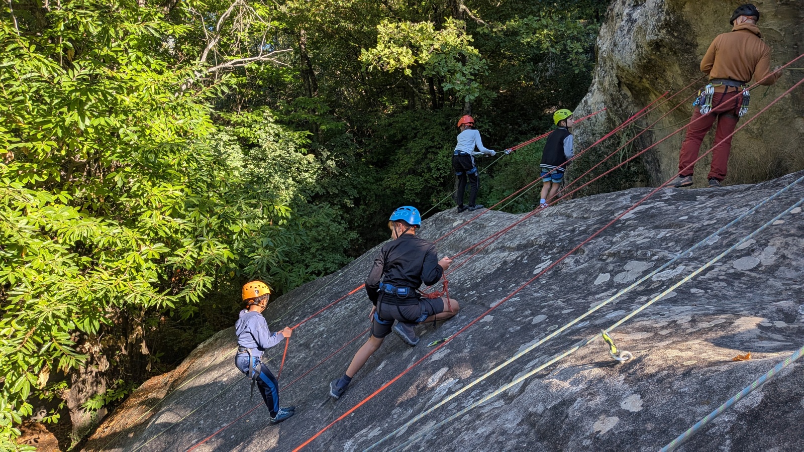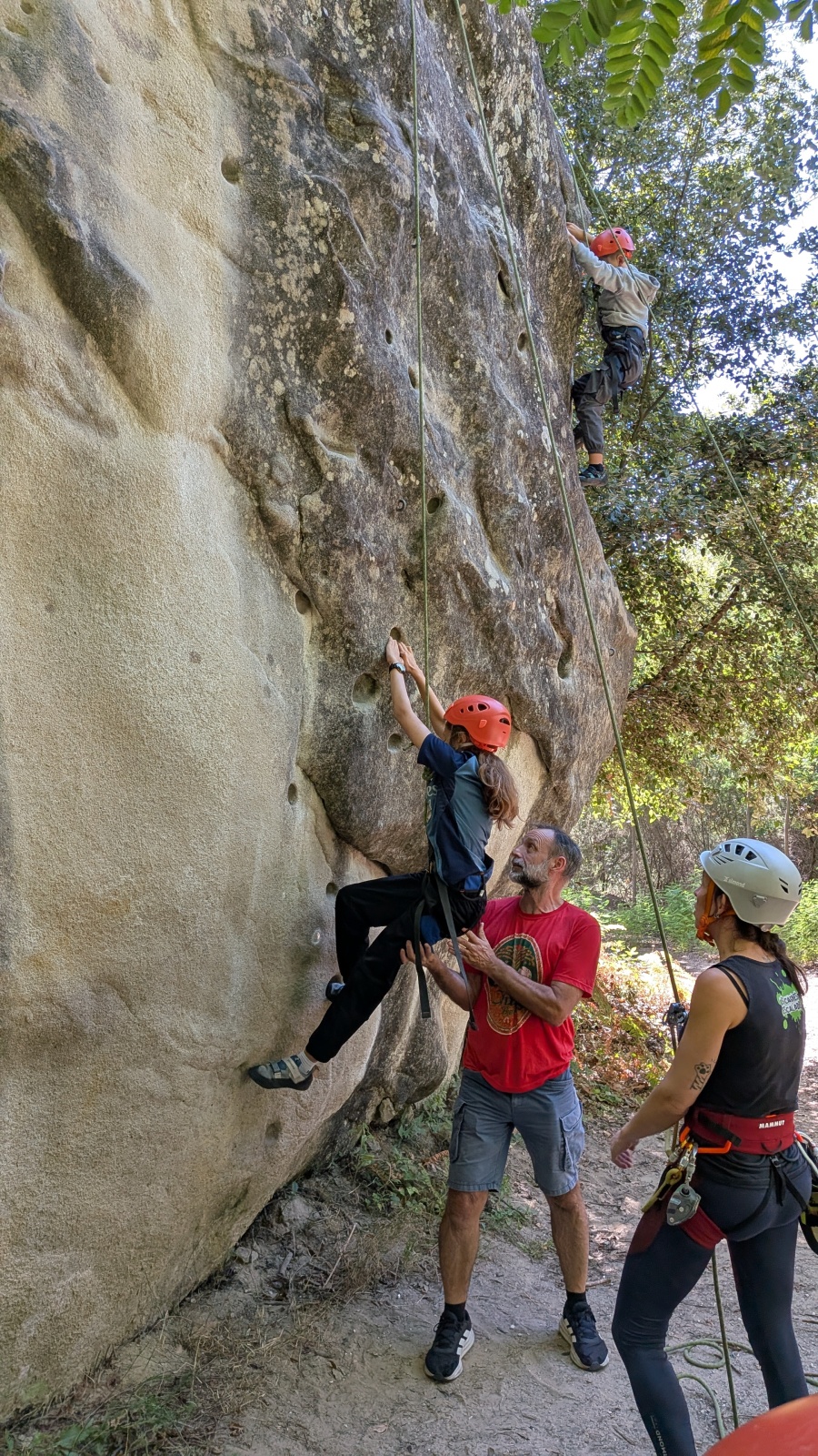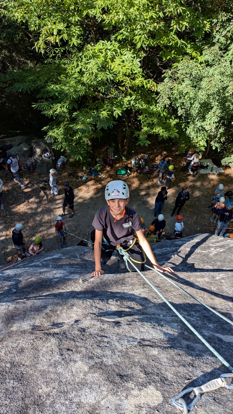 Quelques figures du club comme Lia et Romane nous font l’honneur de leur présence mais nous les verrons peu, elles préfèrent grimper à l’étage du dessus, là où les voies sont plus corsées. Dorénavant le secteur affiche complet, enfants et parents se bousculent pour faire un nœud de huit et ainsi gravir le plus de longueurs possible. Après l’ascension vient la redescente qui peut parfois être plus délicate encore. Effectivement, pour une descente en bonne et due forme, il faut se mettre en arrière, garder les pieds hauts et, sur cette falaise peu verticale, tenter de mettre un maximum de poids dans le baudrier. Des consignes contre intuitives que les plus nocives peuvent avoir du mal à appliquer mais heureusement que Djé, posté au sommet de la paroi, est là pour aider les grimpeurs en difficulté. Eh oui tout n’est pas si facile sans compter qu’ici tout ne tient vraiment qu’à un fil.