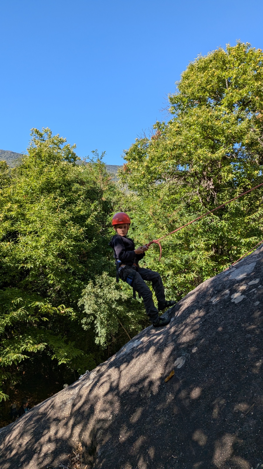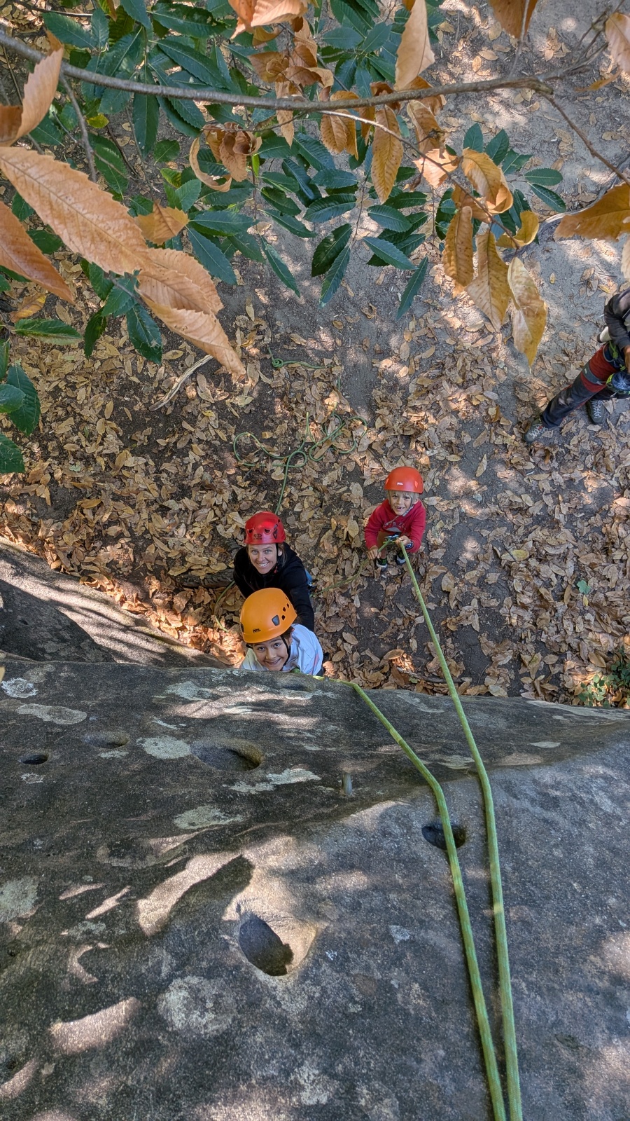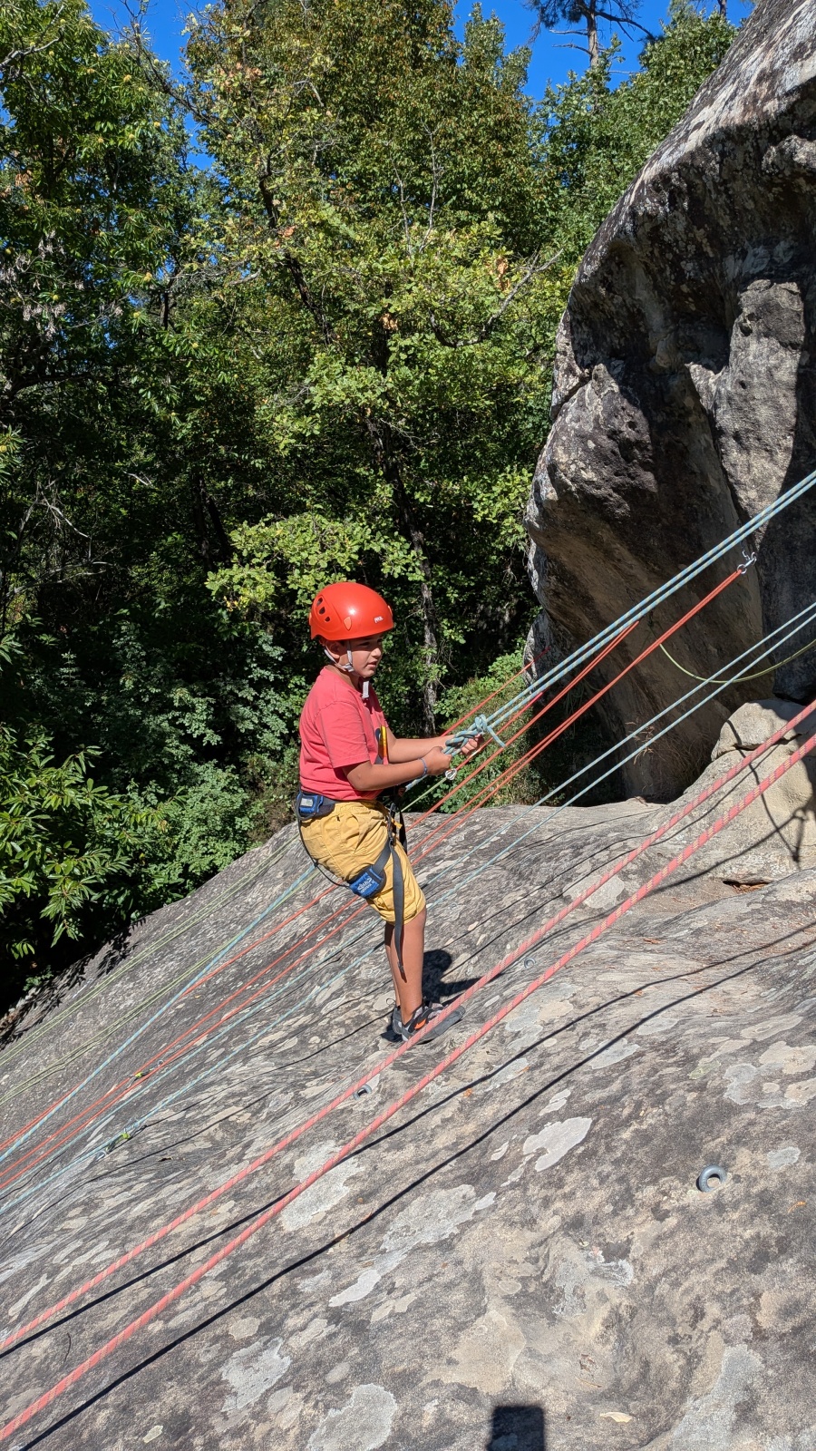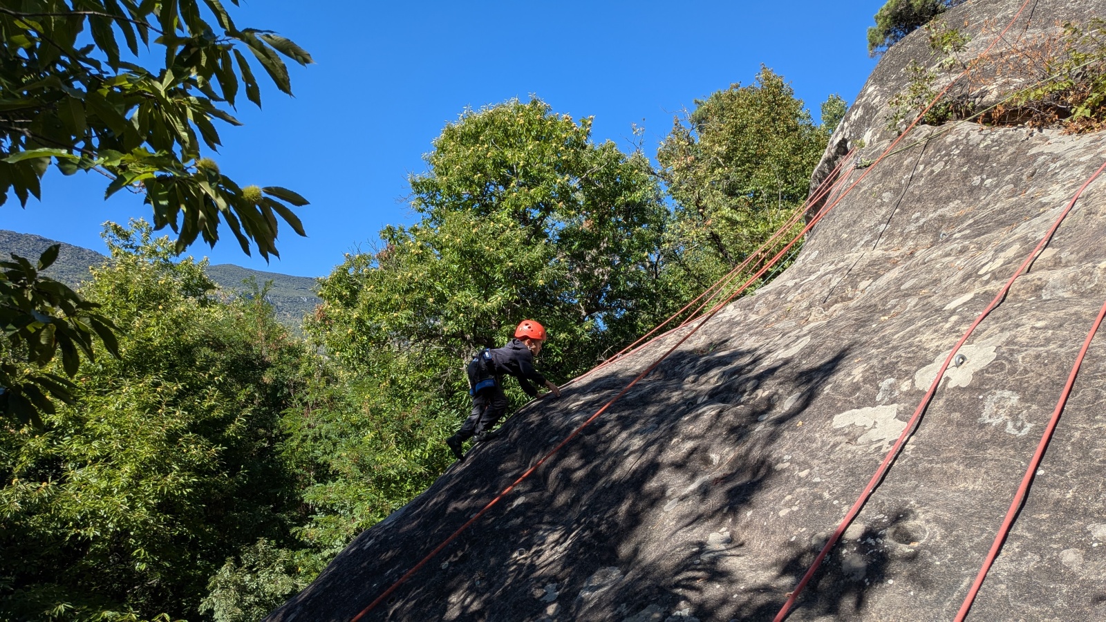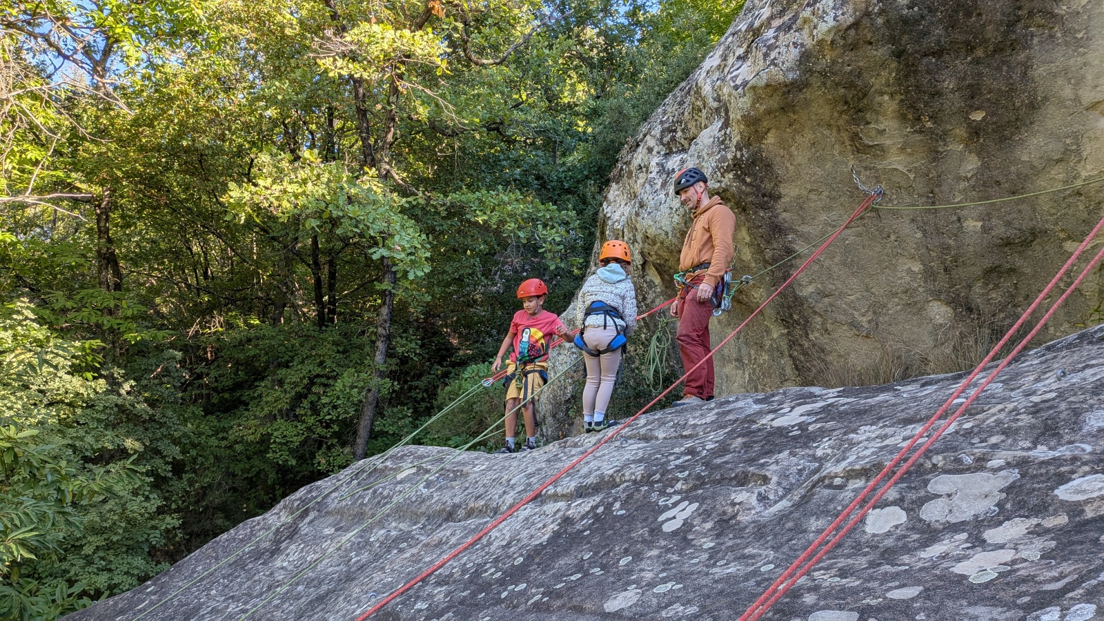 Quelques figures du club comme Lia et Romane nous font l’honneur de leur présence mais nous les verrons peu, elles préfèrent grimper à l’étage du dessus, là où les voies sont plus corsées. Dorénavant le secteur affiche complet, enfants et parents se bousculent pour faire un nœud de huit et ainsi gravir le plus de longueurs possible. Après l’ascension vient la redescente qui peut parfois être plus délicate encore. Effectivement, pour une descente en bonne et due forme, il faut se mettre en arrière, garder les pieds hauts et, sur cette falaise peu verticale, tenter de mettre un maximum de poids dans le baudrier. Des consignes contre intuitives que les plus nocives peuvent avoir du mal à appliquer mais heureusement que Djé, posté au sommet de la paroi, est là pour aider les grimpeurs en difficulté. Eh oui tout n’est pas si facile sans compter qu’ici tout ne tient vraiment qu’à un fil.