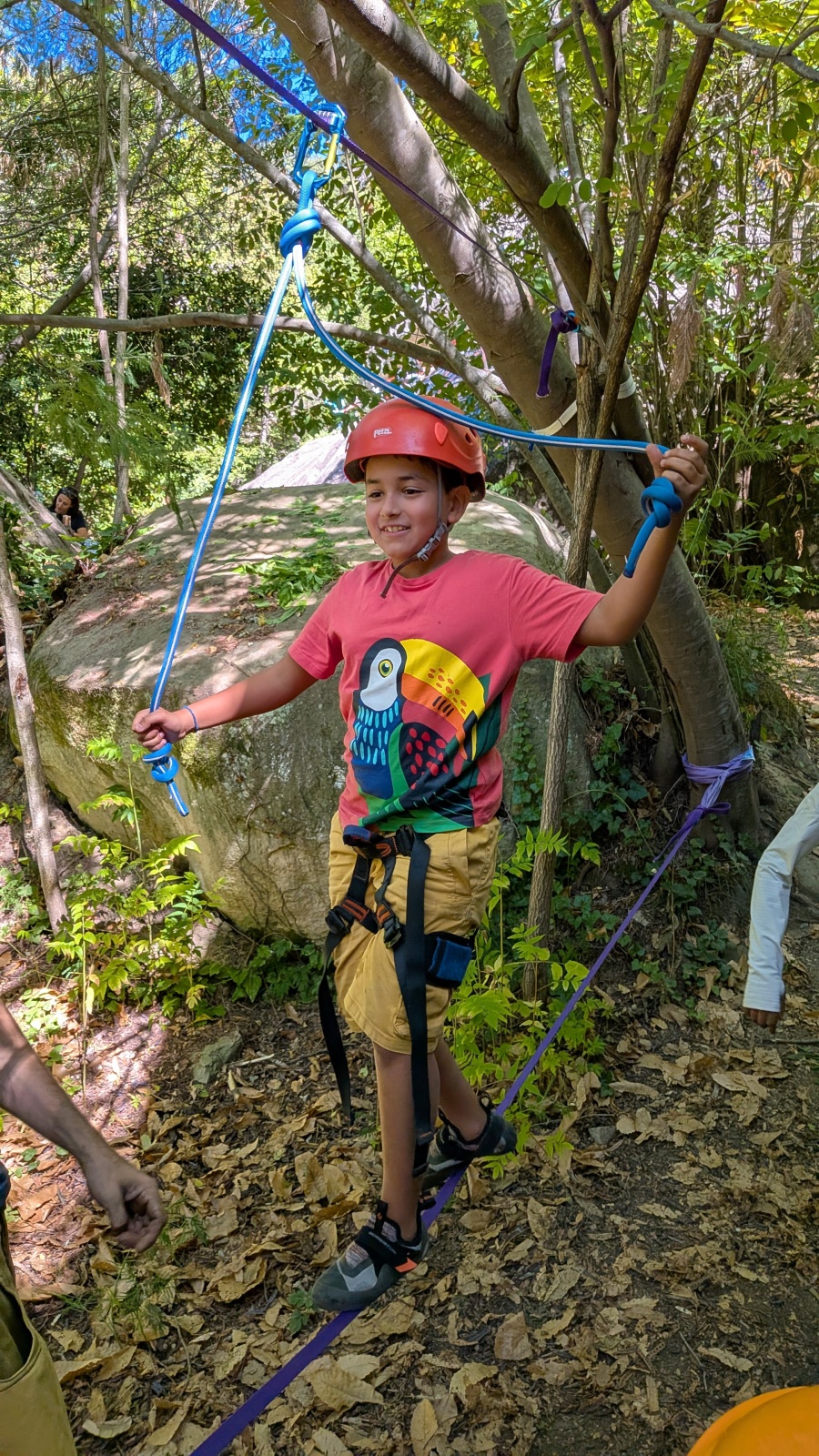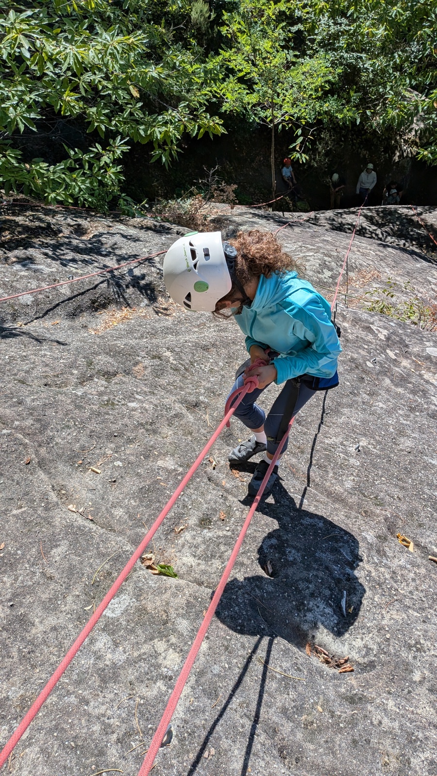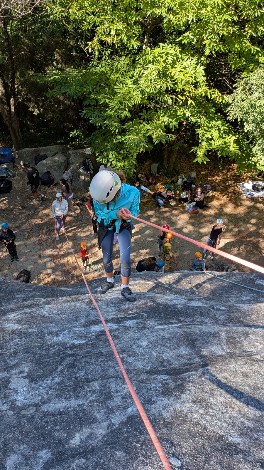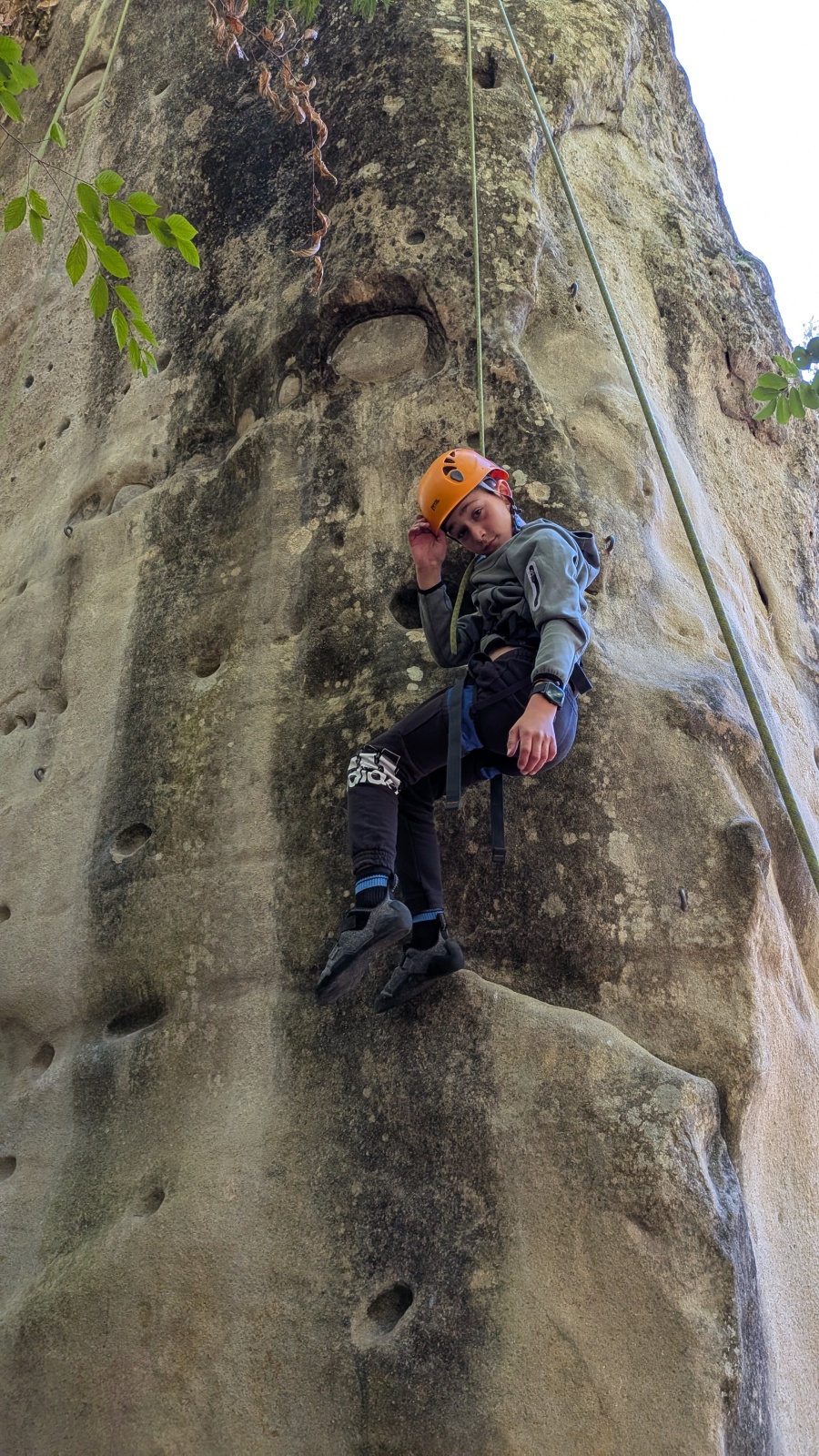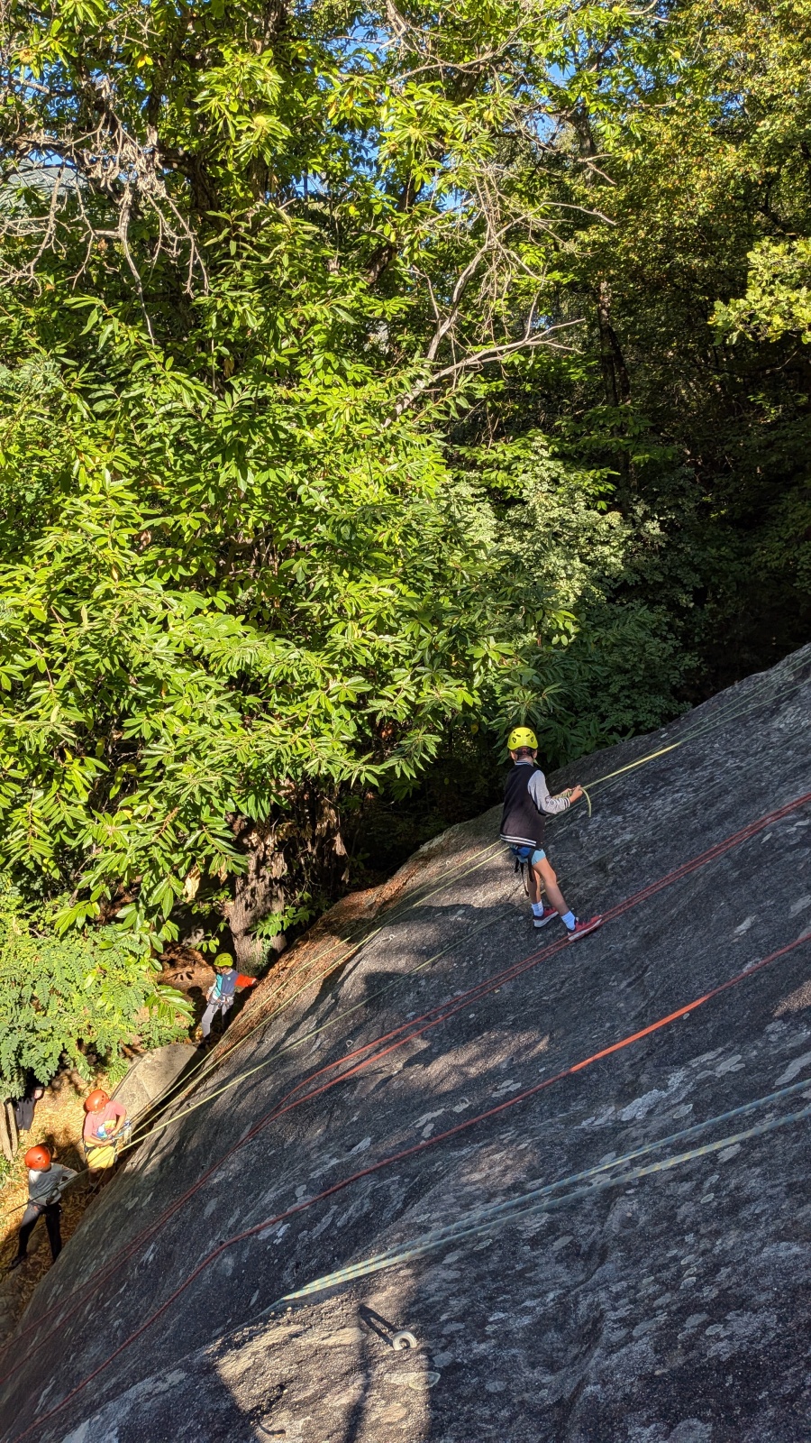 Quelques figures du club comme Lia et Romane nous font l’honneur de leur présence mais nous les verrons peu, elles préfèrent grimper à l’étage du dessus, là où les voies sont plus corsées. Dorénavant le secteur affiche complet, enfants et parents se bousculent pour faire un nœud de huit et ainsi gravir le plus de longueurs possible. Après l’ascension vient la redescente qui peut parfois être plus délicate encore. Effectivement, pour une descente en bonne et due forme, il faut se mettre en arrière, garder les pieds hauts et, sur cette falaise peu verticale, tenter de mettre un maximum de poids dans le baudrier. Des consignes contre intuitives que les plus nocives peuvent avoir du mal à appliquer mais heureusement que Djé, posté au sommet de la paroi, est là pour aider les grimpeurs en difficulté. Eh oui tout n’est pas si facile sans compter qu’ici tout ne tient vraiment qu’à un fil.
