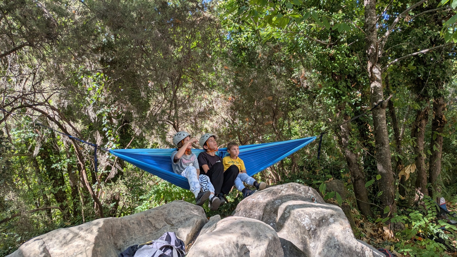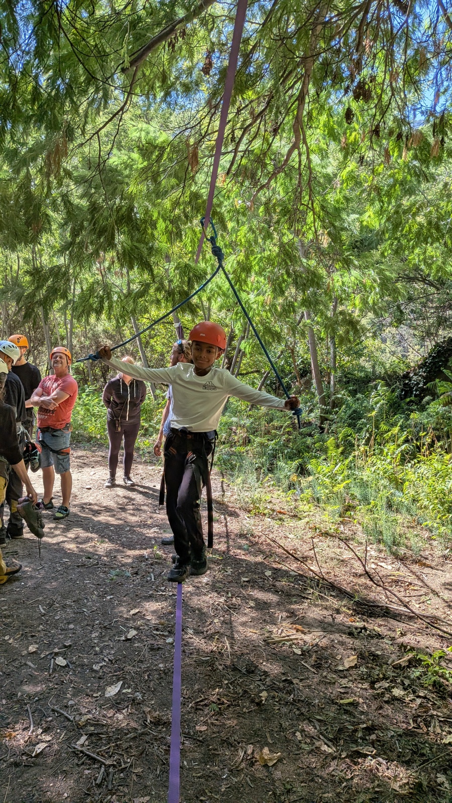 Pour varier un peu les activités Julien installe une slackline et, les enfants adorant jouer aux funambules, fait bon nombre d’heureux. Nous arrivons dans le milieu de l’après-midi et quelques familles s’en vont retrouver une activité normale. Nous reçevons beaucoup de compliments et de remerciements et ceux-ci nous touchent en plein cœur. Certains n’ont pas dit leur dernier mot, c’est le cas de la petite sœur d’Anton. Du haut de ses trois ans, elle tutoie les cimes du Plantier avec une étonnante facilité. Même lors de la descente et malgré un manque de stabilité du à de toutes petites jambes, cette dernière s’en sort à merveille et fait le bonheur des parents. Lorsque on lui demande « Qu’est ce qu’on dit ? » en attendant un merci, celle-ci préfère le moins poli mais tout aussi satisfaisant « Encore ! »