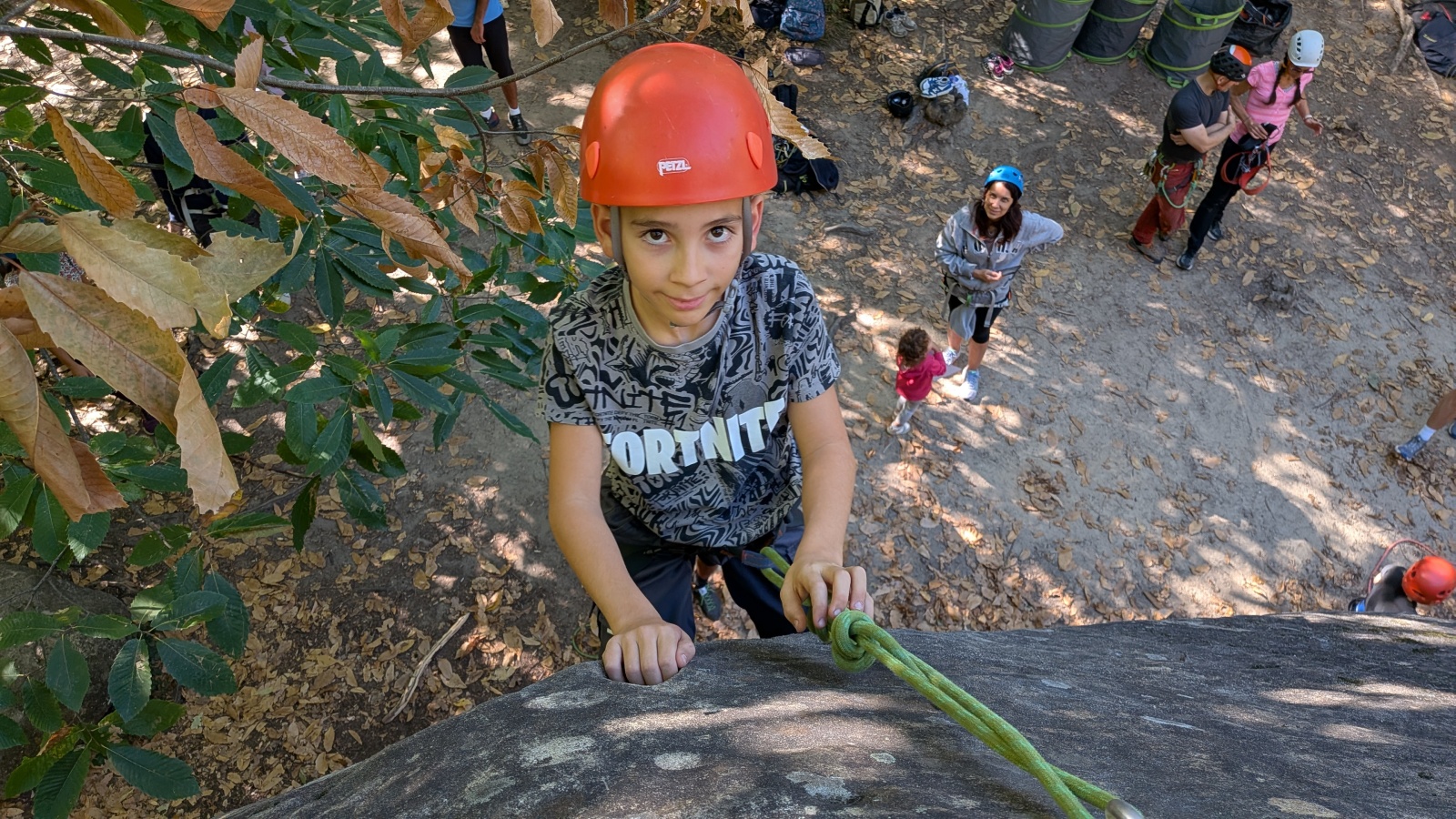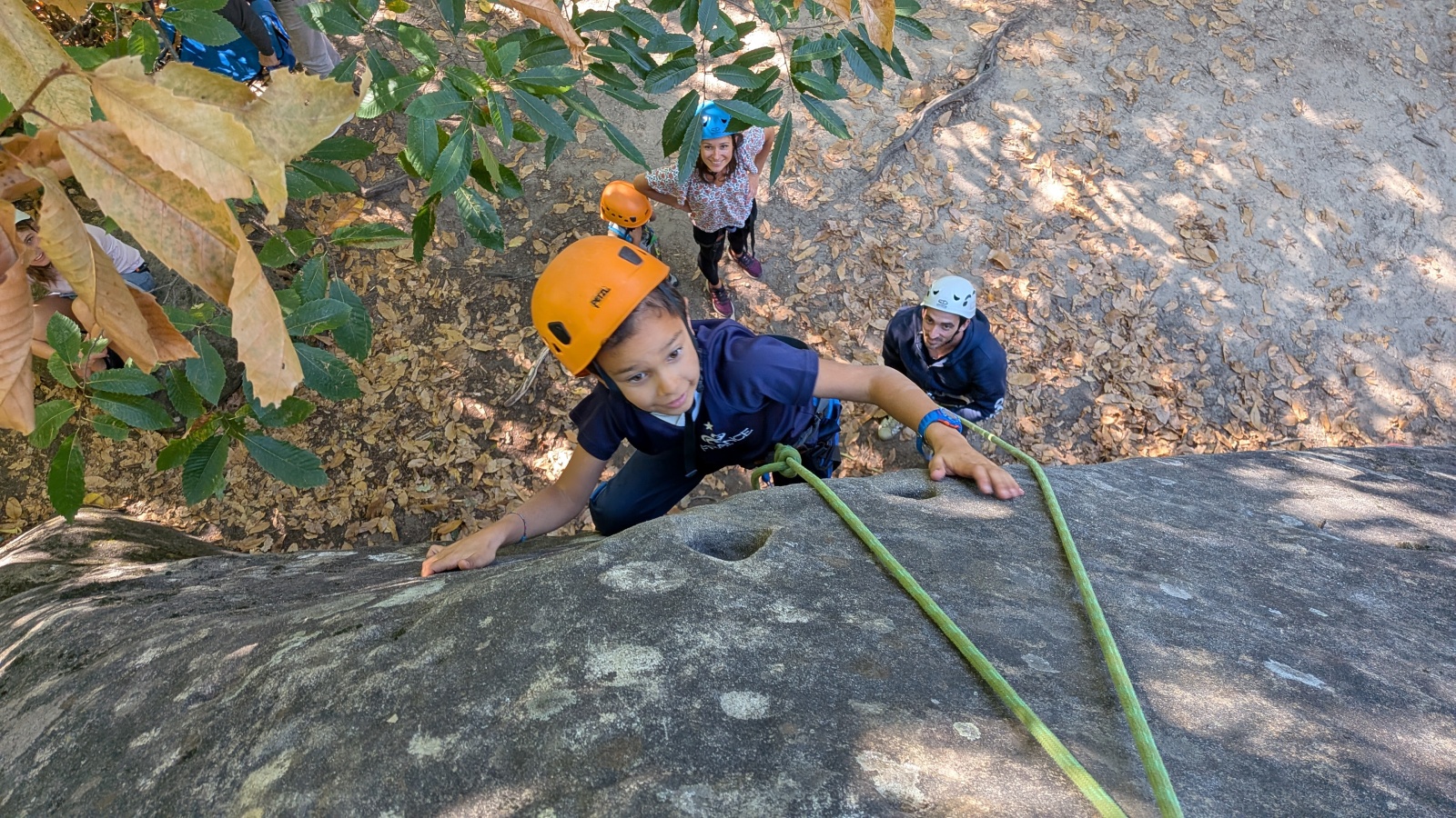 Un instant plus tard les premiers invités font leur apparition puis, après s’être revêtu d’un casque et d’un baudrier, ceux-ci ont la chance de pouvoir choisir la voie qui les attire le plus. Les premières longueurs sont réalisées, parfois avec appréhension, parfois avec aisance et souvent avec joie. Les parents aussi se prêtent au jeu en assurant les enfants et en apprenant les fameux « 5 temps » nécessaires pour un assurage homologué. Certains n’en restent pas là et chaussent même des chaussons afin d’imiter les plus jeunes. Ici les enfants, qui ont en général des connaissances supérieures à leurs aînés, sont placés en situation d’enseignant et, en plus d’en tirer une grande fierté, consolident leurs apprentissages.
