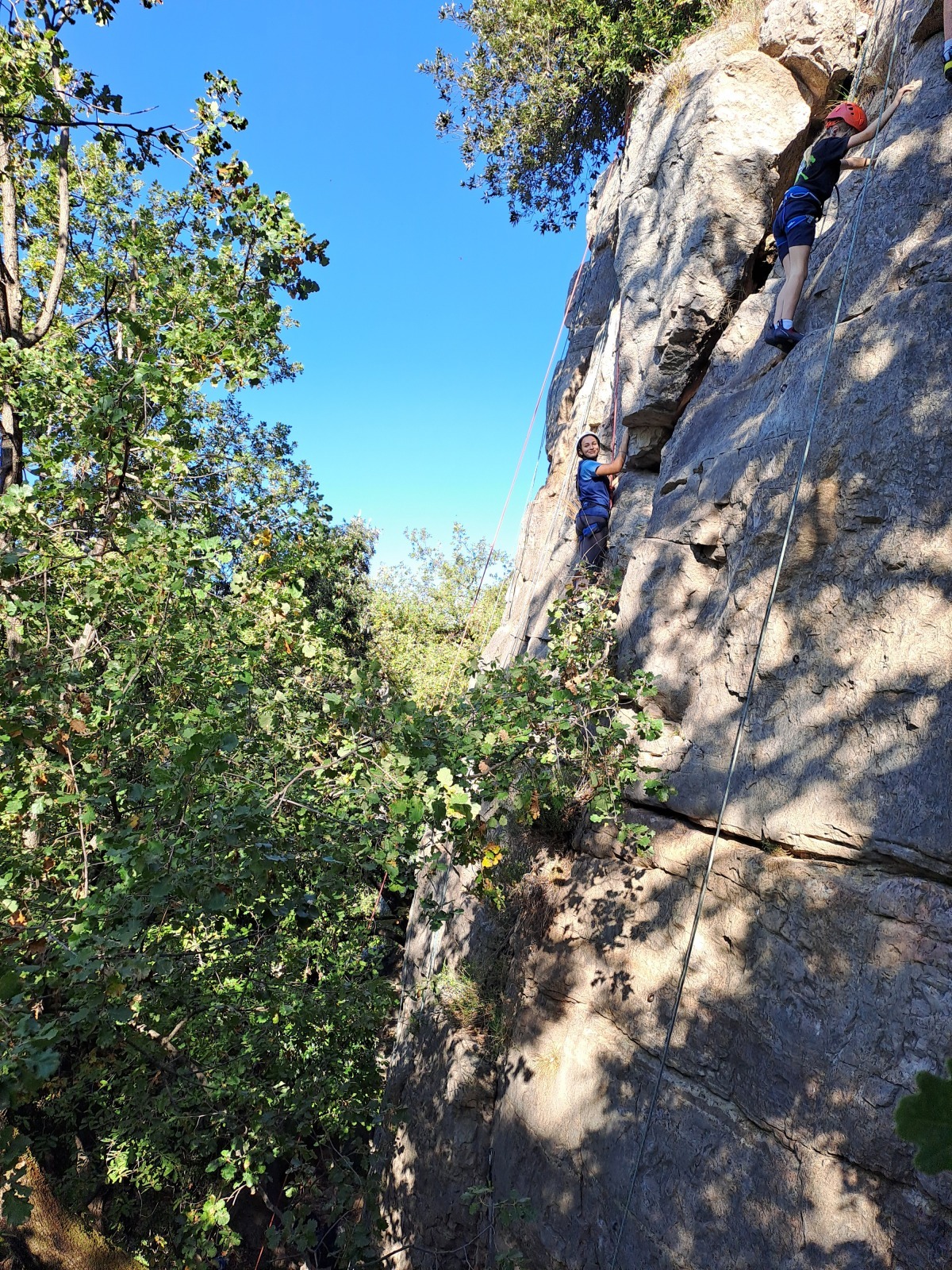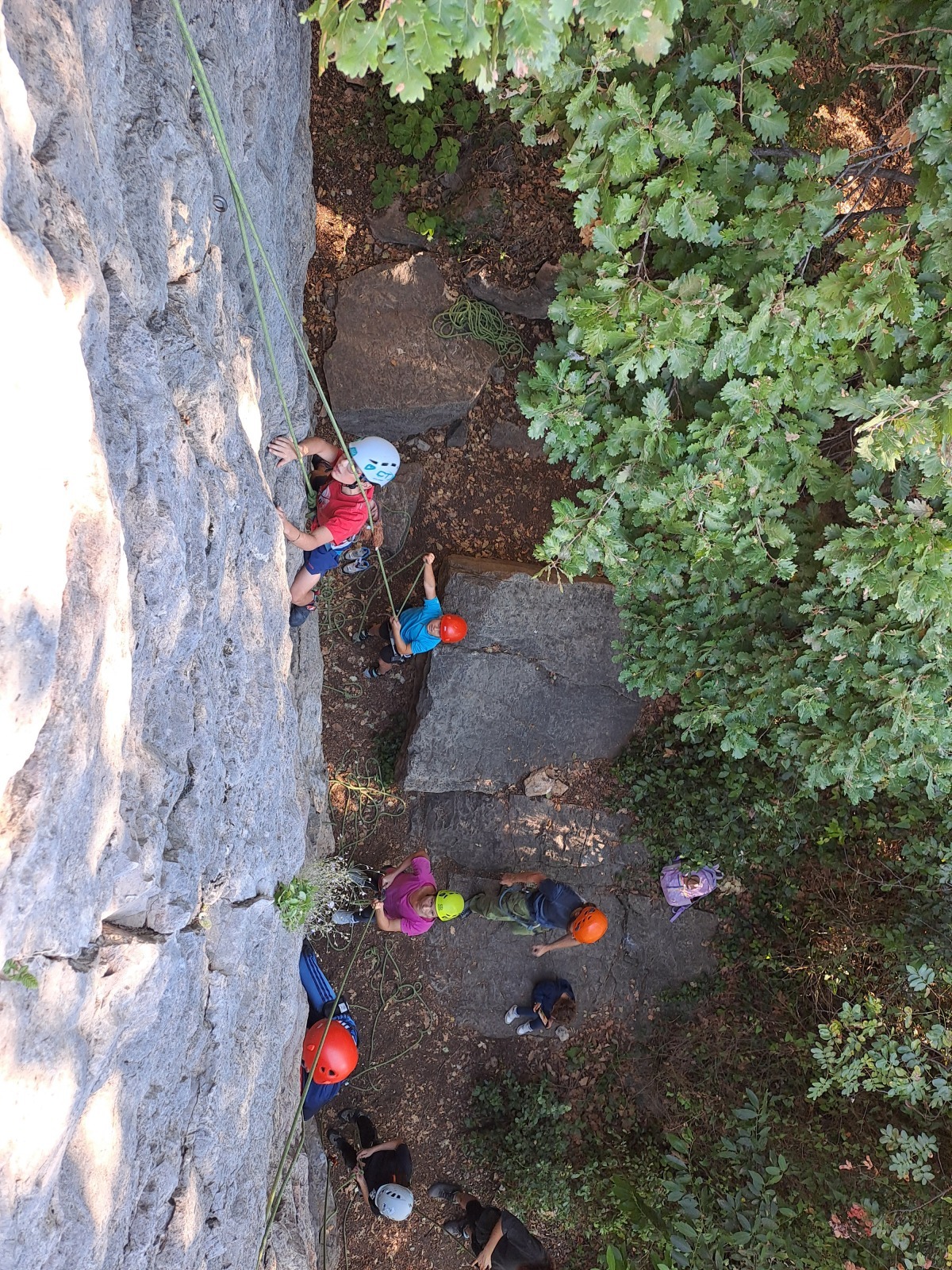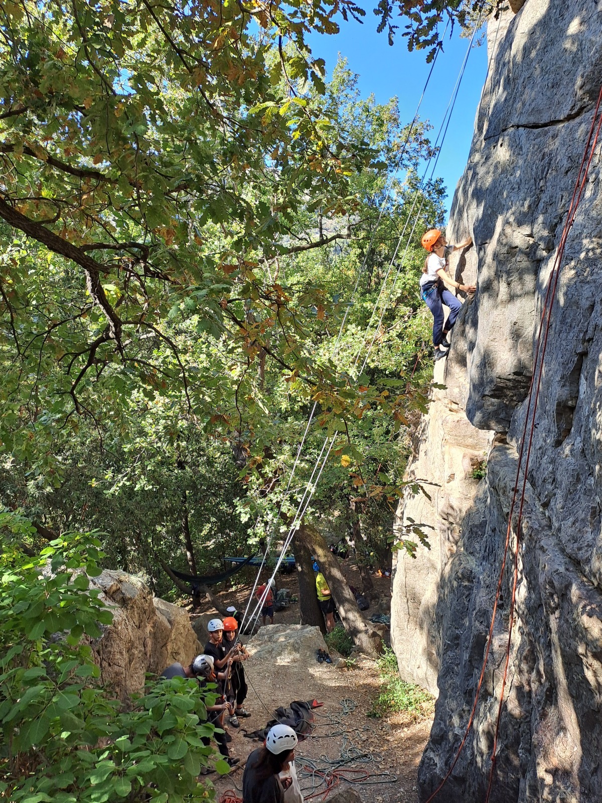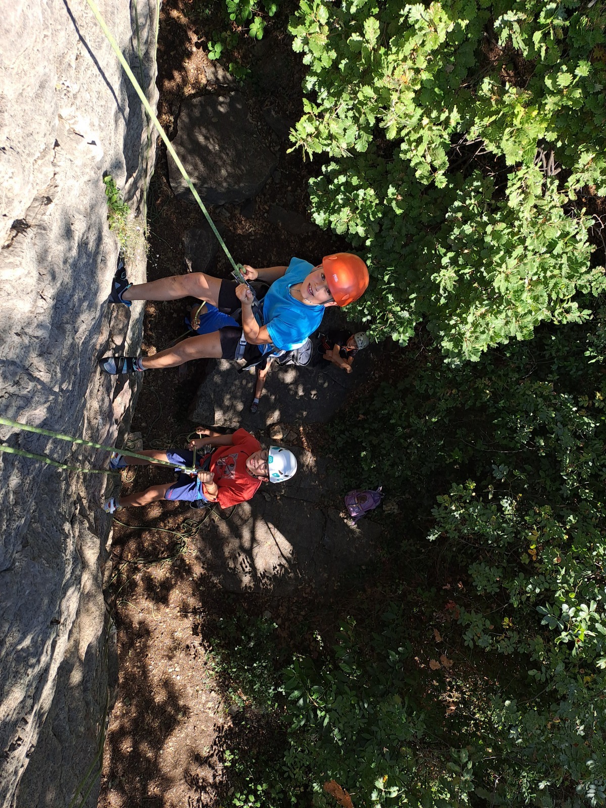 Sur place Romane et Kim sont déjà à la manœuvre puis après l’installation de nos cordes c’est tout un groupe qui se met en action. Julien s’occupe du petit bout de caillou situé en contrebas sur lequel Sylas, Rosemary, Amélie, Robin, Léon, Anton et Julie font leur première voie.