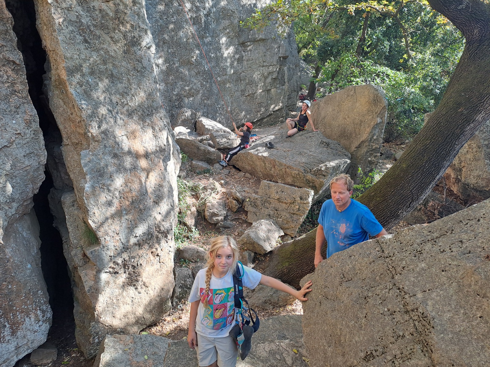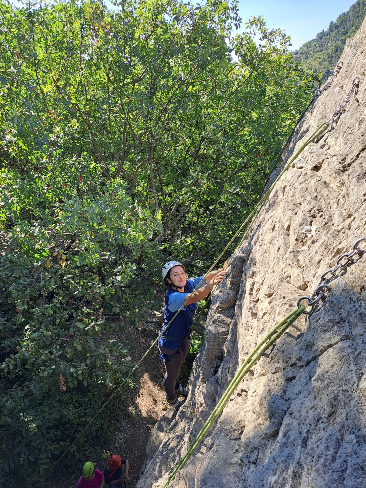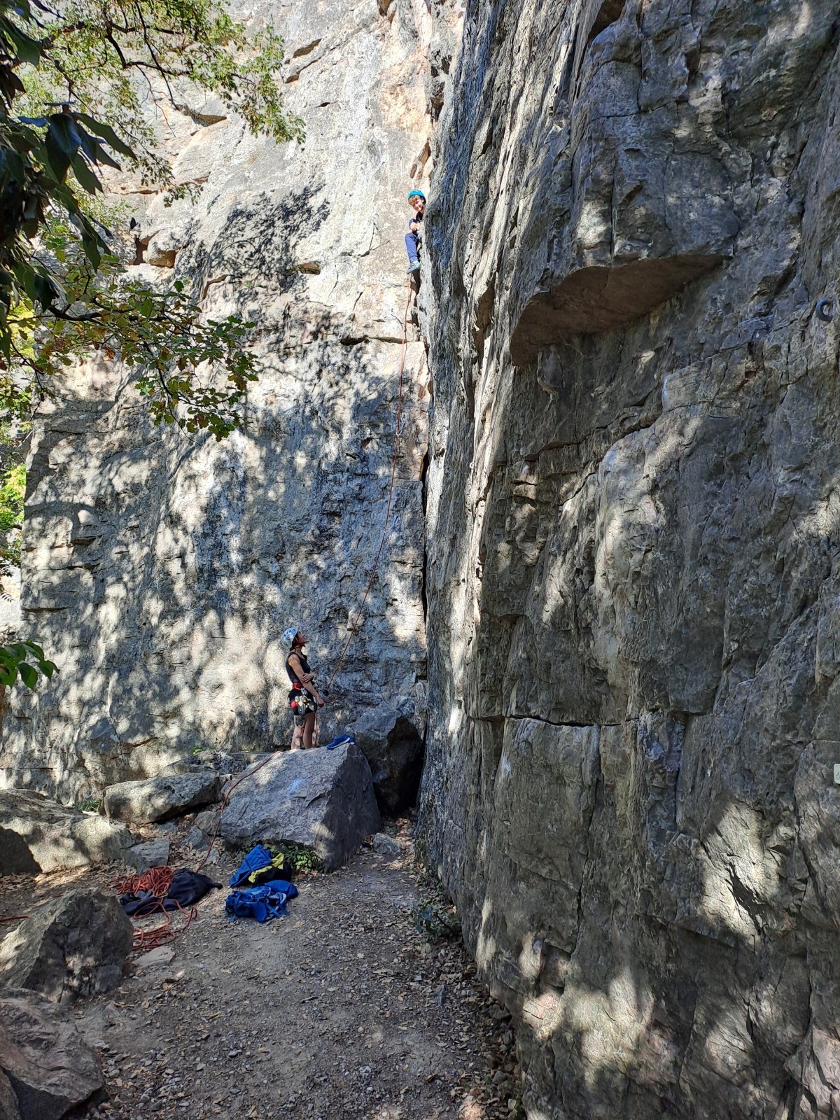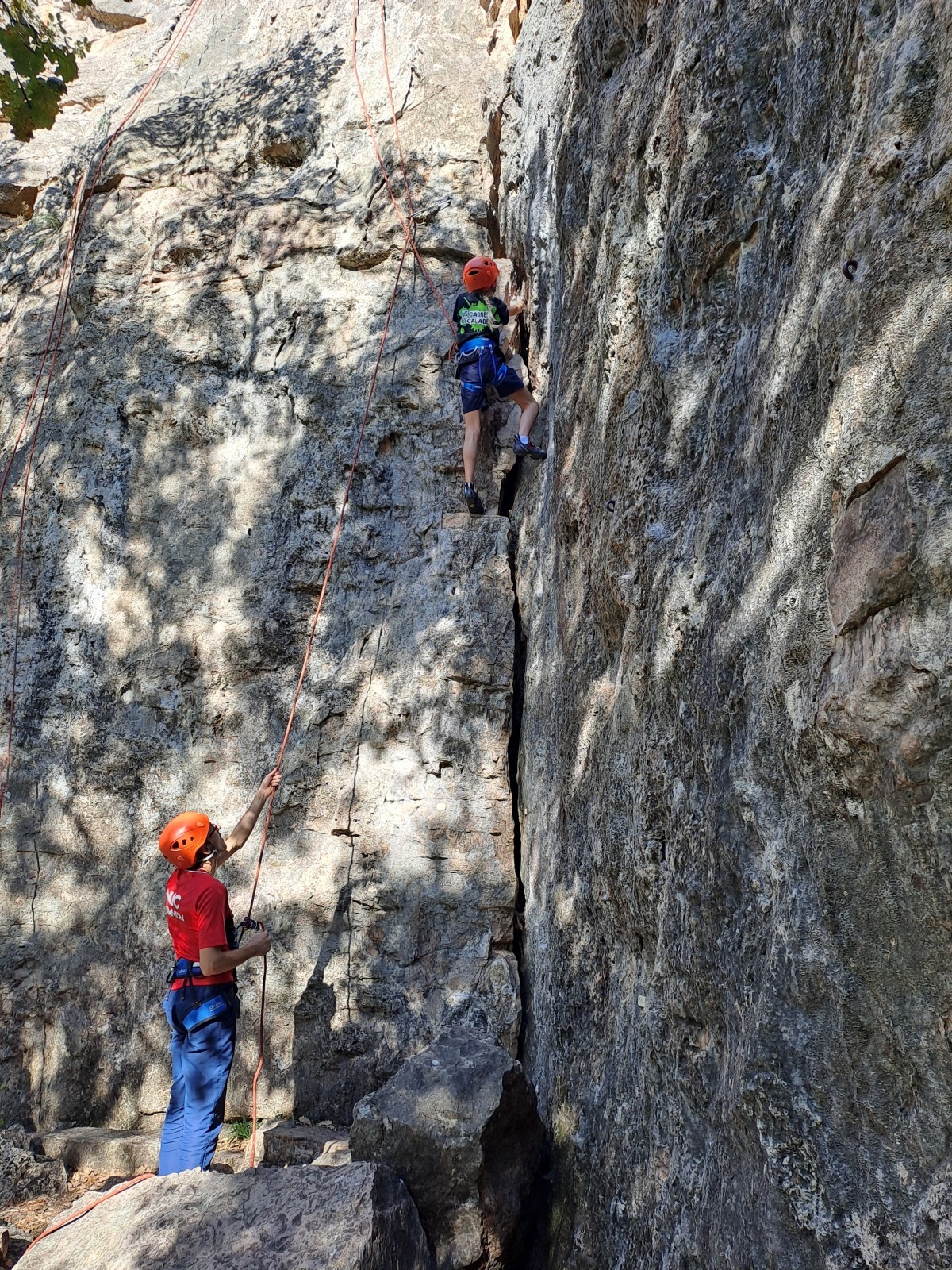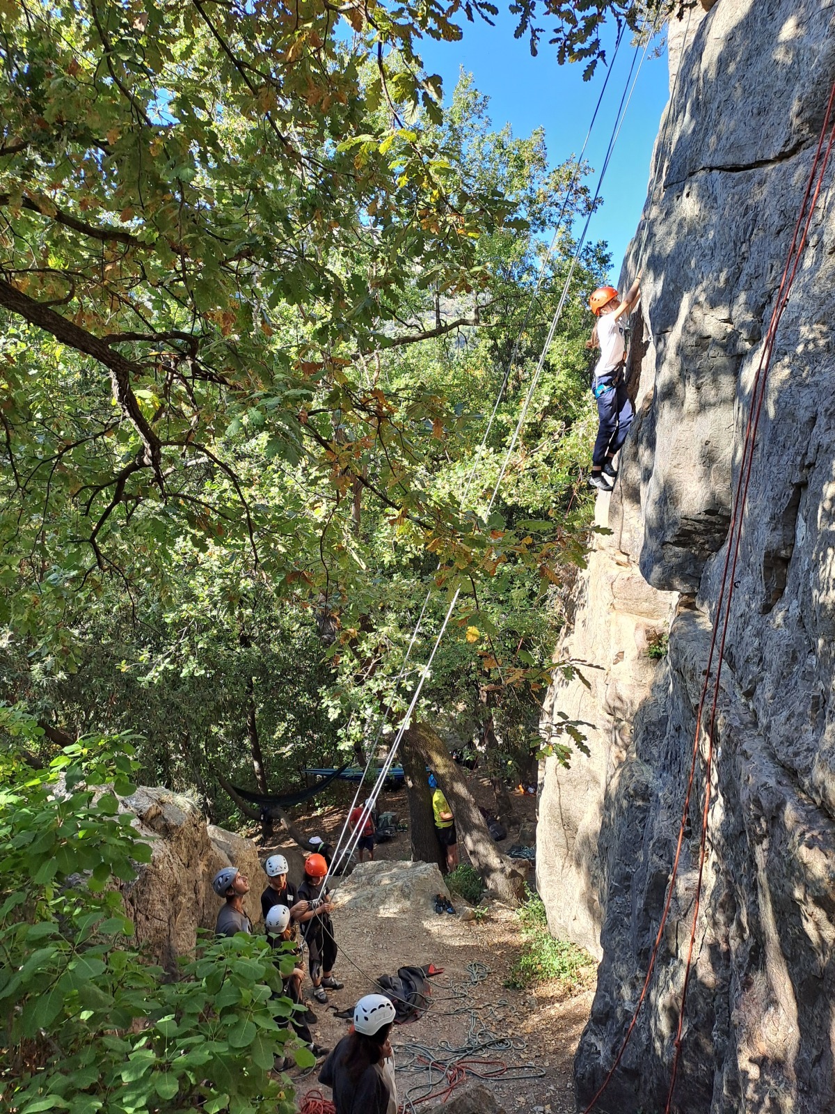 Sur place Romane et Kim sont déjà à la manœuvre puis après l’installation de nos cordes c’est tout un groupe qui se met en action. Julien s’occupe du petit bout de caillou situé en contrebas sur lequel Sylas, Rosemary, Amélie, Robin, Léon, Anton et Julie font leur première voie.