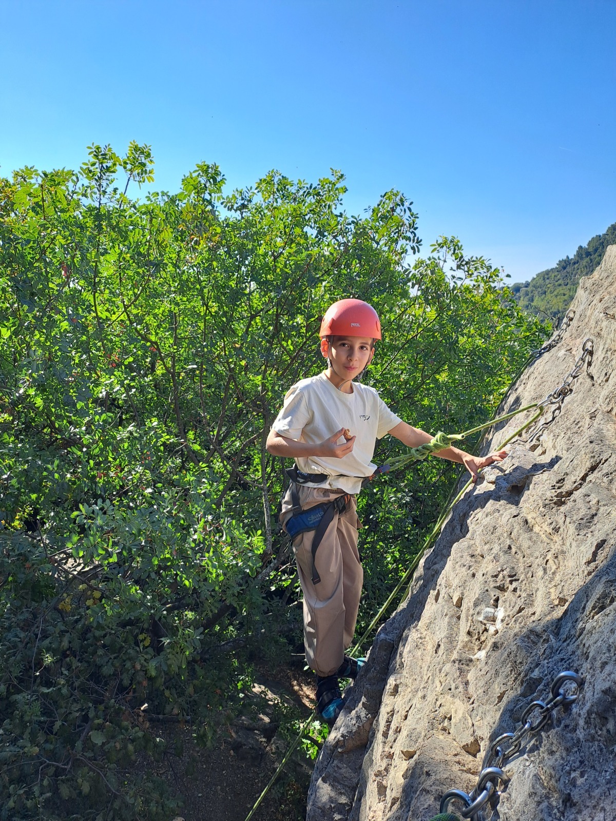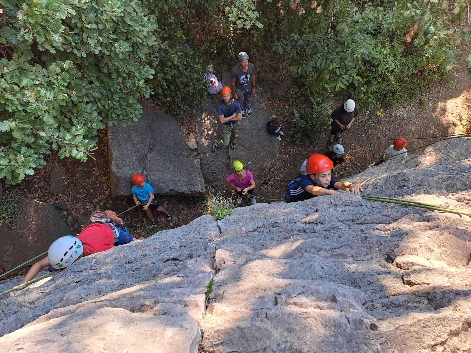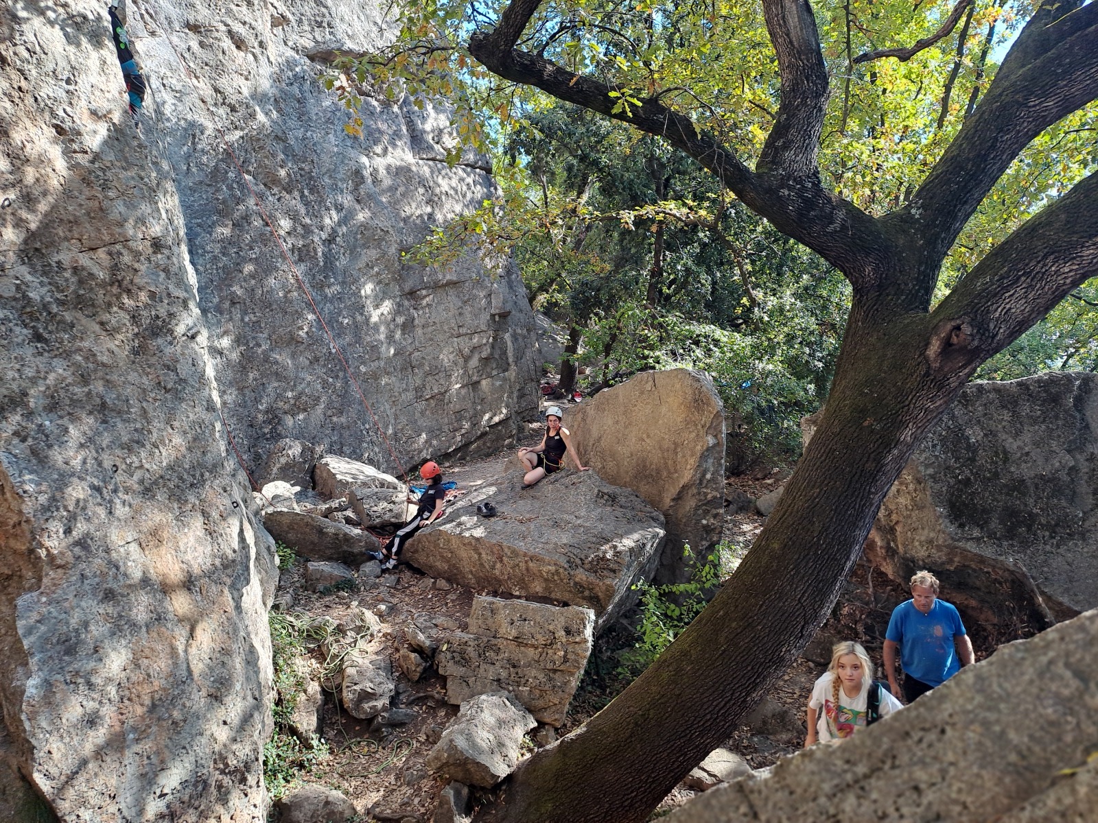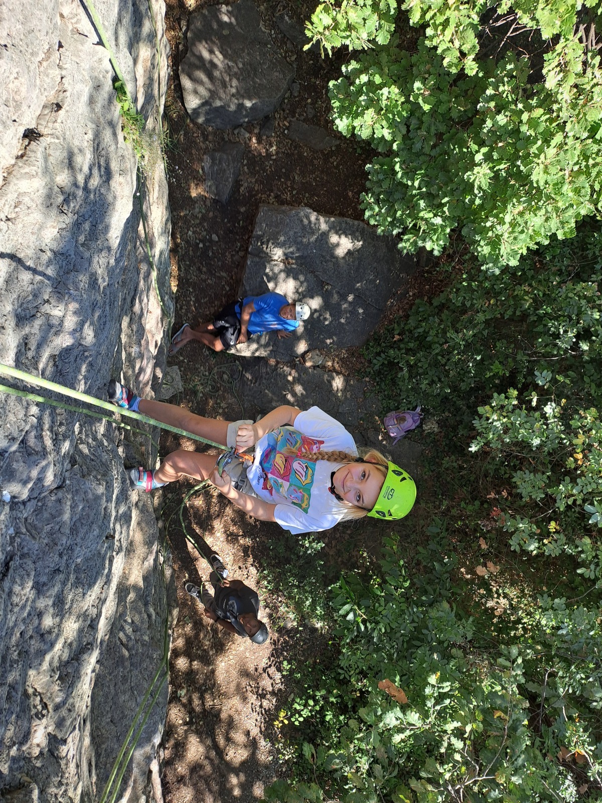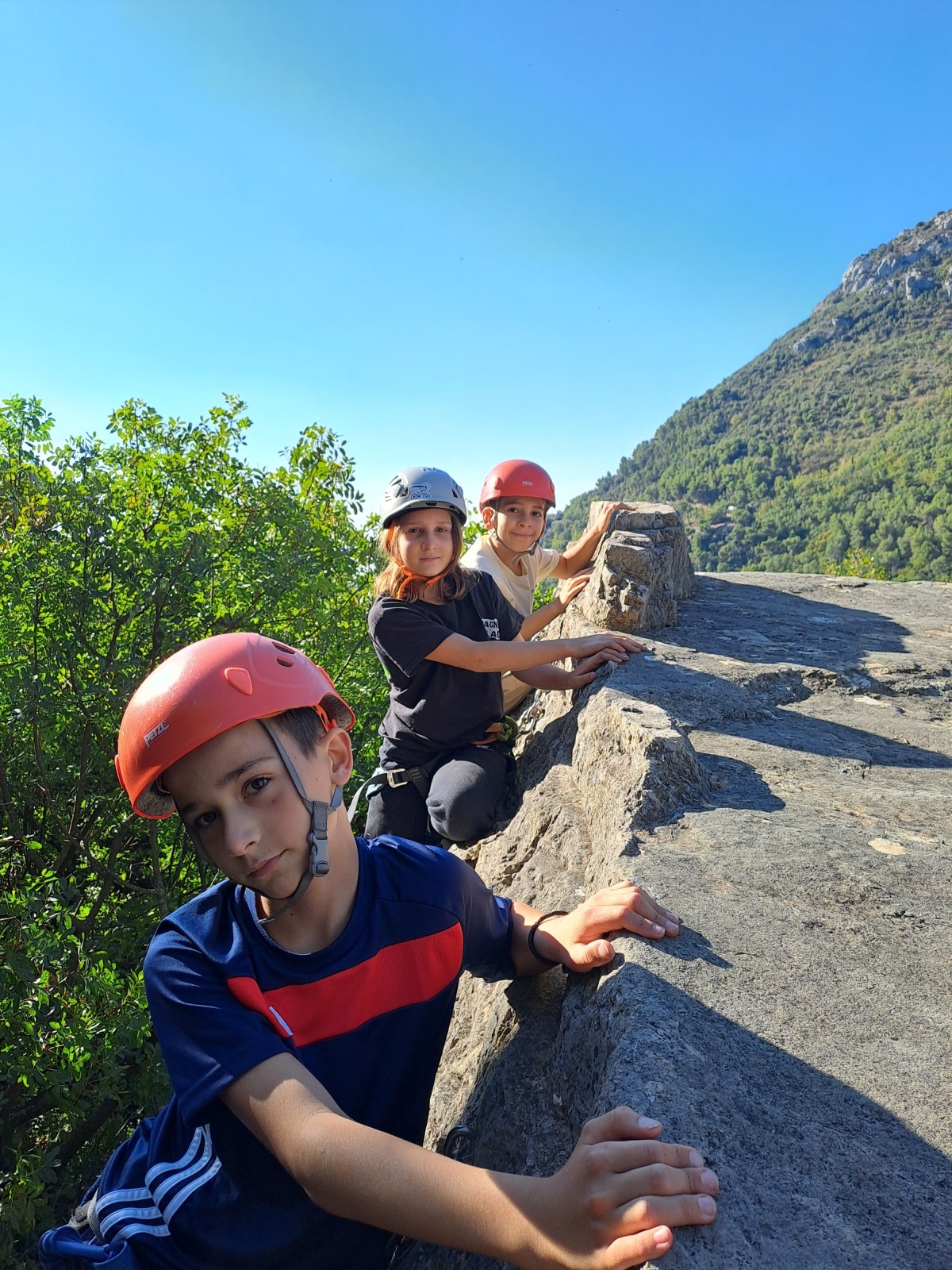 En haut Romain installe des moulinettes pour sa maman pendant que Milo et Alaric commencent leur moisson de croix car ils ont pour ambition de parcourir l’intégralité des voies du secteur ! Lois, après s’être échauffé, n’a pas de temps à perdre et file dans « Le spigolo ». Après avoir couiné dans les premiers mètres un poil lustrés, il s’envole jusqu’au relais de cette superbe voie. Amélie, qui a d’autres ambitions pour l’après-midi enchaîne les longueurs avec notamment « La niche » et « Saint d’esprit » où elle apprend à faire de l’artif à l’aide d’une dégaine lorsque un crux trop difficile lui fait face. Chloé n’est pas en reste et, avec l’aide de papa à l’assurage, enfile les voies comme des perles. L’heure passe, les ventres se creusent, il est temps pour nous d’avaler nos sandwichs et autres salades. En dessert, Dona nous régale de son désormais célèbre flan avec sa pointe de rhum. Miam miam et merci !