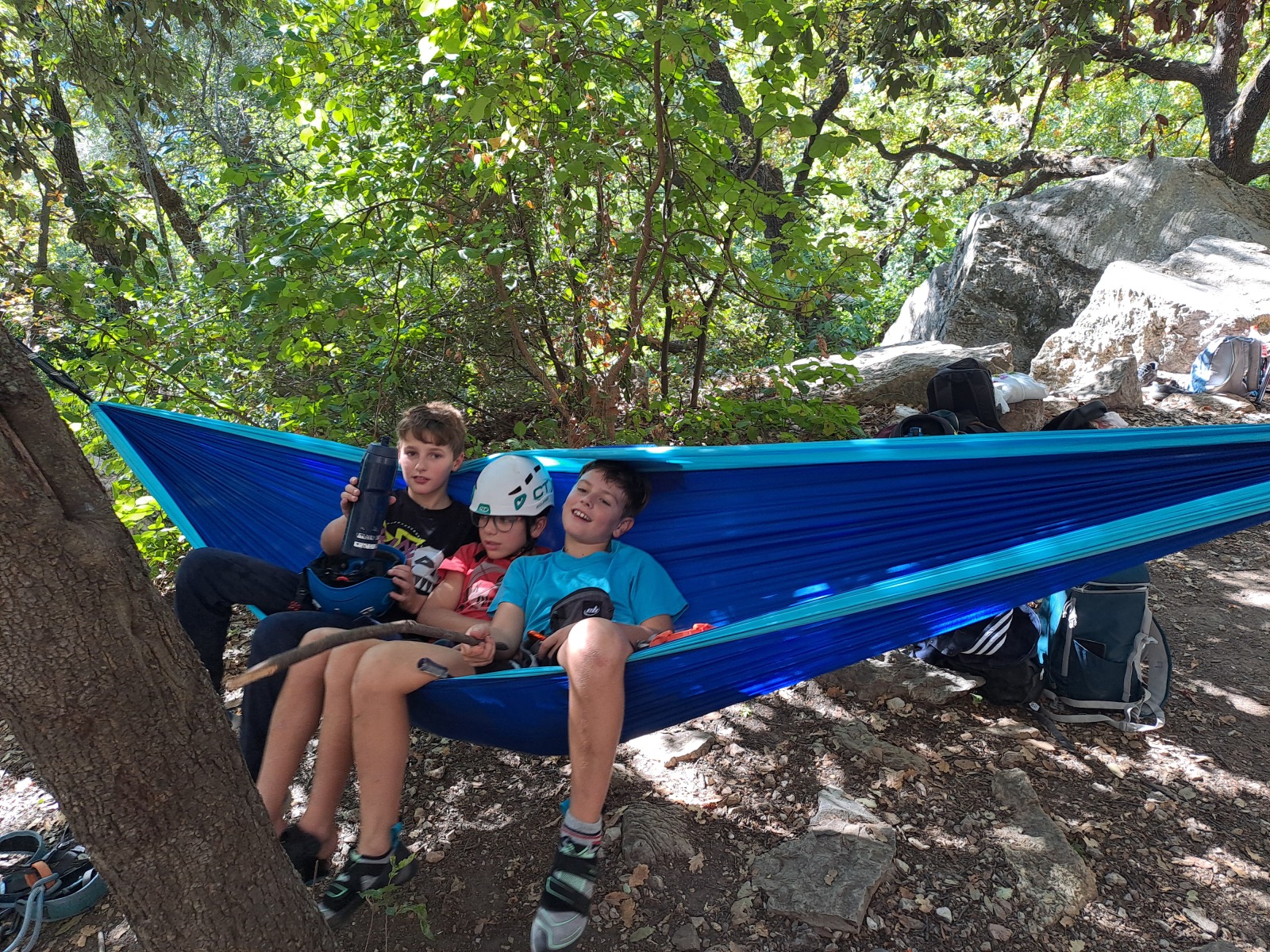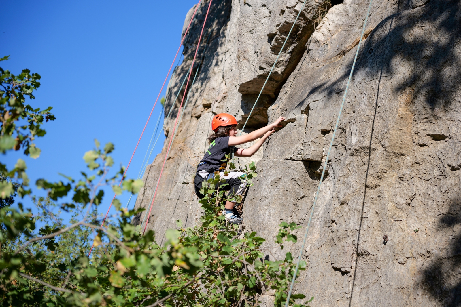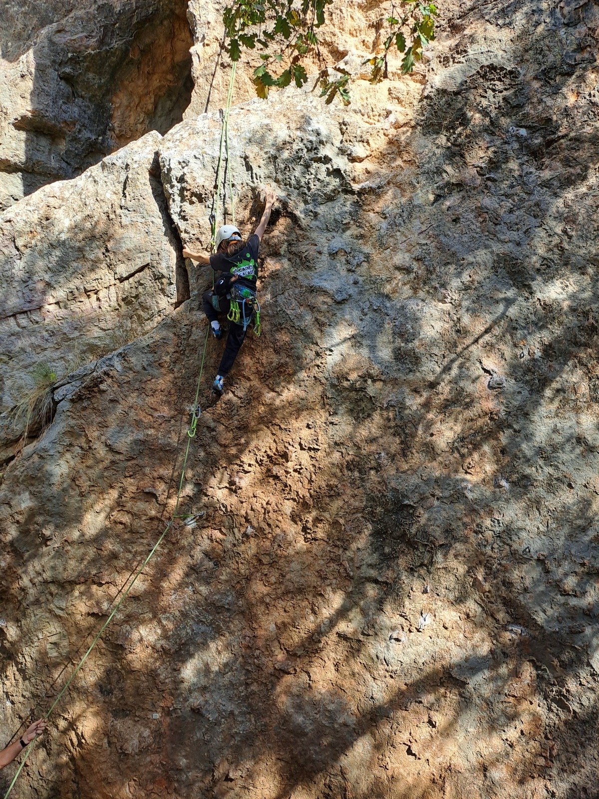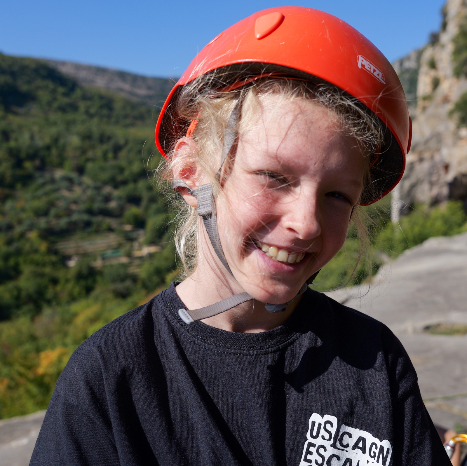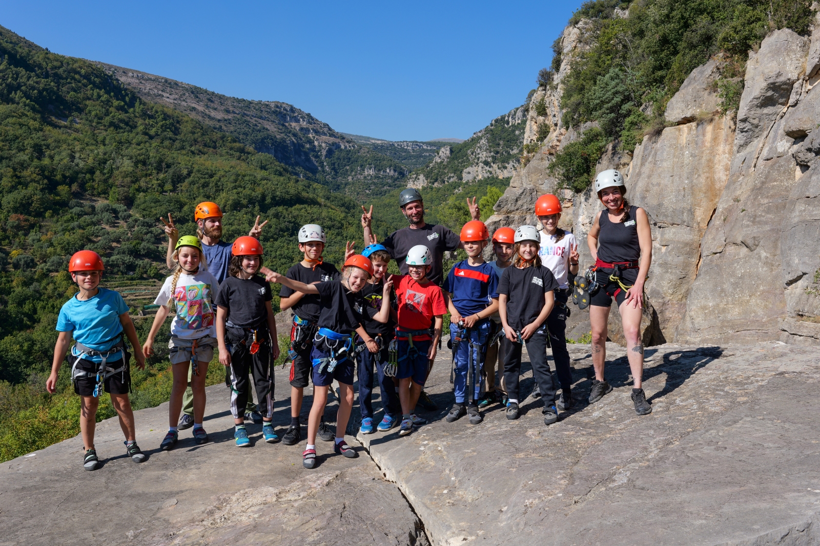 En haut Romain installe des moulinettes pour sa maman pendant que Milo et Alaric commencent leur moisson de croix car ils ont pour ambition de parcourir l’intégralité des voies du secteur ! Lois, après s’être échauffé, n’a pas de temps à perdre et file dans « Le spigolo ». Après avoir couiné dans les premiers mètres un poil lustrés, il s’envole jusqu’au relais de cette superbe voie. Amélie, qui a d’autres ambitions pour l’après-midi enchaîne les longueurs avec notamment « La niche » et « Saint d’esprit » où elle apprend à faire de l’artif à l’aide d’une dégaine lorsque un crux trop difficile lui fait face. Chloé n’est pas en reste et, avec l’aide de papa à l’assurage, enfile les voies comme des perles. L’heure passe, les ventres se creusent, il est temps pour nous d’avaler nos sandwichs et autres salades. En dessert, Dona nous régale de son désormais célèbre flan avec sa pointe de rhum. Miam miam et merci !