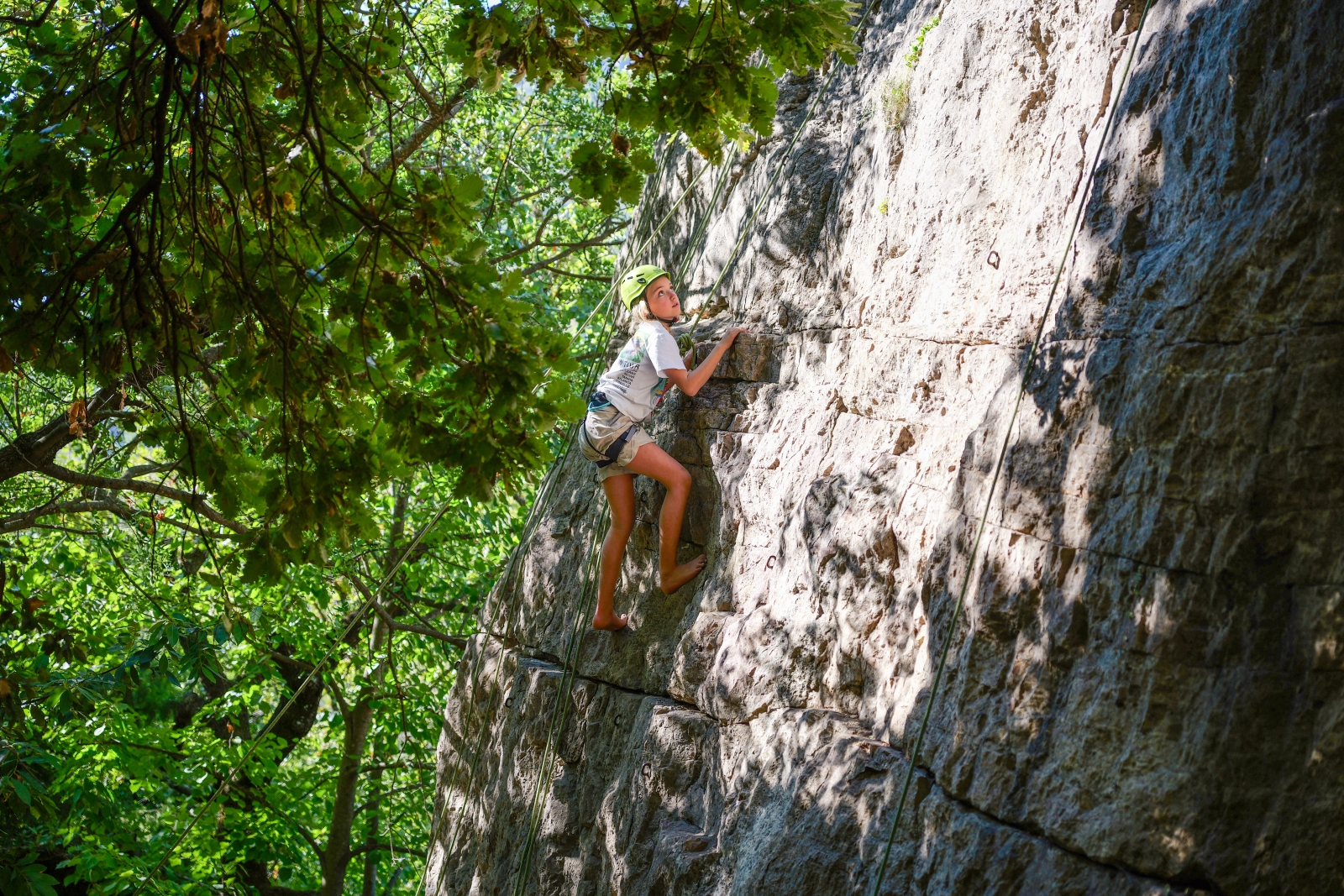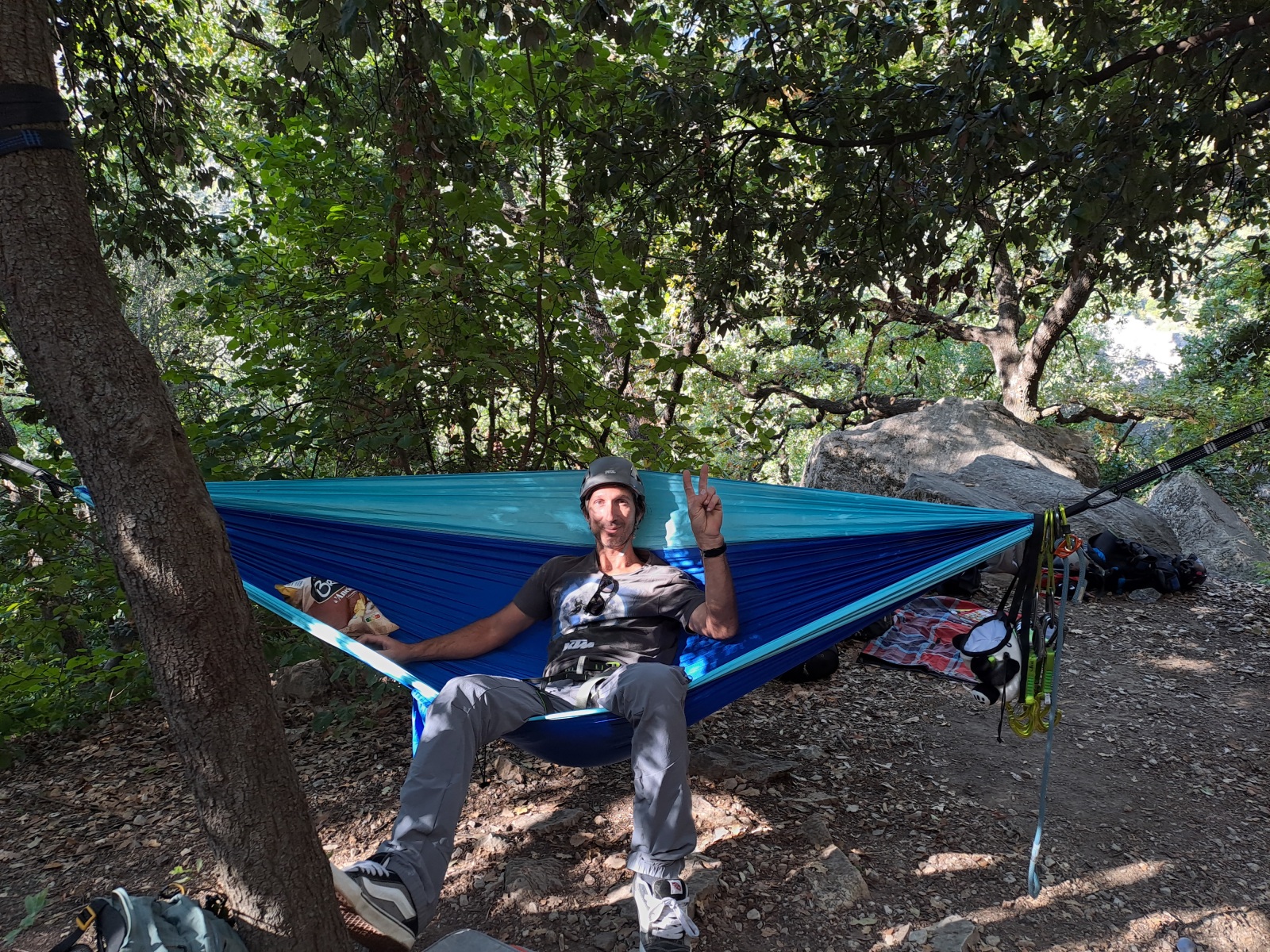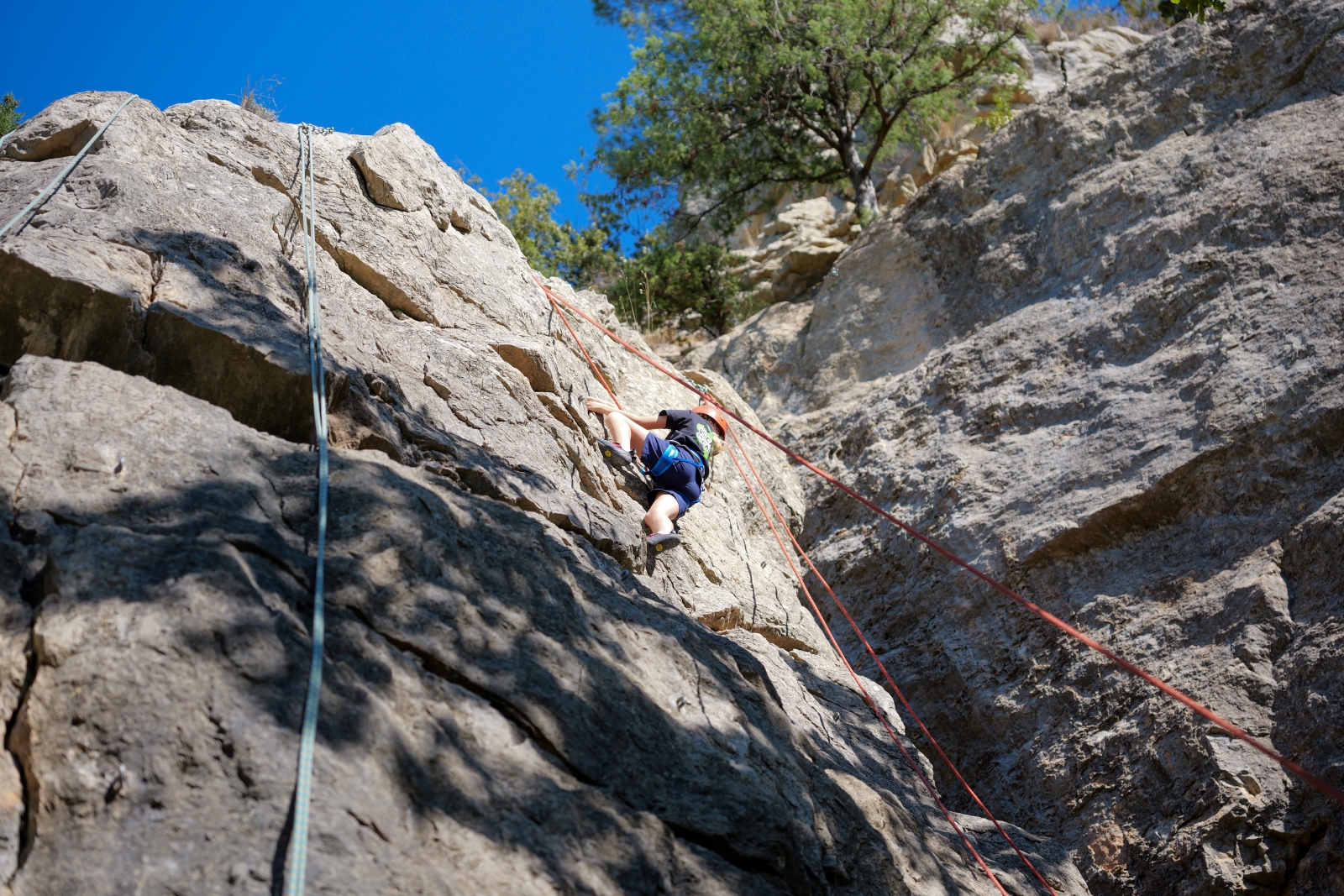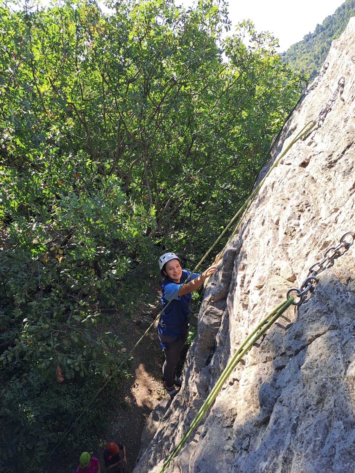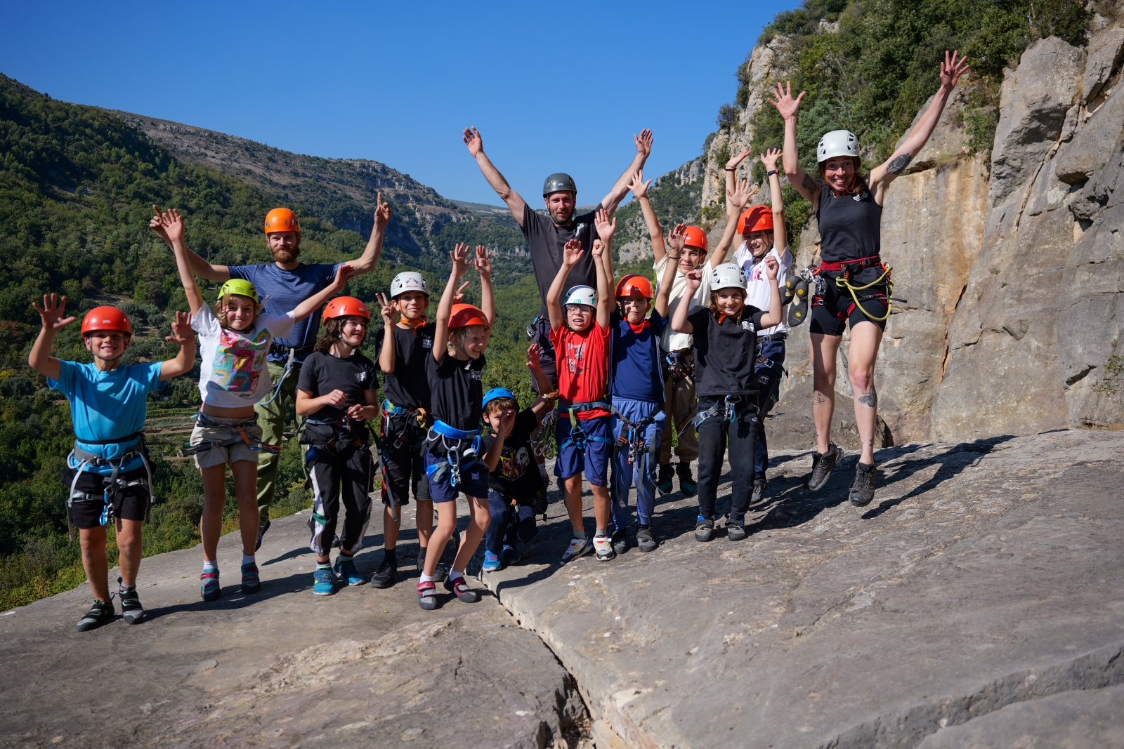 En haut Romain installe des moulinettes pour sa maman pendant que Milo et Alaric commencent leur moisson de croix car ils ont pour ambition de parcourir l’intégralité des voies du secteur ! Lois, après s’être échauffé, n’a pas de temps à perdre et file dans « Le spigolo ». Après avoir couiné dans les premiers mètres un poil lustrés, il s’envole jusqu’au relais de cette superbe voie. Amélie, qui a d’autres ambitions pour l’après-midi enchaîne les longueurs avec notamment « La niche » et « Saint d’esprit » où elle apprend à faire de l’artif à l’aide d’une dégaine lorsque un crux trop difficile lui fait face. Chloé n’est pas en reste et, avec l’aide de papa à l’assurage, enfile les voies comme des perles. L’heure passe, les ventres se creusent, il est temps pour nous d’avaler nos sandwichs et autres salades. En dessert, Dona nous régale de son désormais célèbre flan avec sa pointe de rhum. Miam miam et merci !