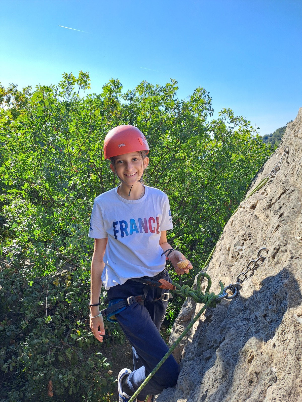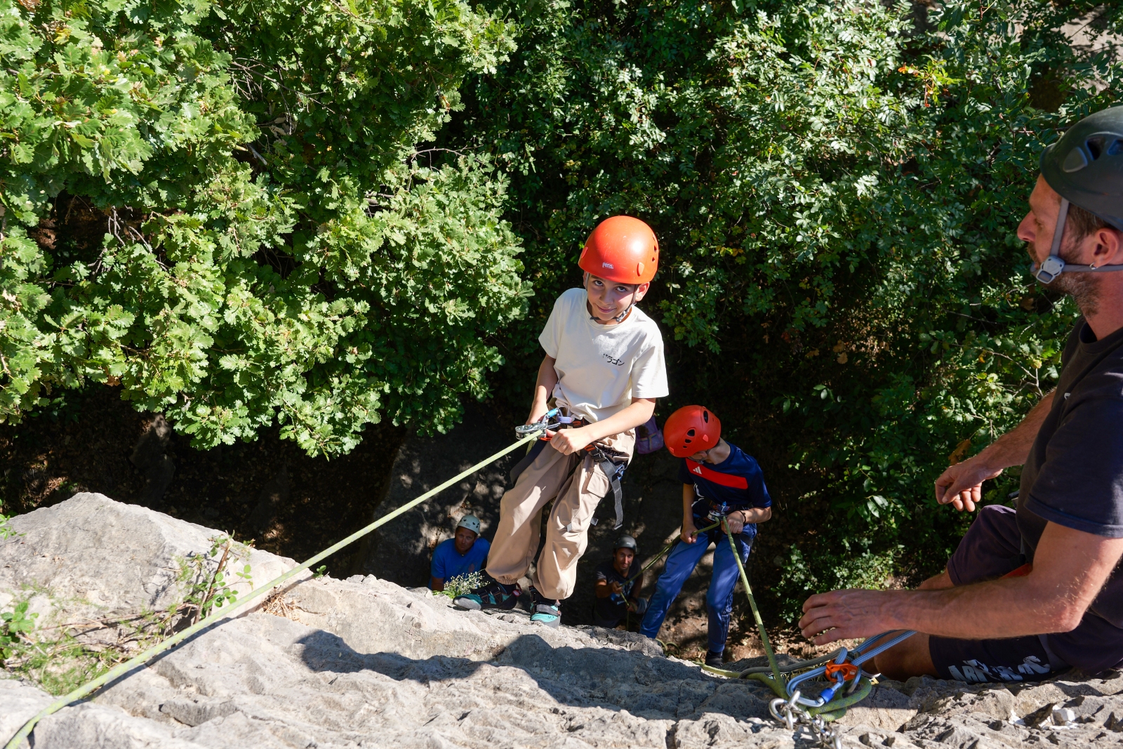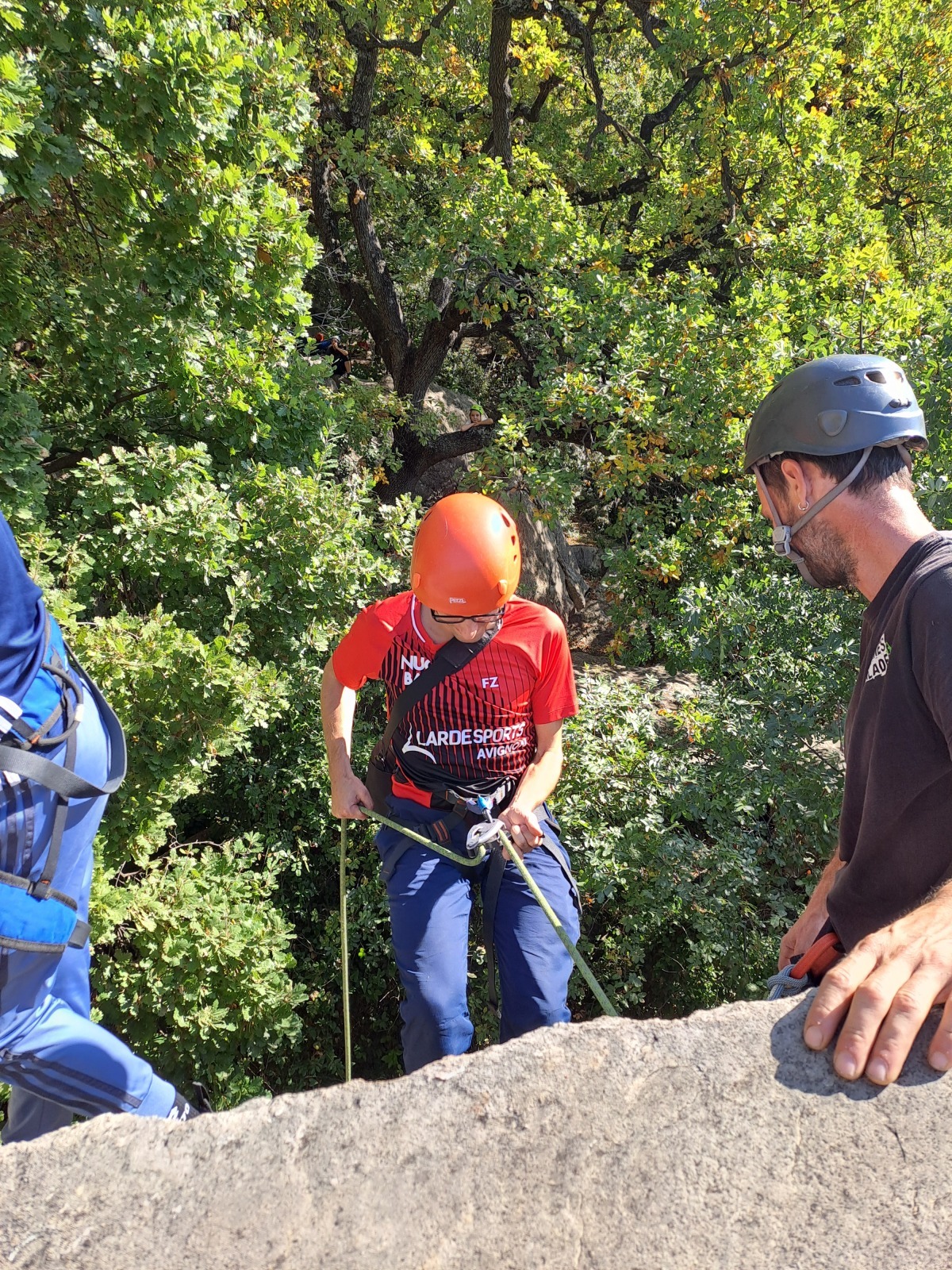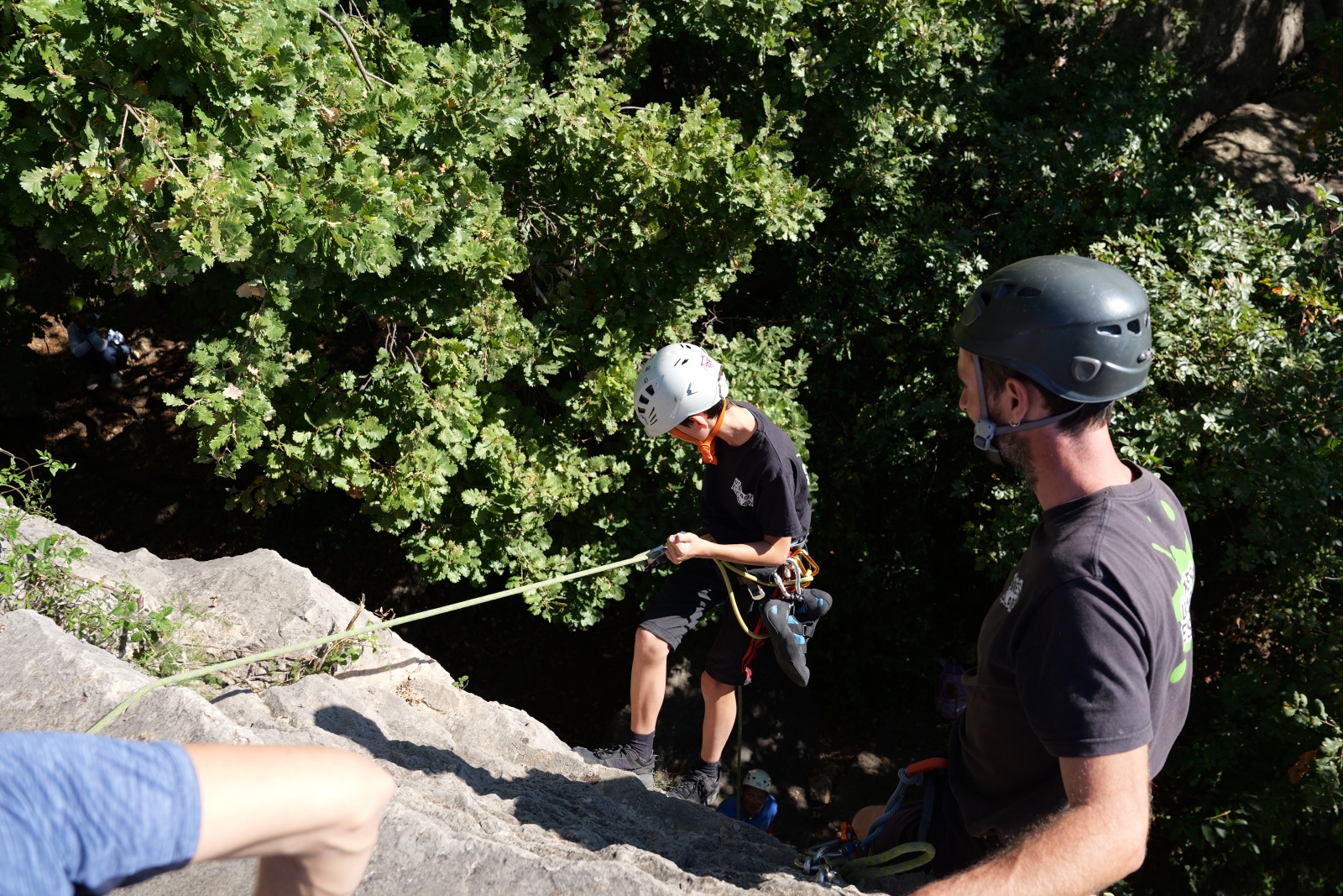 Post prandial, certains nous quittent mais pour le restant du groupe un atelier rappel est organisé. Nous montons tous sur ce que l’on appellera le bout de caillou de Julien puis d’ici, deux cordes rejoignent le sol. Les uns après les autres, aidés par un grigri, les jeunes s’encordent puis effectuent un rappel en autonomie. Une appréhension est parfois palpable mais chacun s’en tire avec les honneurs, Sylas et Anton demandant même un second tour.
