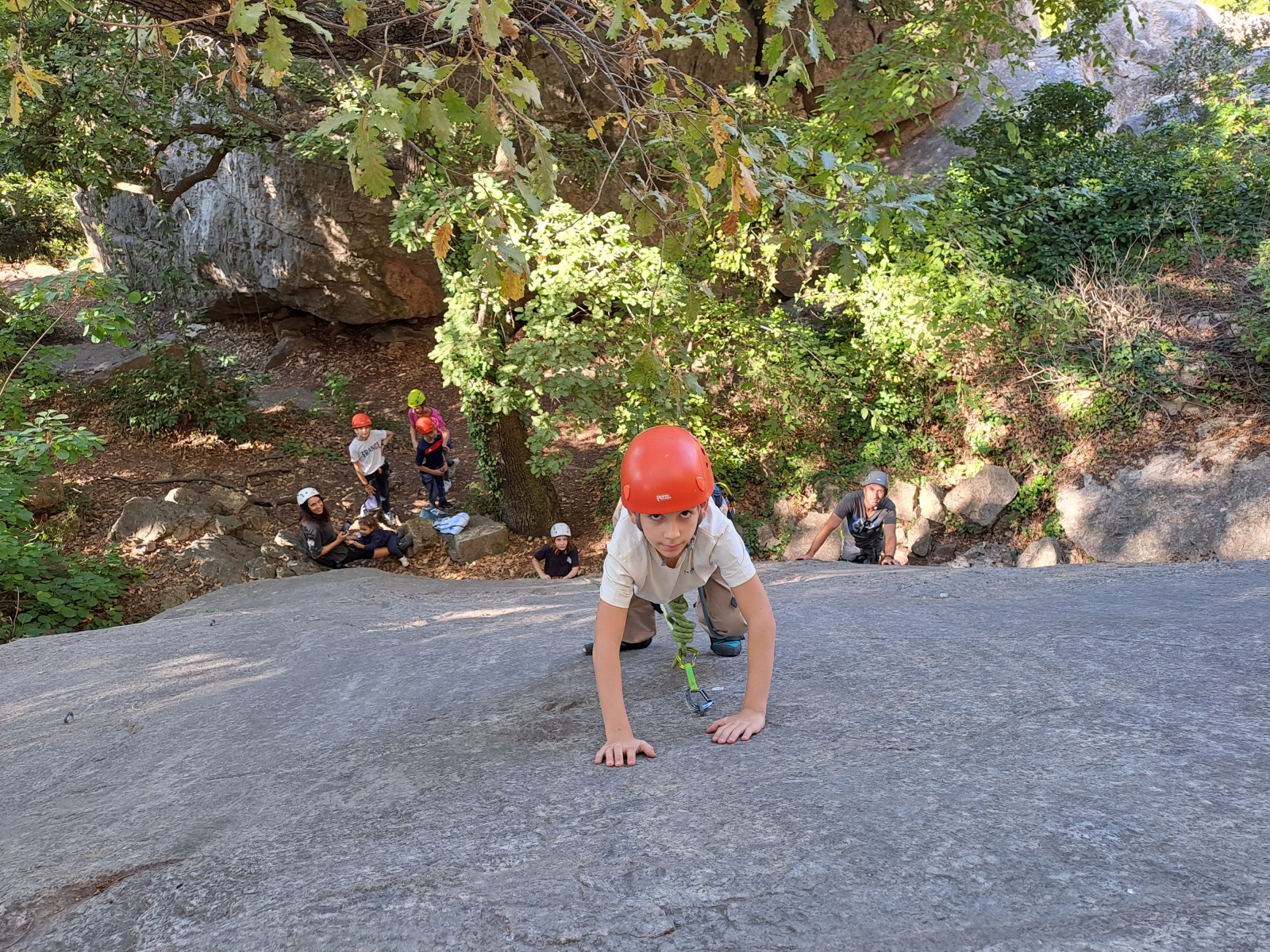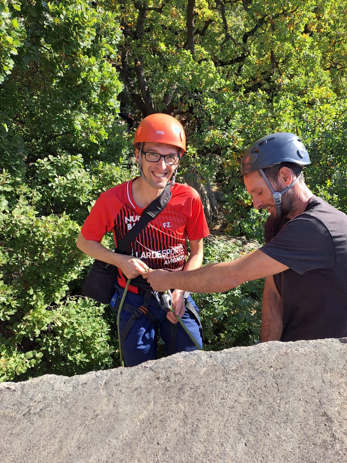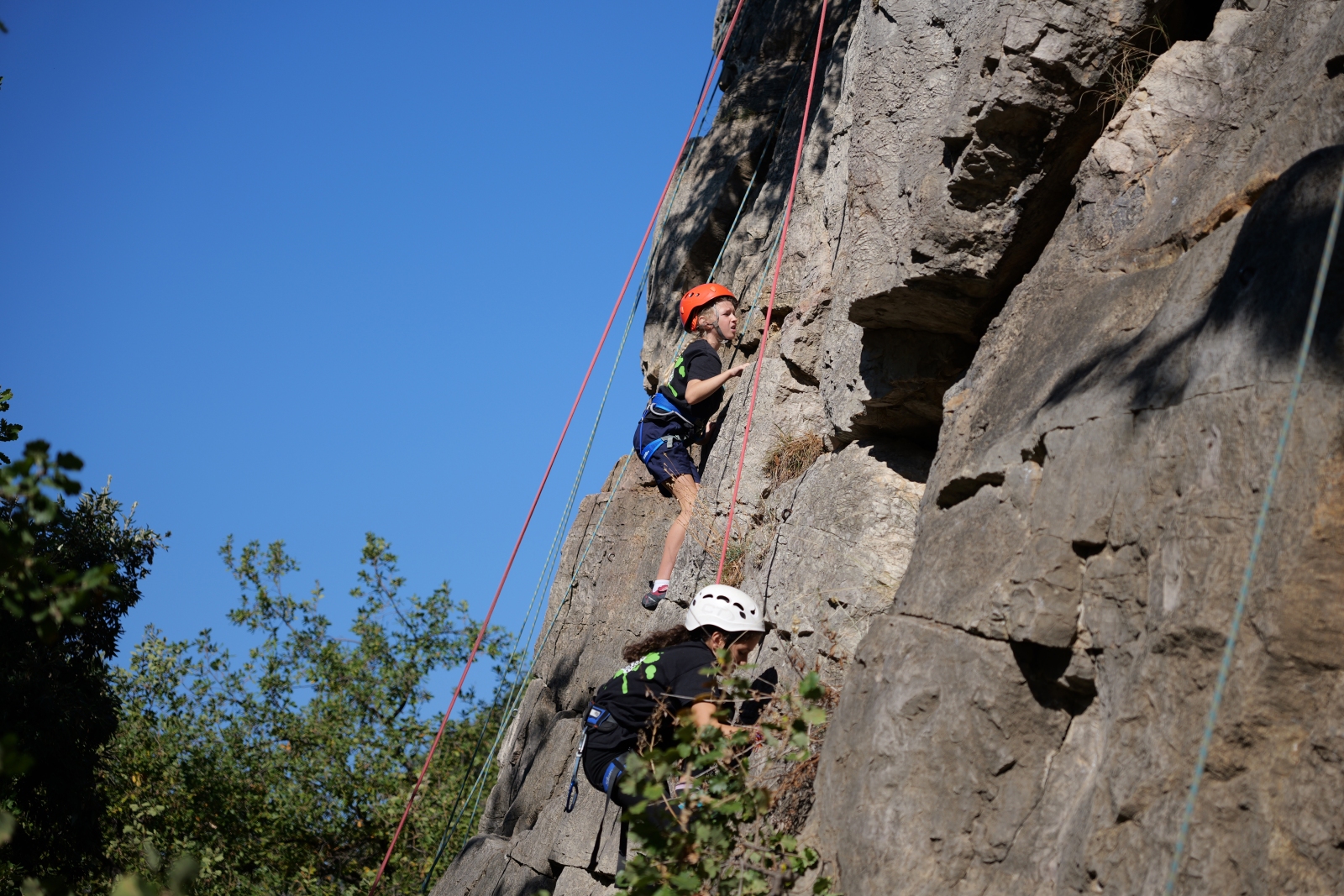 Post prandial, certains nous quittent mais pour le restant du groupe un atelier rappel est organisé. Nous montons tous sur ce que l’on appellera le bout de caillou de Julien puis d’ici, deux cordes rejoignent le sol. Les uns après les autres, aidés par un grigri, les jeunes s’encordent puis effectuent un rappel en autonomie. Une appréhension est parfois palpable mais chacun s’en tire avec les honneurs, Sylas et Anton demandant même un second tour.