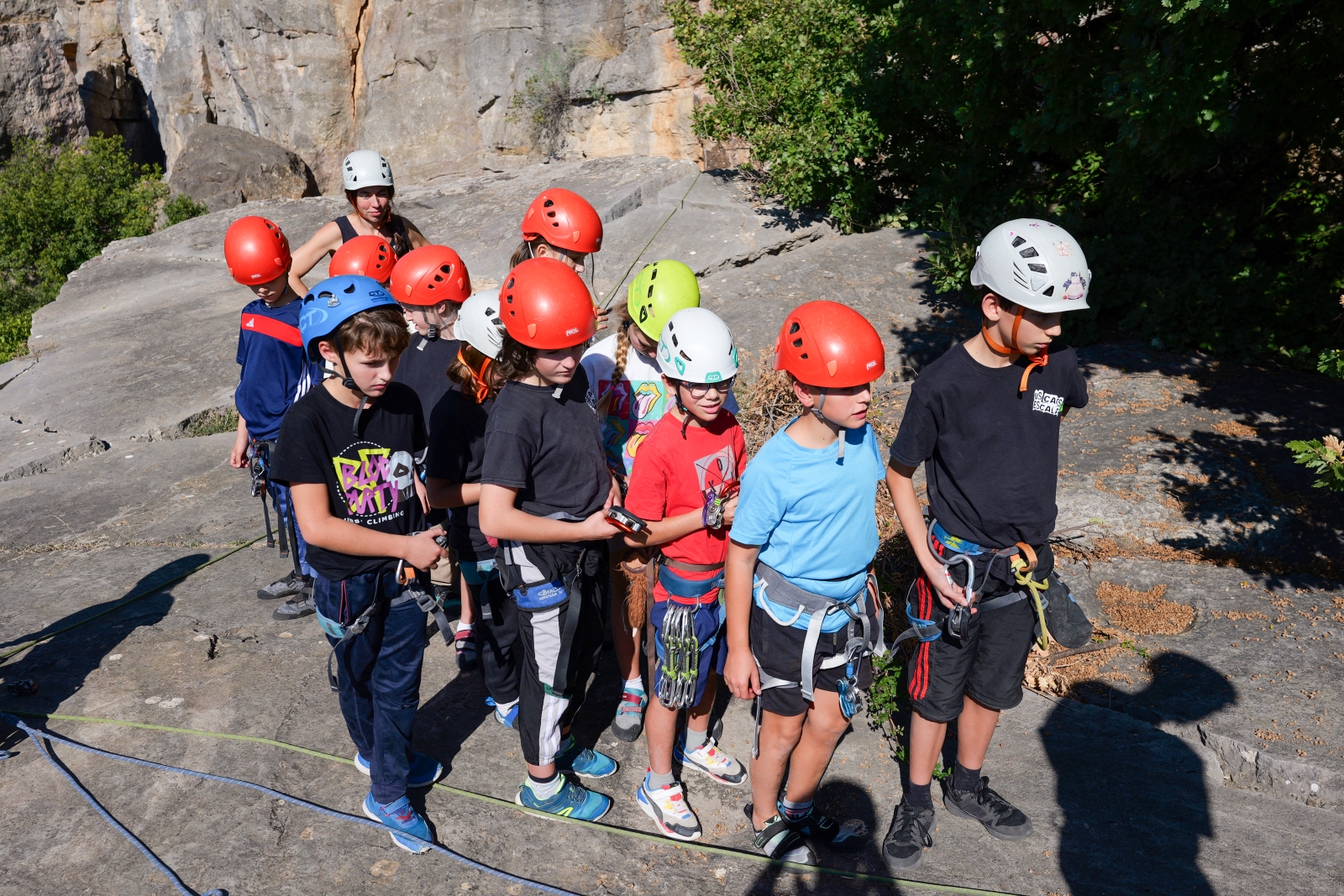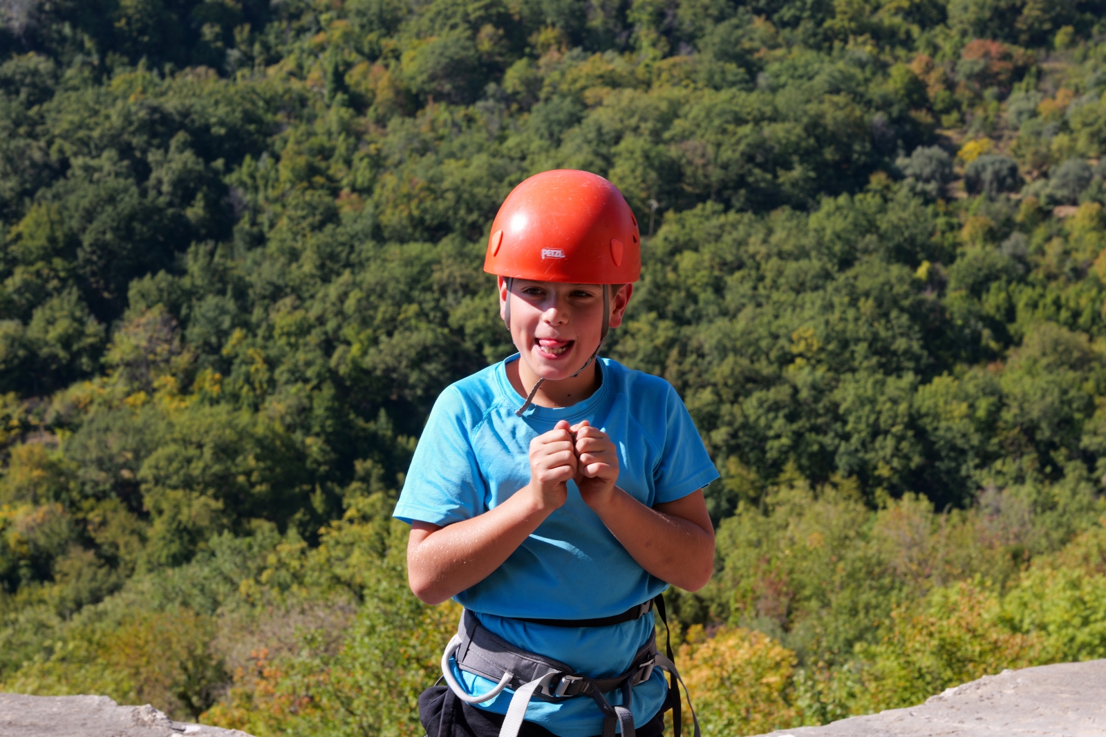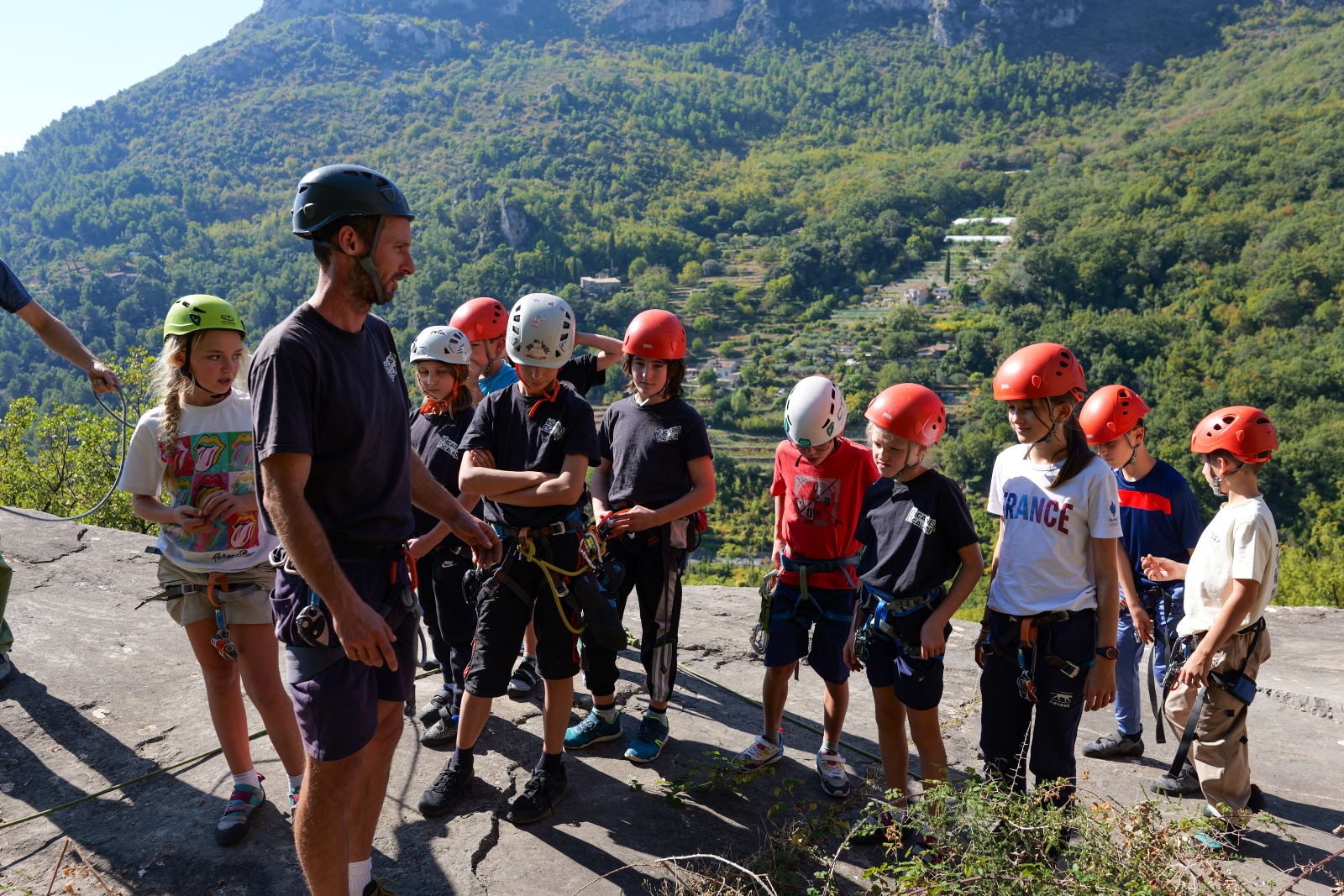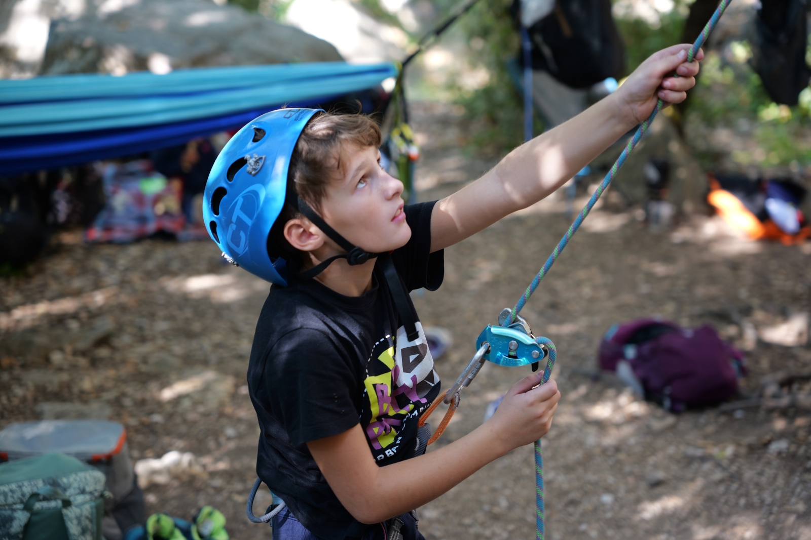 Post prandial, certains nous quittent mais pour le restant du groupe un atelier rappel est organisé. Nous montons tous sur ce que l’on appellera le bout de caillou de Julien puis d’ici, deux cordes rejoignent le sol. Les uns après les autres, aidés par un grigri, les jeunes s’encordent puis effectuent un rappel en autonomie. Une appréhension est parfois palpable mais chacun s’en tire avec les honneurs, Sylas et Anton demandant même un second tour.
