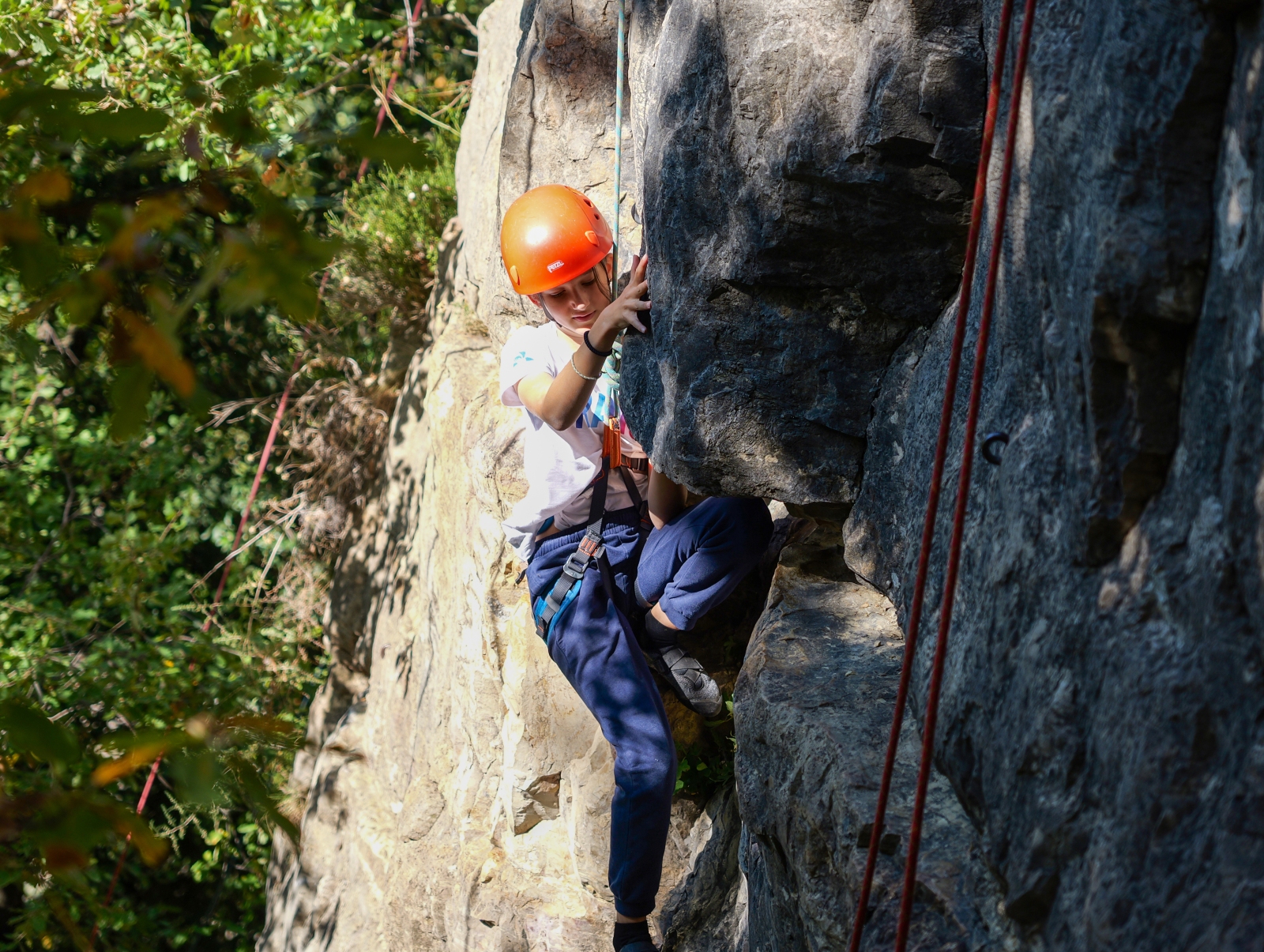 Côté escalade et au vu de la qualité du groupe, cet après-midi une large place est accordée à la grimpe en tête. Rosemary, en plus d’avoir appris à ses camarades à siffler avec la cupule d’un gland de chêne, se montre courageuse et gravit « Esteban » une voie très dalleuse demandant une grande confiance en ses pieds. Bravo ! Léon et Robin qui sont plutôt en mode tranquille sortent de leur confort en réalisant « La patine noire » une voie franchement déroutante de part sa cruelle absence de prises. Sylas et Julie signent leur performance de la journée en parvenant au relais de la « Knubel », une fissure caractéristique demandant placement et sang froid. Julie fait même une pierre deux coups en installant la corde dans une voie à proximité. Kim, qui ne se laisse pas facilement impressionner, s’équipe et va défier en tête » Croûte chef » un 6c d’époque à petite réglette. Elle parvient à mi voie mais malheureusement la suite, trop difficile a raison de ses dernières velléités. Romain tente alors sa chance, il réussira à monter un cran plus haut mais sera stoppé à son tour par le caractère morpho du pas de bloc.