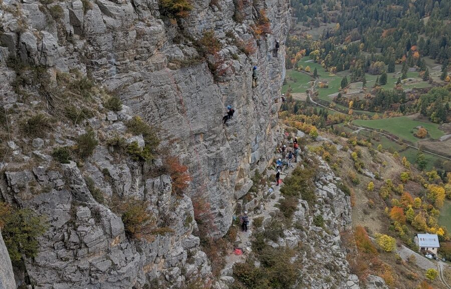 Tout le monde est à l’heure, certains en avance ont même préparé un peu de café et Matthieu le moyen fournit le groupe en beignets avant d’attaquer la marche d’approche de soit-disant 20 minutes. Nous traversons le village bucolique, puis attaquons la montée, de plus en plus sévère à mesure que nous approchons de la falaise. Les couches de vêtements nécessaires lors de l’attente au parking se retrouvent vite dans les sacs. Lorsque les derniers arrivent au secteur, les premiers ont déjà enfilé les baudriers et sont prêts à attaquer les premières longueurs. Le pied de falaise étant une vire plus ou moins large suivant les endroits, je complète les consignes de sécurité de base, casque, ligne de vie, faire attention quand on se croise, puis le groupe s’éparpille sur la cinquantaine de voies que nous offre le premier niveau du site.