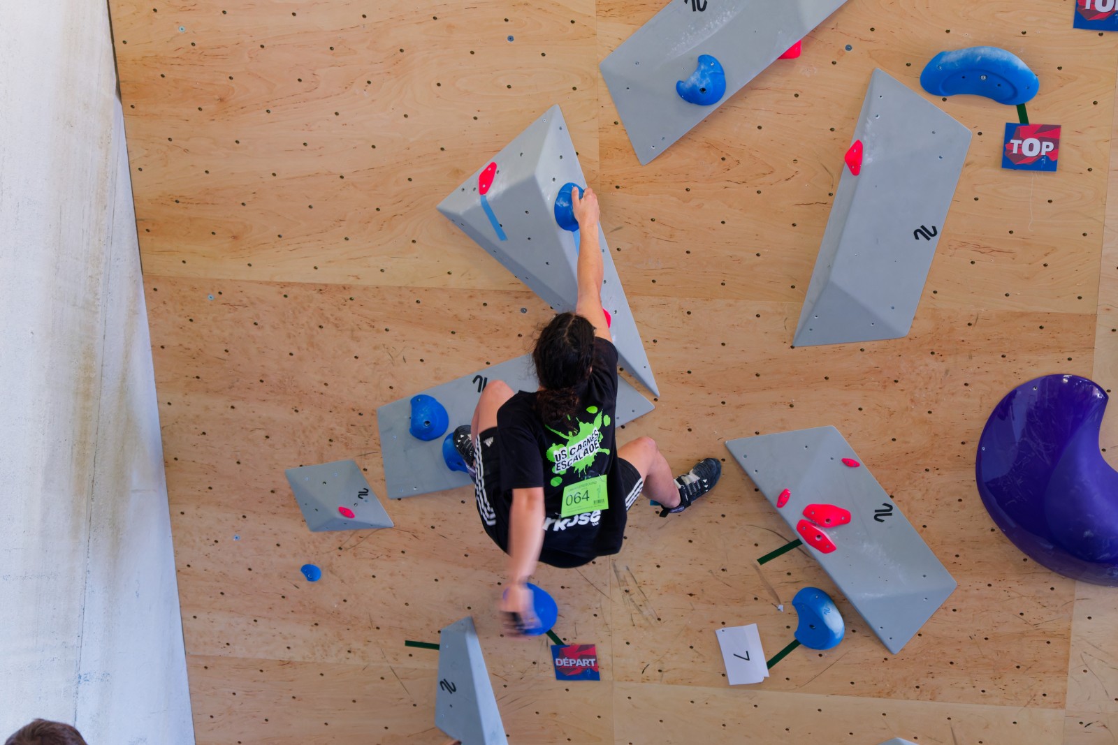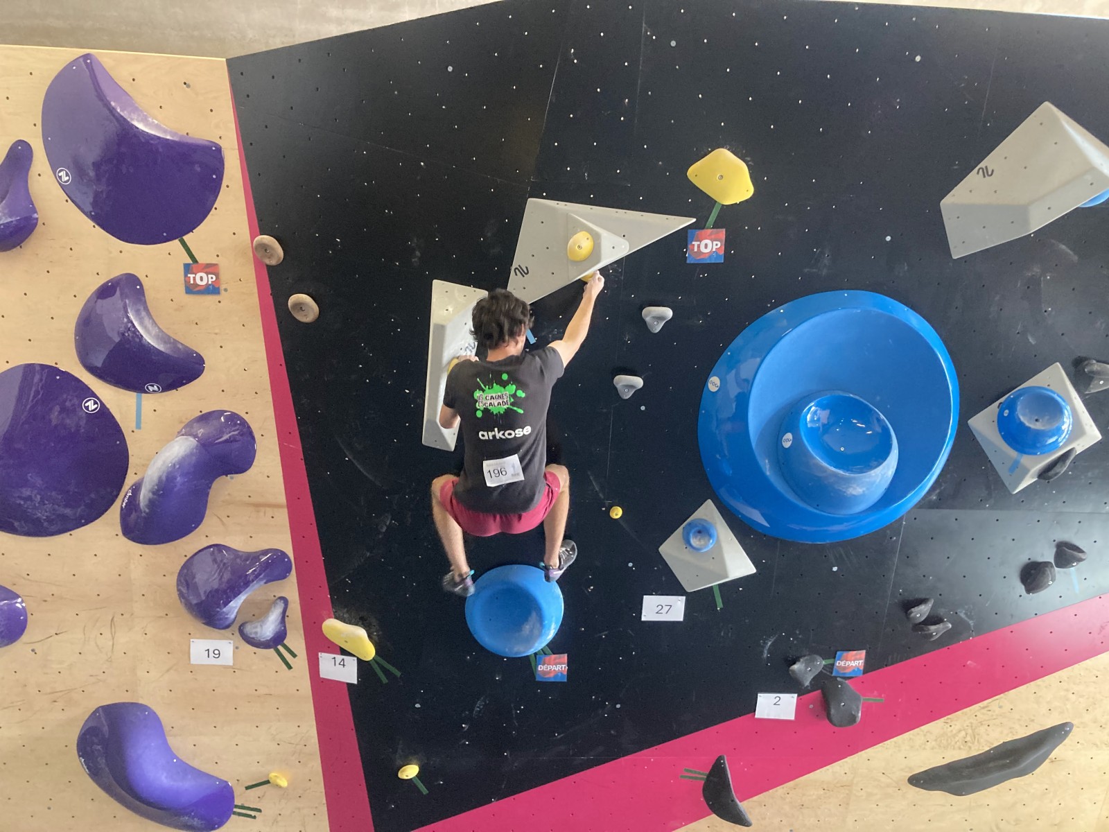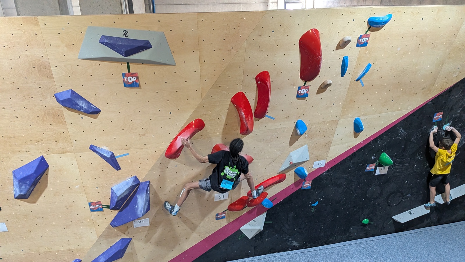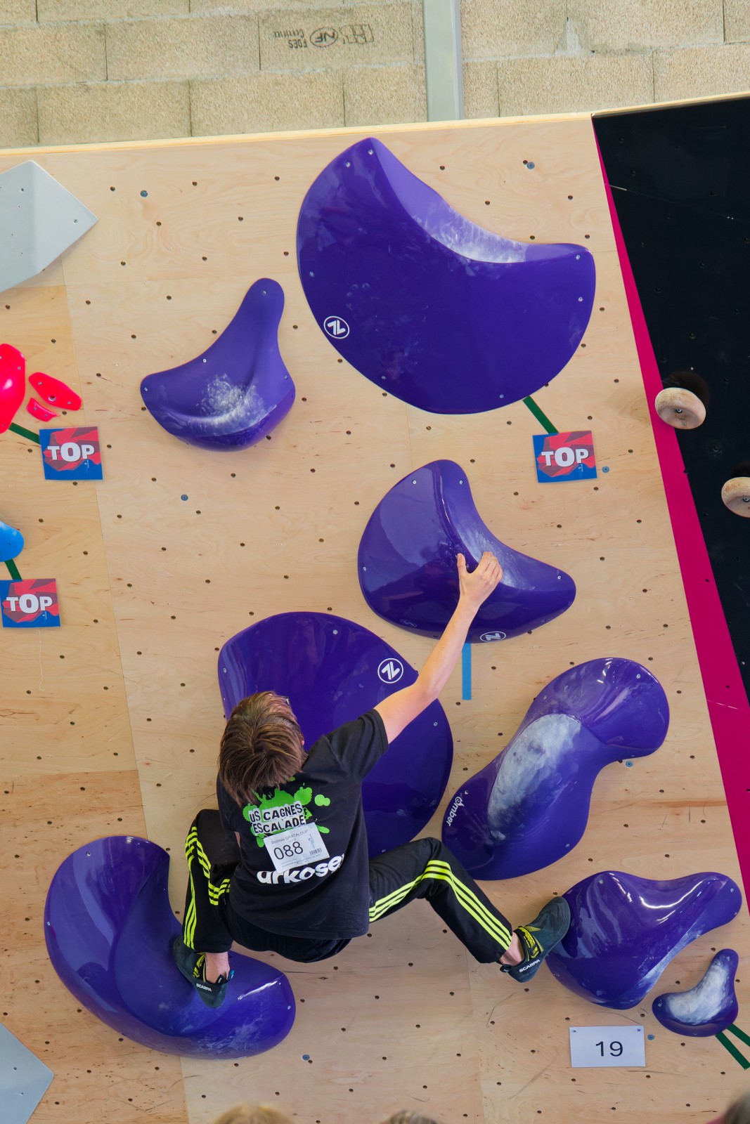 Nathan, de son côté, n’a pas encore trop de stratégie mais une énergie incroyable. Je le vois mettre des essais à la chaîne, à tel point que je suis obligé de le freiner un peu. Mais il fait son bonhome de chemin et ne se laisse pas impressionner par les blocs durs : il essaie tout ! Il finit avec 11 blocs au compteur et 3 zones et une belle 10ème place. Ça progresse sérieusement !