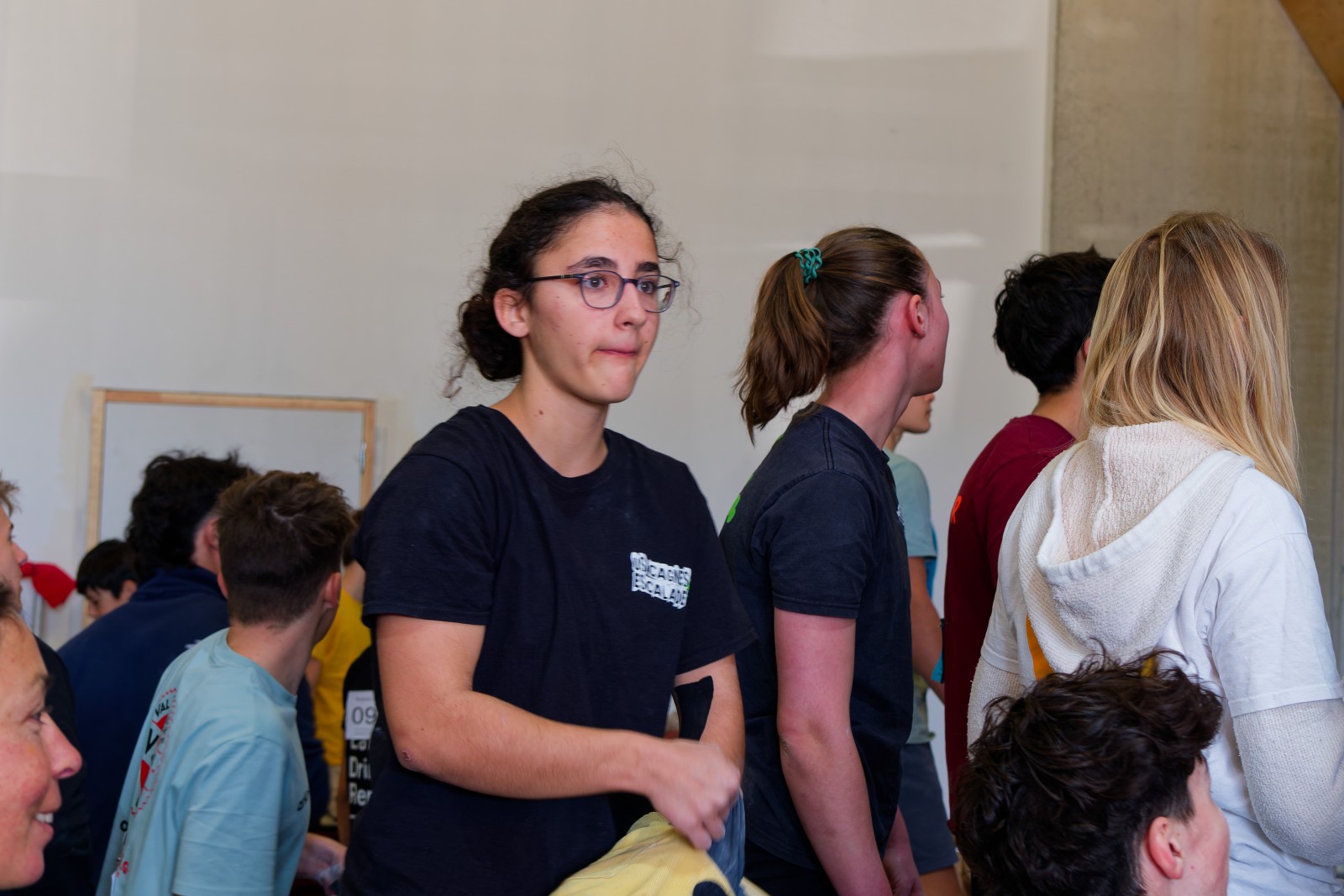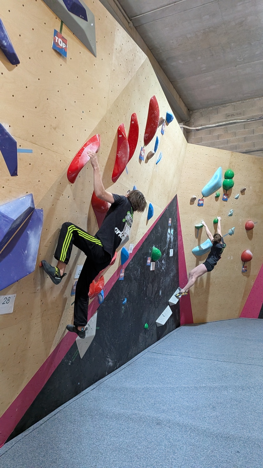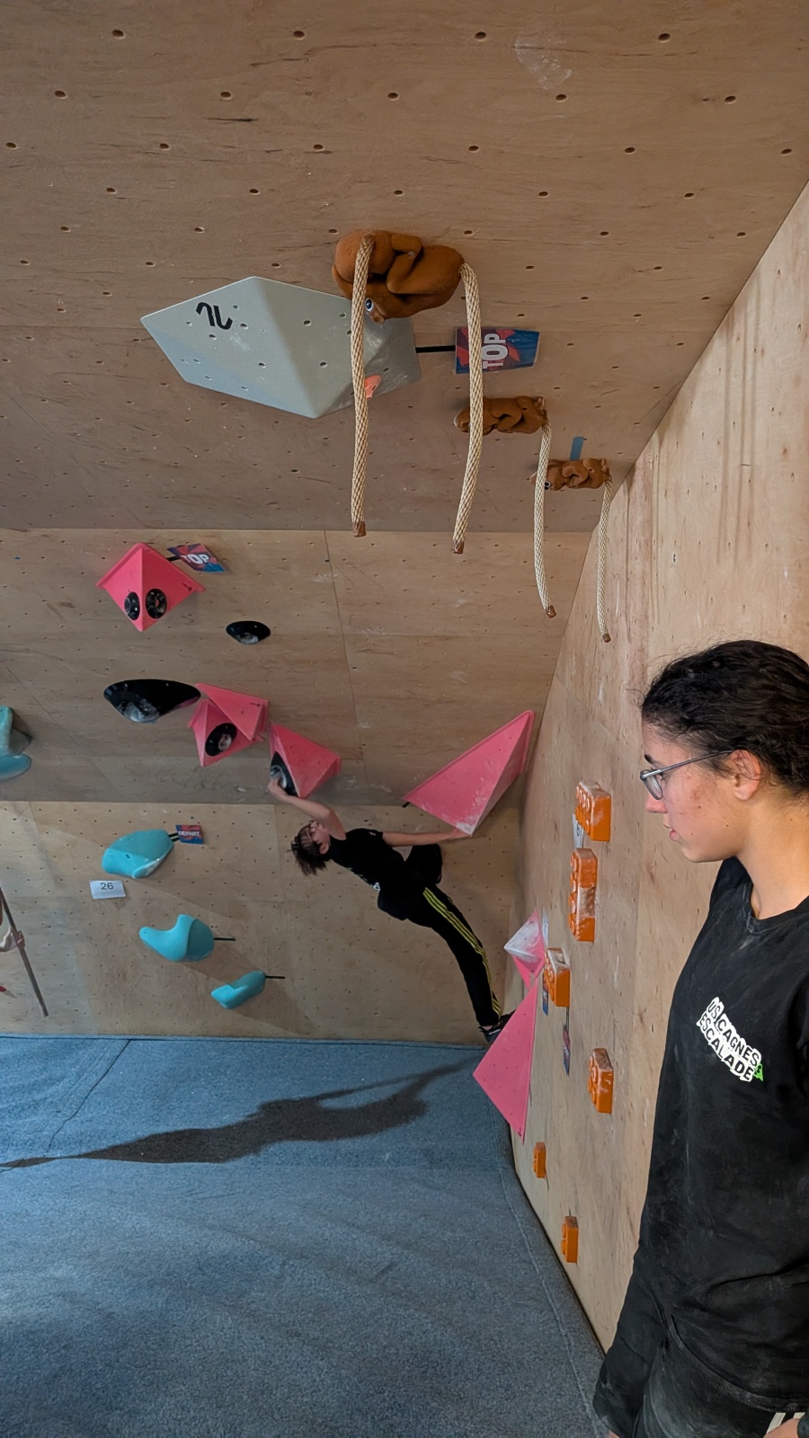 Le matin, c’est donc les U15 qui attaquent avec Lya, Mélia et Rose chez les filles, Nathan, Yann et Mani chez les garçons. Comme la salle est vaste, les blocs ont pu être ouverts intelligemment et sans trop se croiser. On n’est pas les uns sur les autres et tout le monde peut circuler assez facilement. Milan, notre stagiaire, est présent également pour suivre nos jeunes grimpeurs.