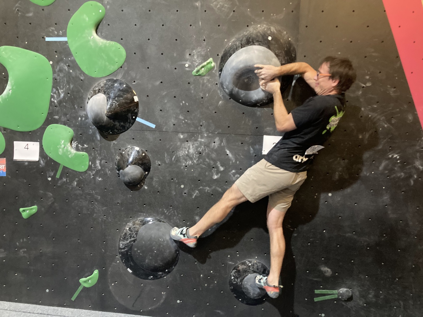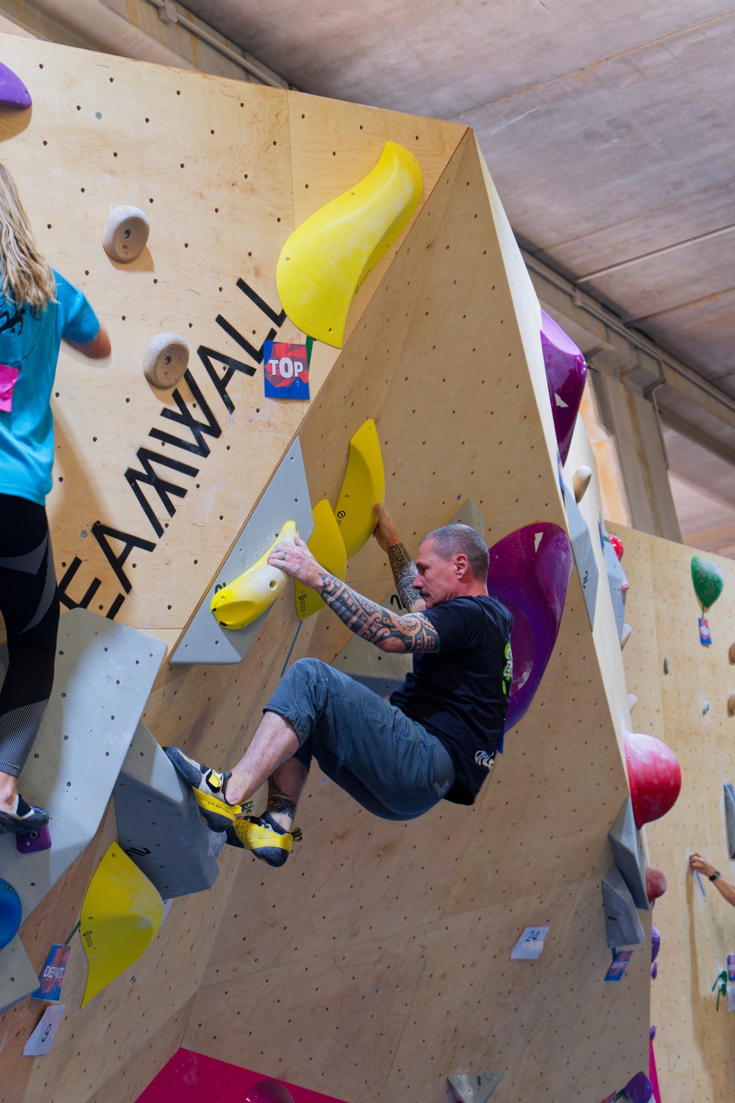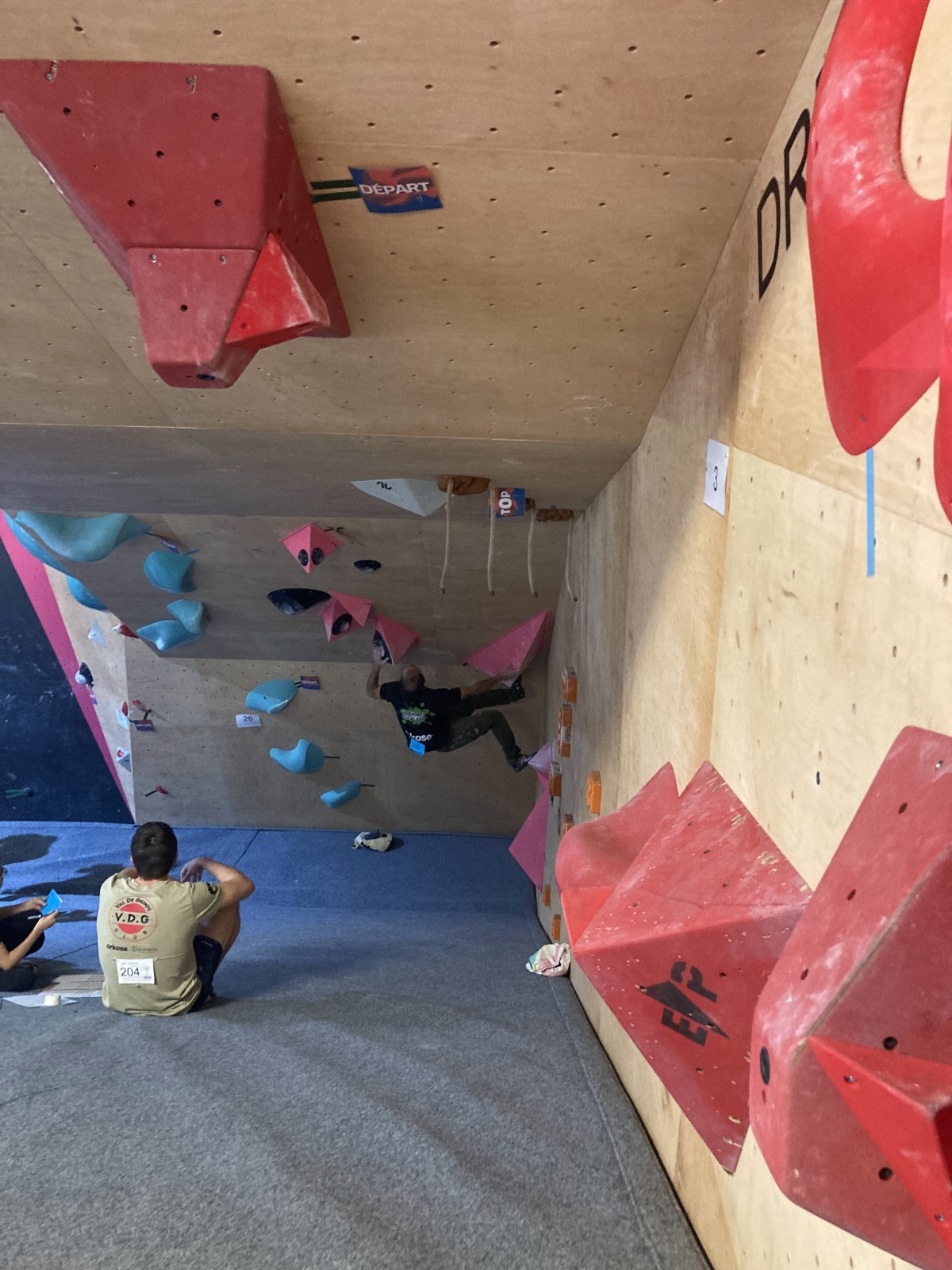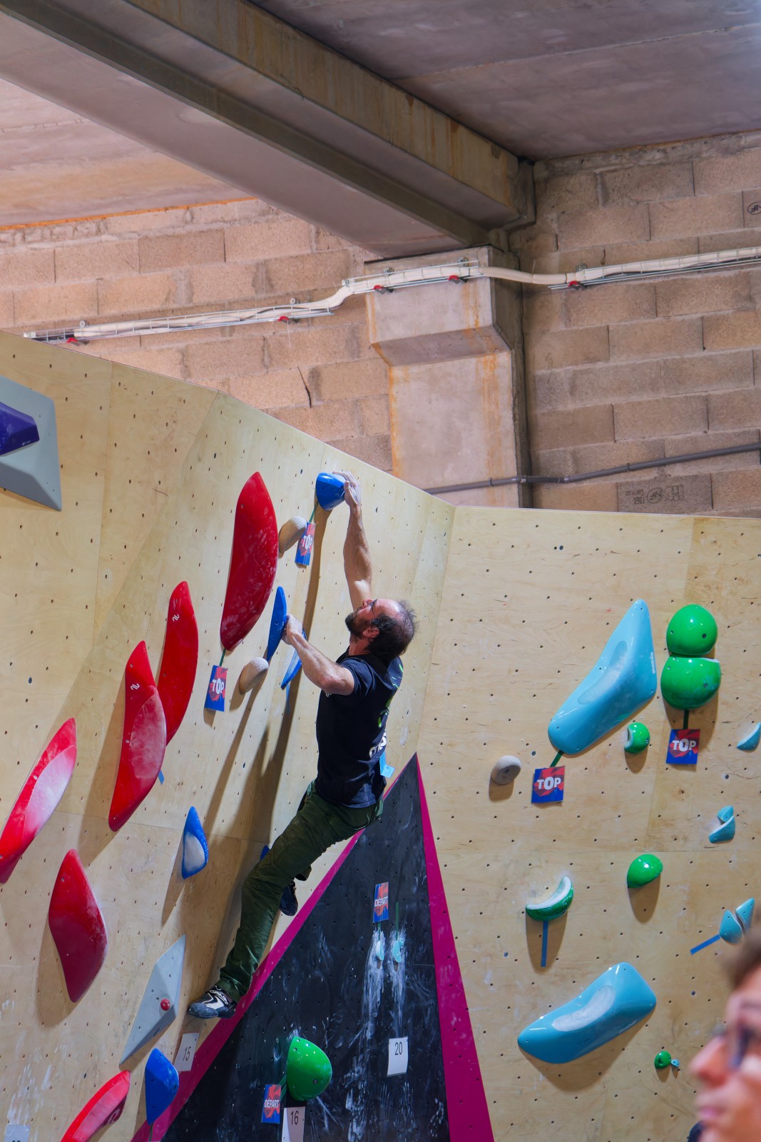Fred est un peu rouillé et les douleurs sont au rendez-vous. Il se bat comme il peut mais il est d’une époque où la grimpe dynamique n’existait même pas ! Il grimpe 9 blocs et se classe 6ème.