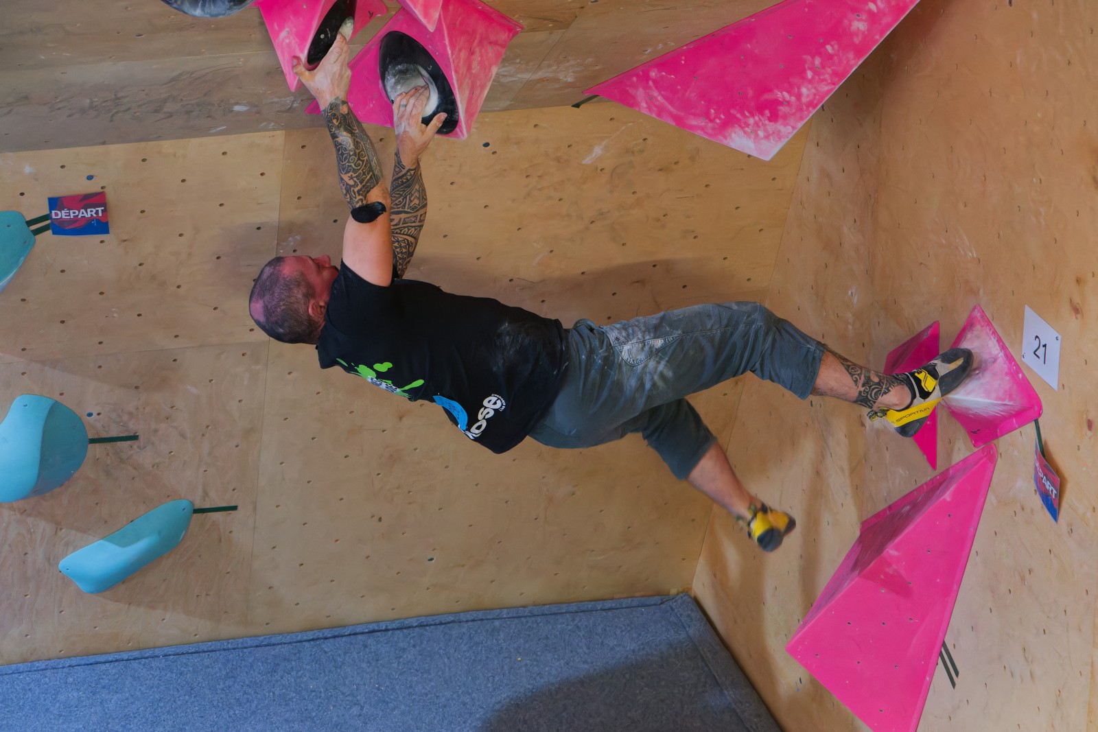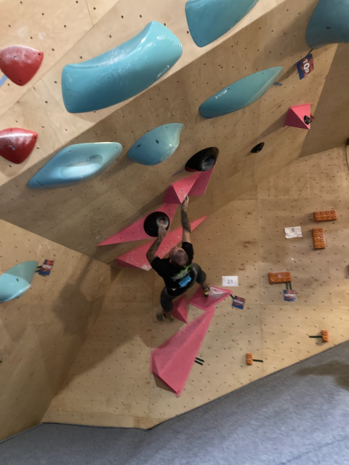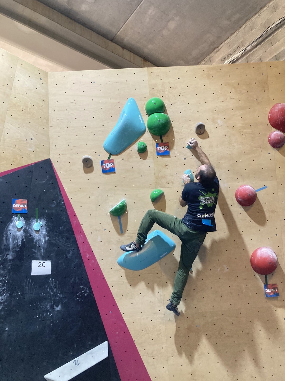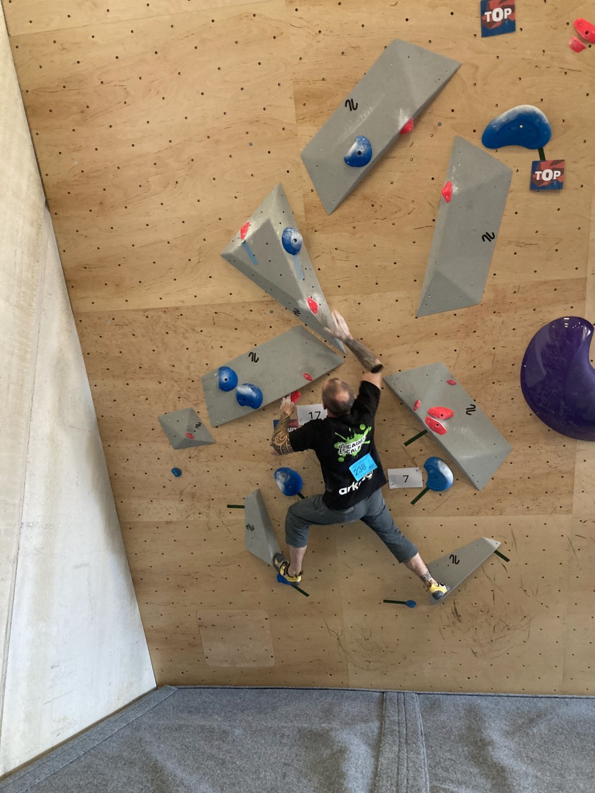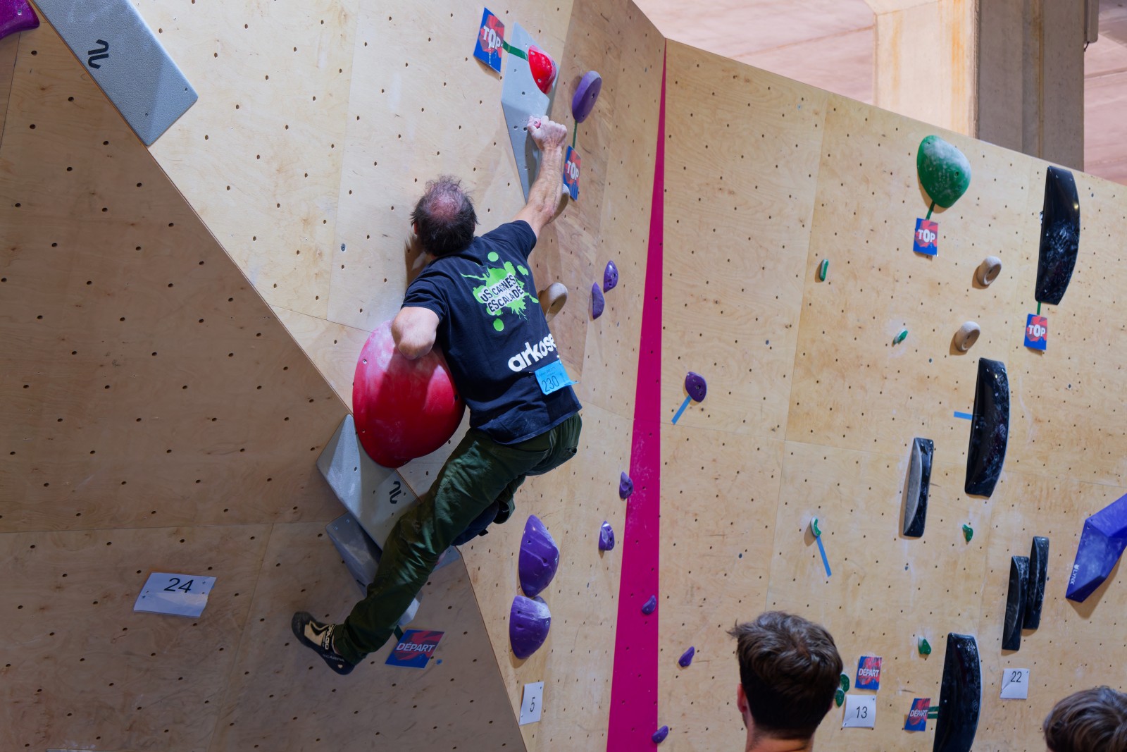 Fred est un peu rouillé et les douleurs sont au rendez-vous. Il se bat comme il peut mais il est d’une époque où la grimpe dynamique n’existait même pas ! Il grimpe 9 blocs et se classe 6ème.