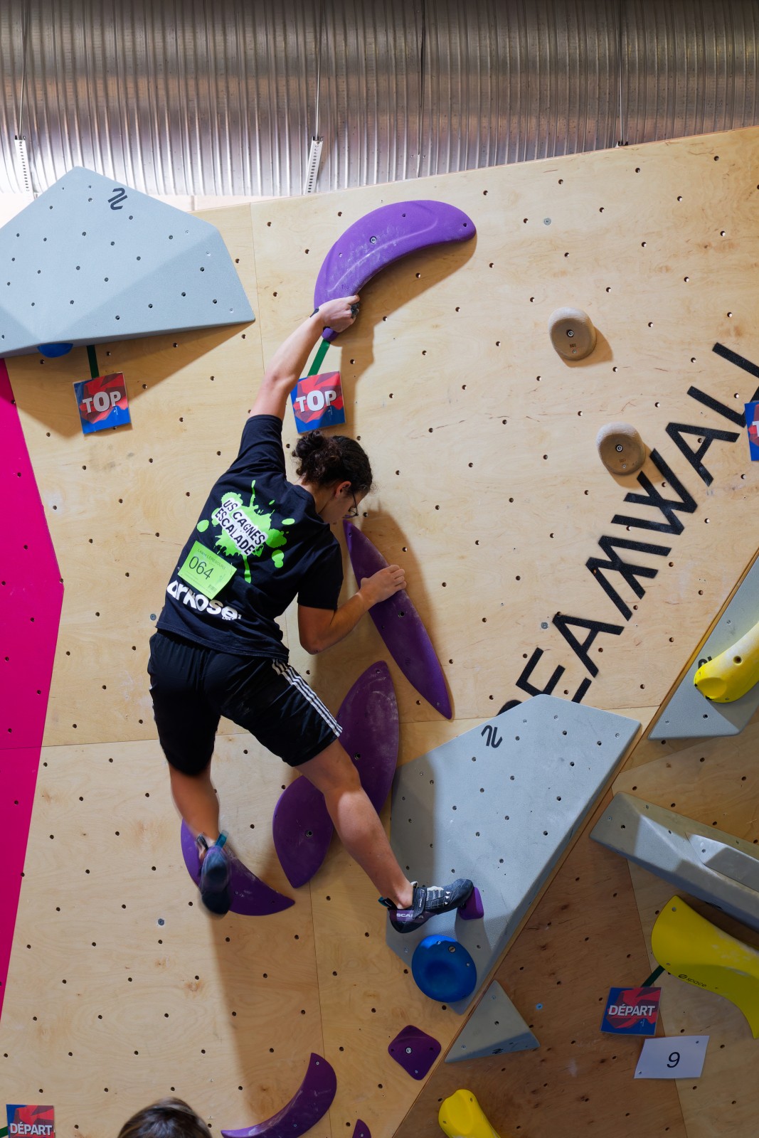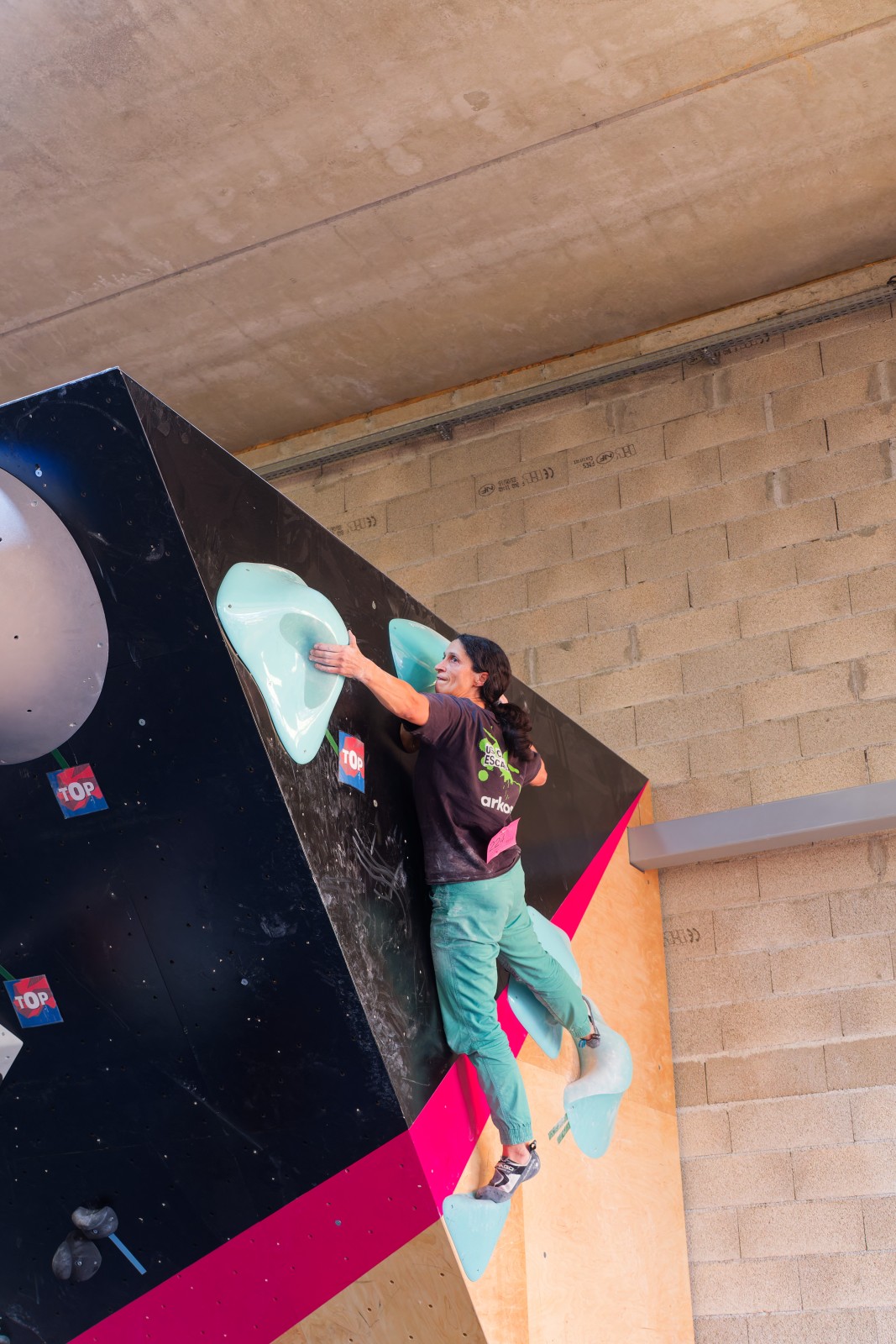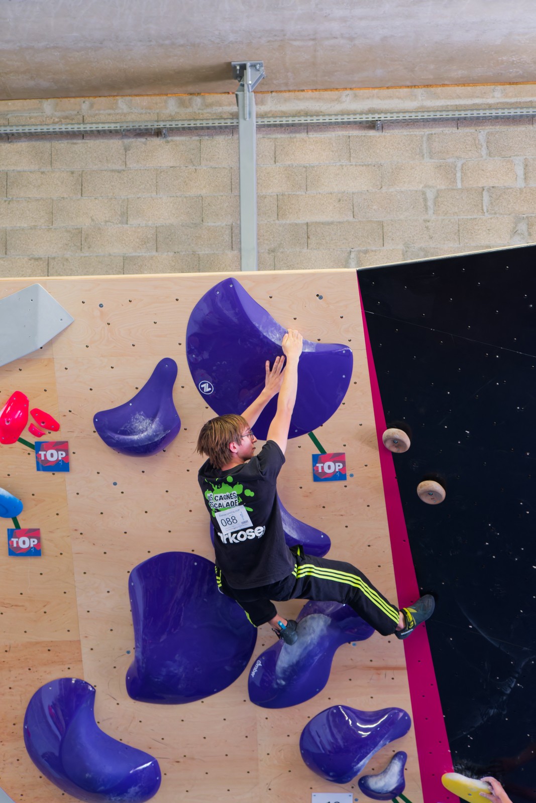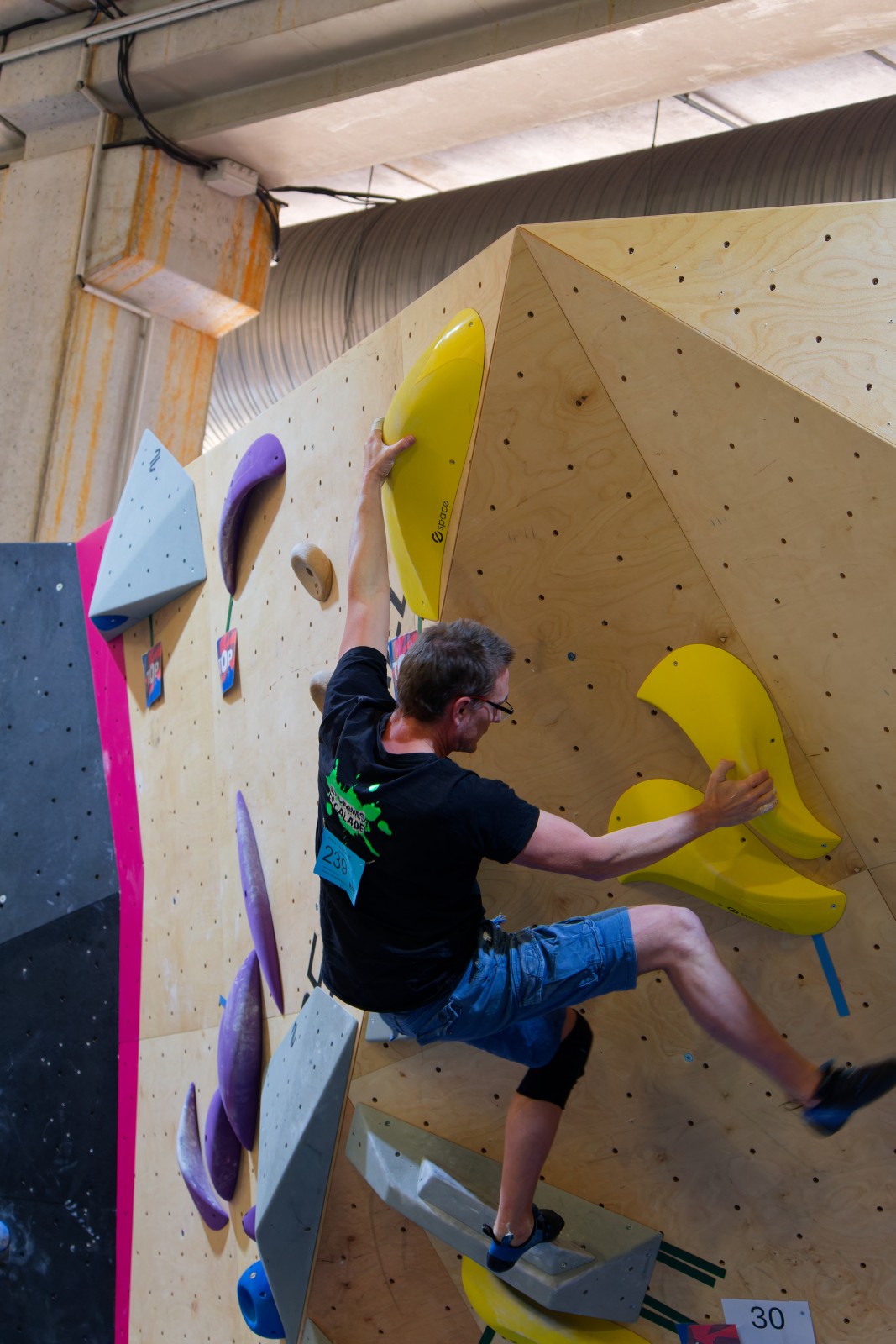 Fred est un peu rouillé et les douleurs sont au rendez-vous. Il se bat comme il peut mais il est d’une époque où la grimpe dynamique n’existait même pas ! Il grimpe 9 blocs et se classe 6ème.