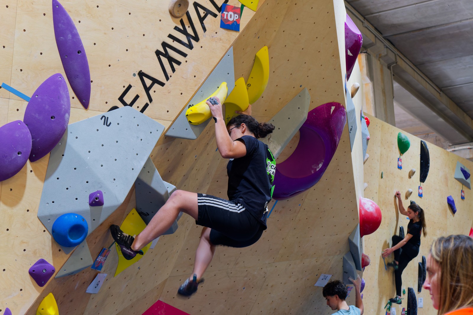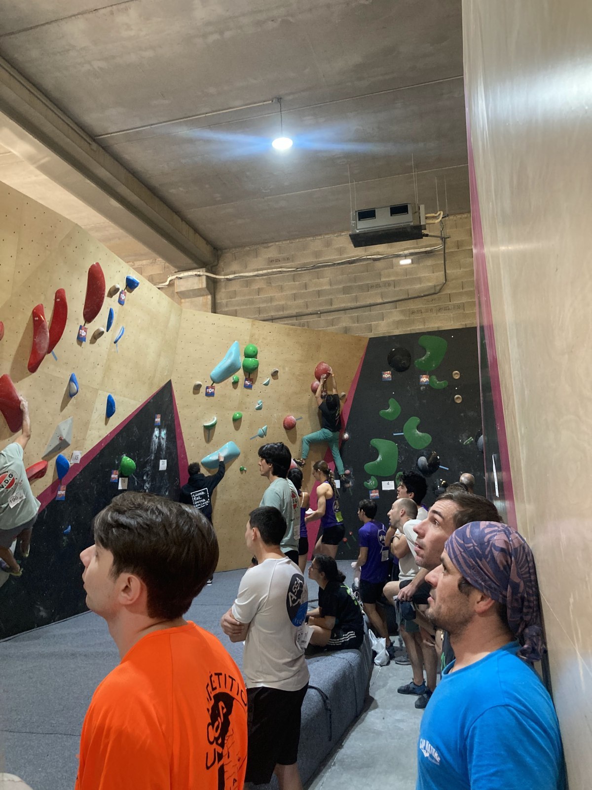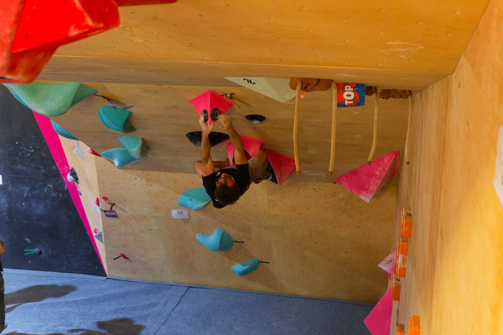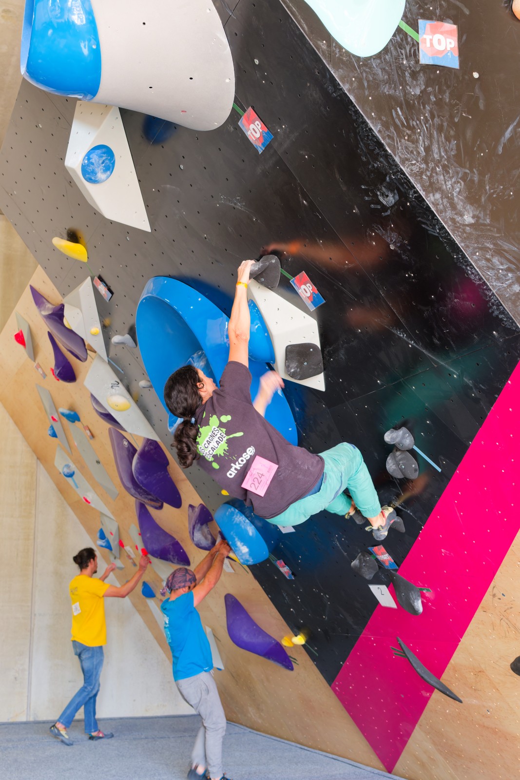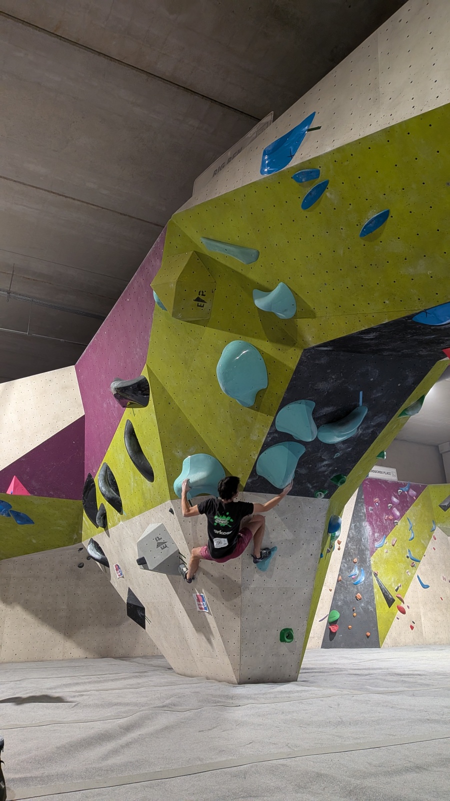 Fred est un peu rouillé et les douleurs sont au rendez-vous. Il se bat comme il peut mais il est d’une époque où la grimpe dynamique n’existait même pas ! Il grimpe 9 blocs et se classe 6ème.