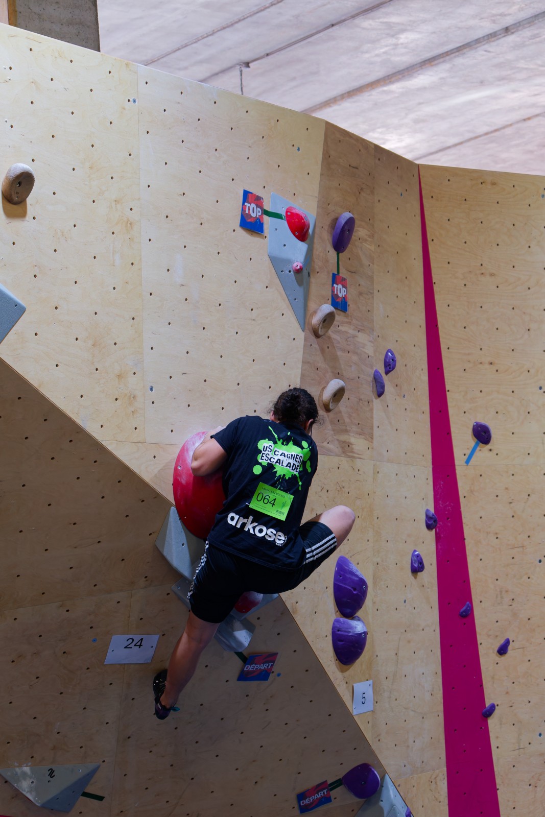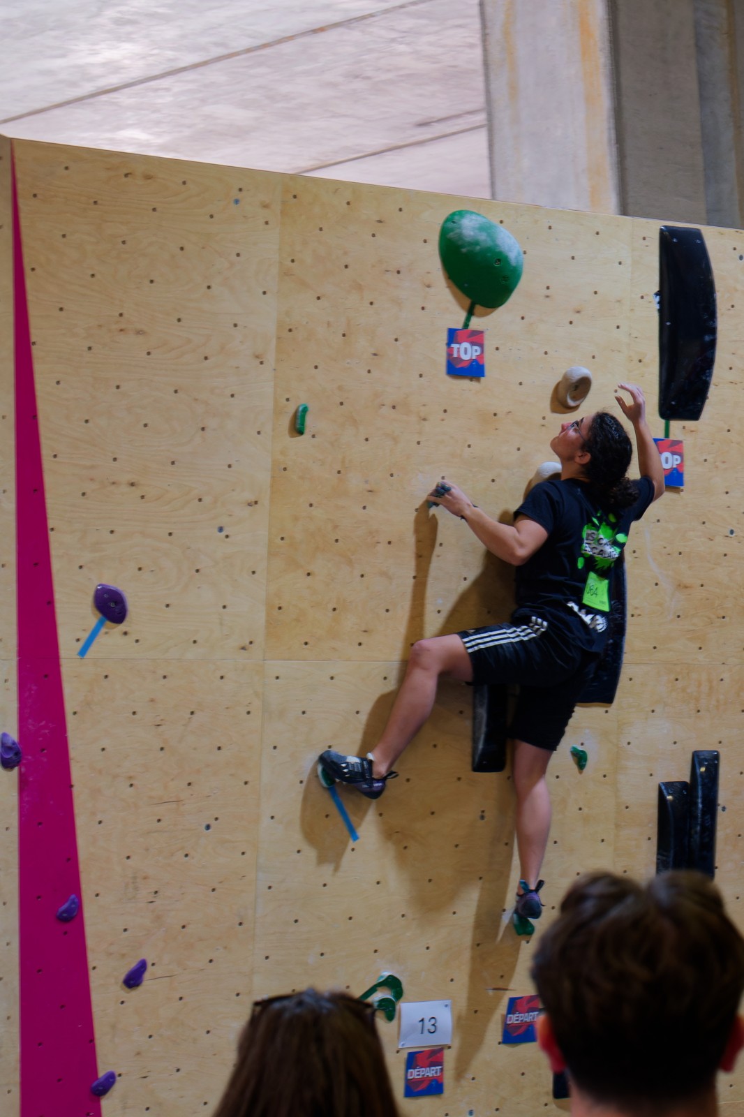 Rose, à l’instar de Mani, se fait un peu dérouiller en début de vague et perd également le contrôle de ses émotions. Je ressors alors le speech que je viens de faire. Elle se libère un peu et s’acharne dans ses blocs durs avec parfois une réussite bien méritée comme dans le 13. C’est ça que les jeunes ont parfois du mal à comprendre : il faut rester concentré et mobilisé, même si le passage paraît impossible. Analyser les raisons de la chute, faire les micro ajustements et progresser à chaque essai, ça finira peut-être par passer ! Et si ça ne suffit pas, au moins on aura tout donné et aucun regret ! Elle sort 12 blocs et 2 zones et prend la 9ème place.
