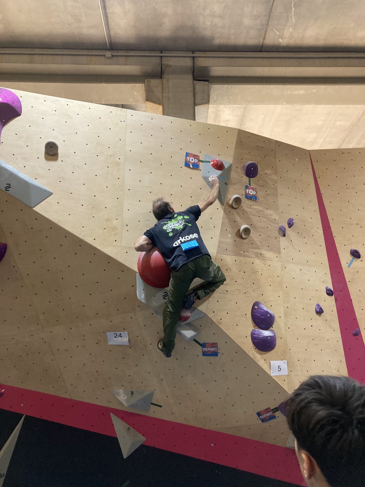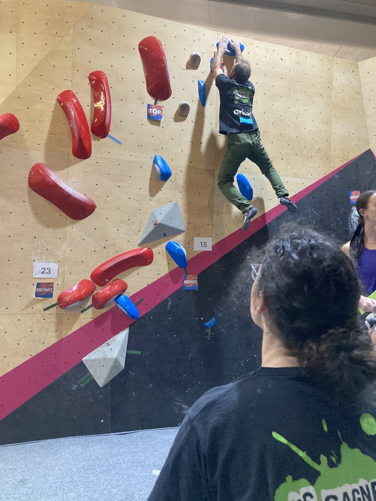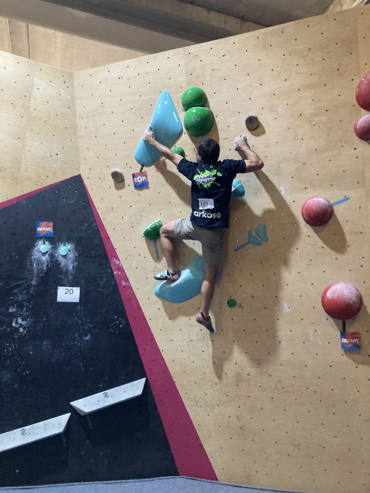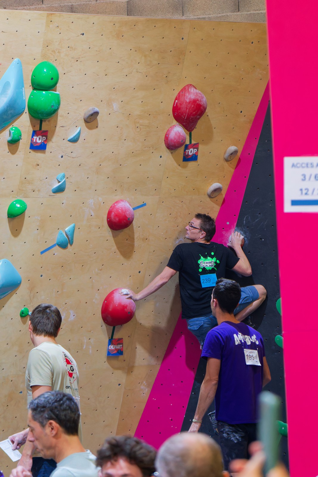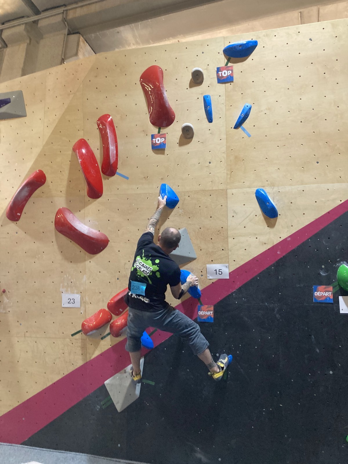 En senior, Vincent, le papa de Mani et Léon, se donne à la joie d’une compet de bloc officielle côté compétiteur. Il s’en sort très bien avec 12 blocs cochés et une très belle 10ème place !