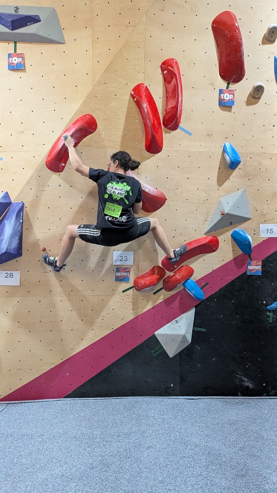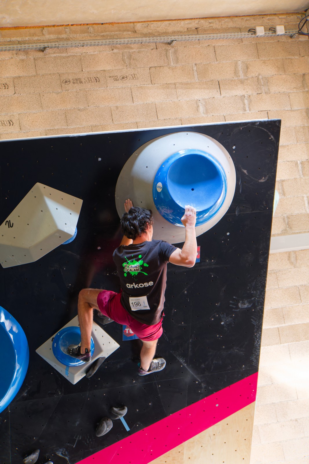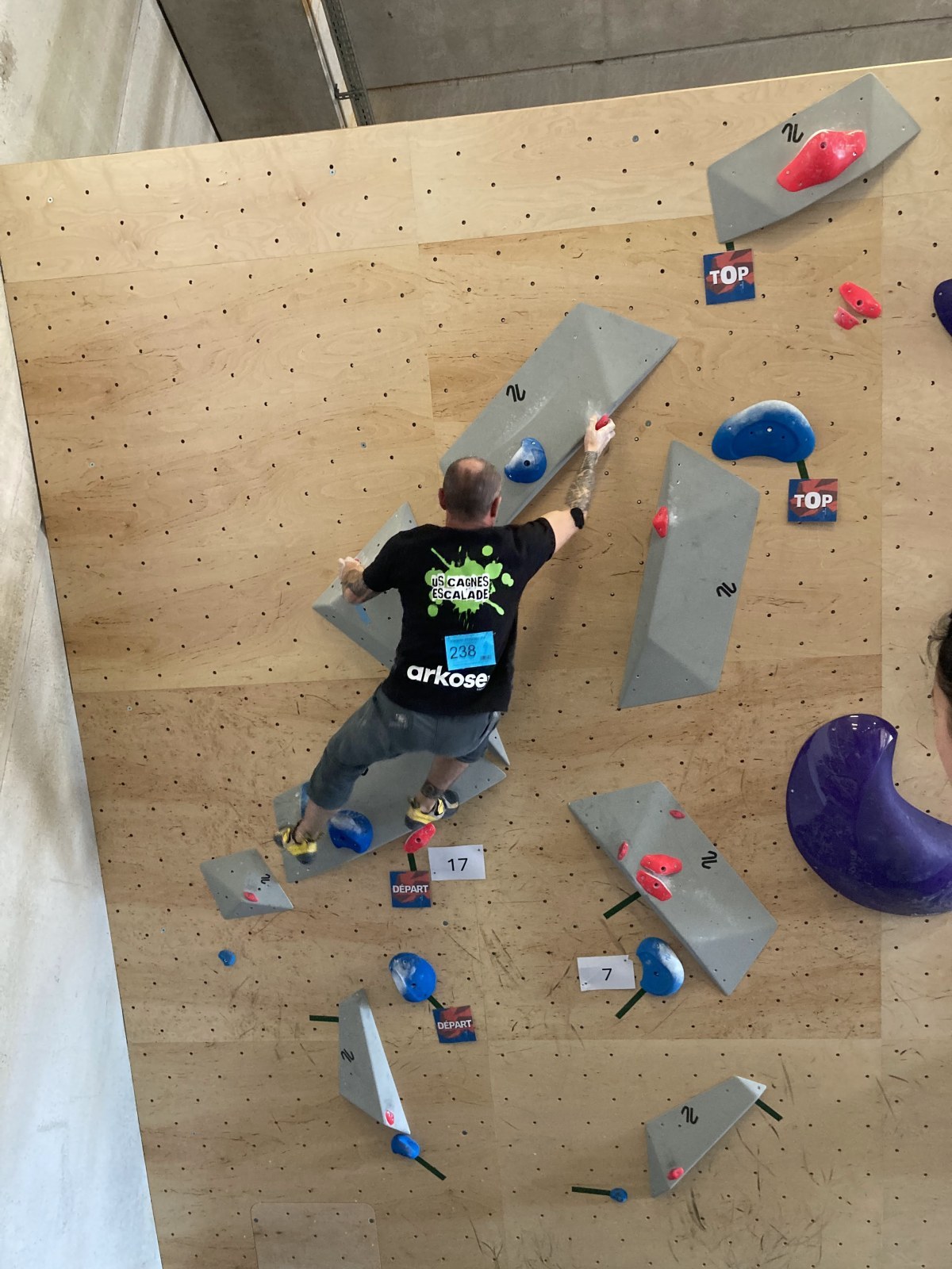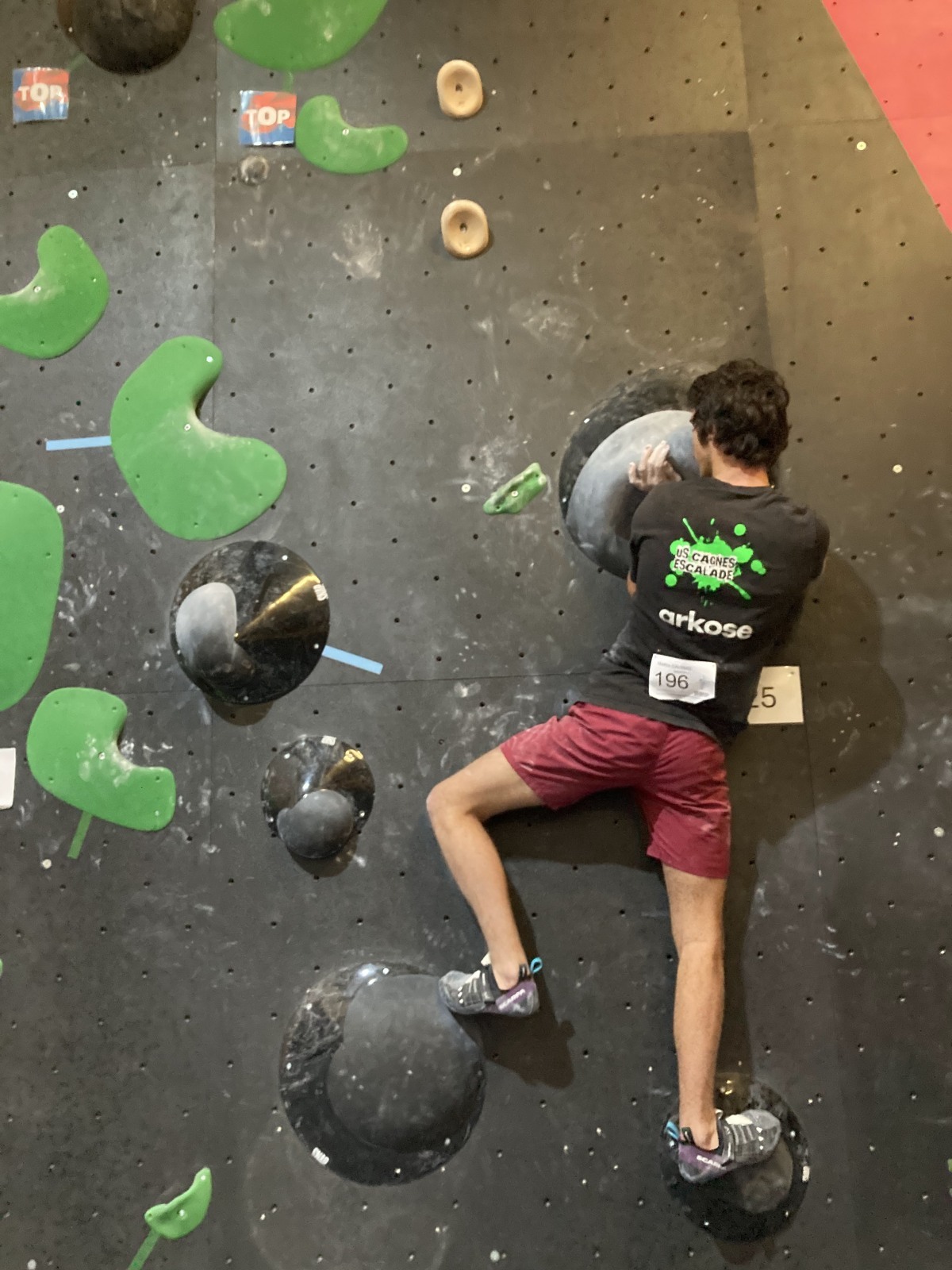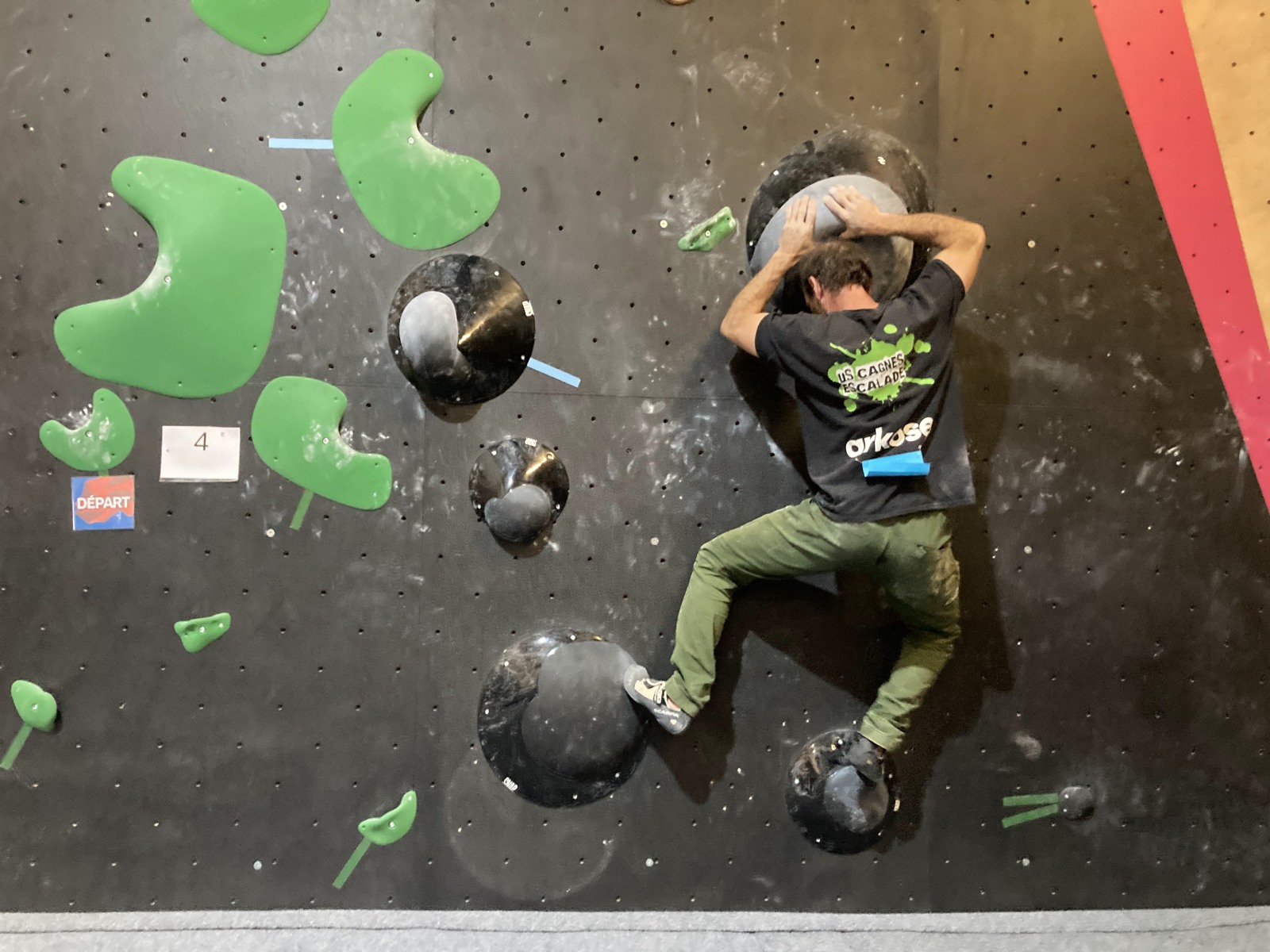 En senior, Vincent, le papa de Mani et Léon, se donne à la joie d’une compet de bloc officielle côté compétiteur. Il s’en sort très bien avec 12 blocs cochés et une très belle 10ème place !