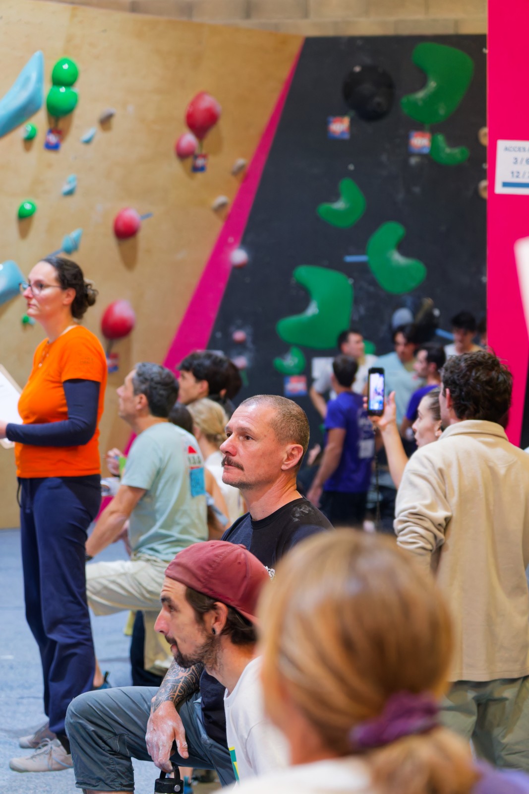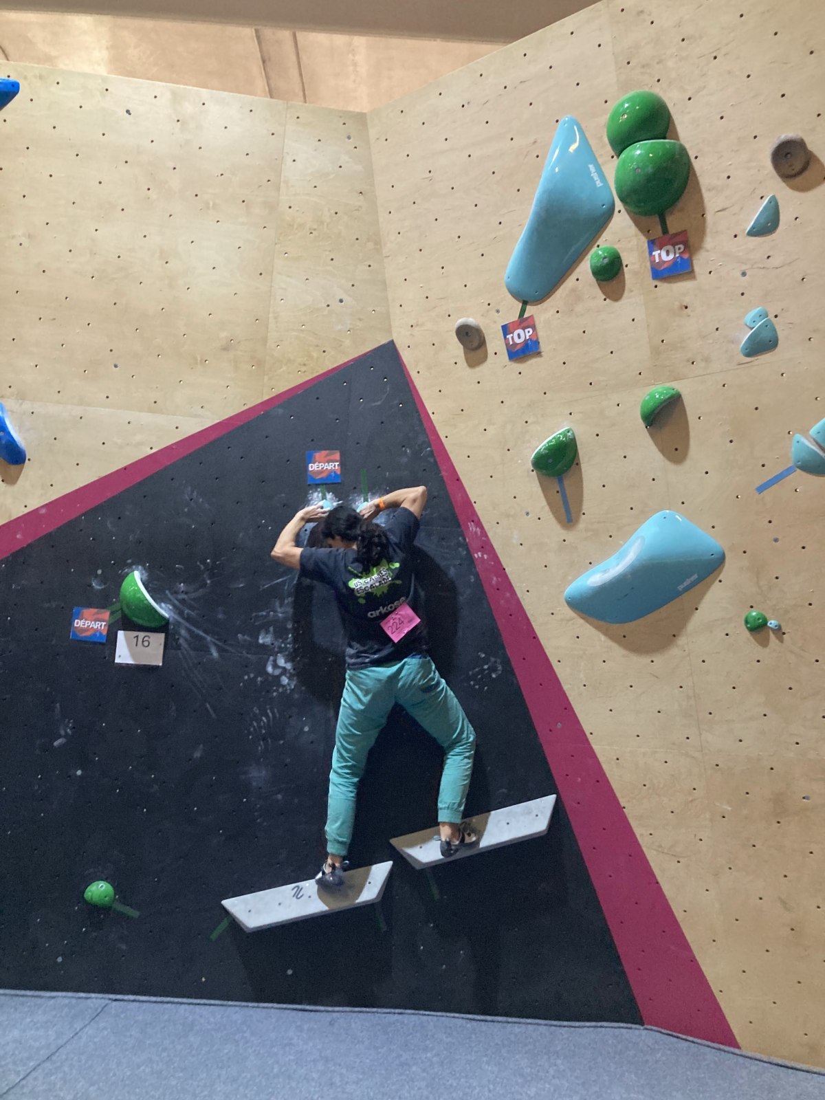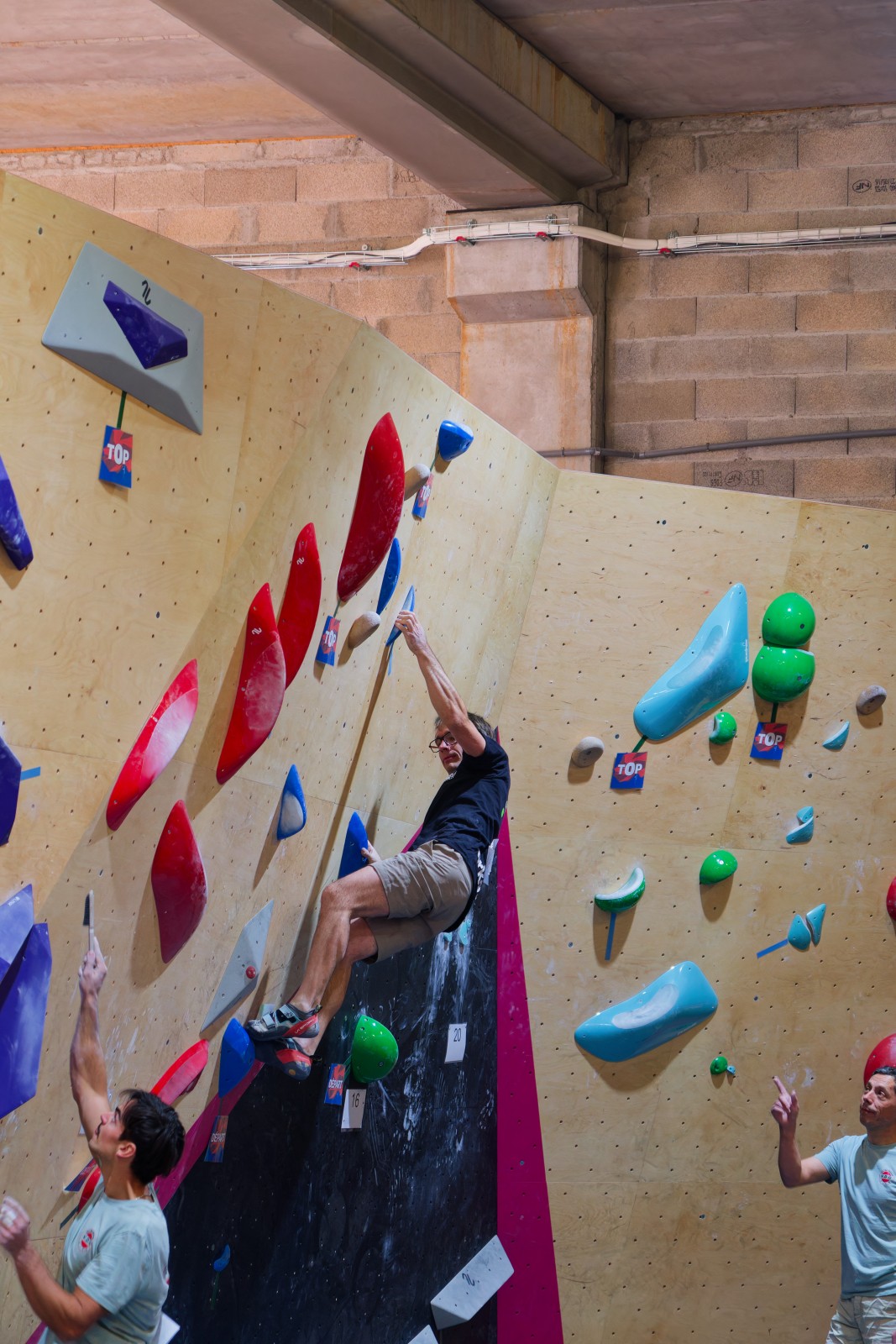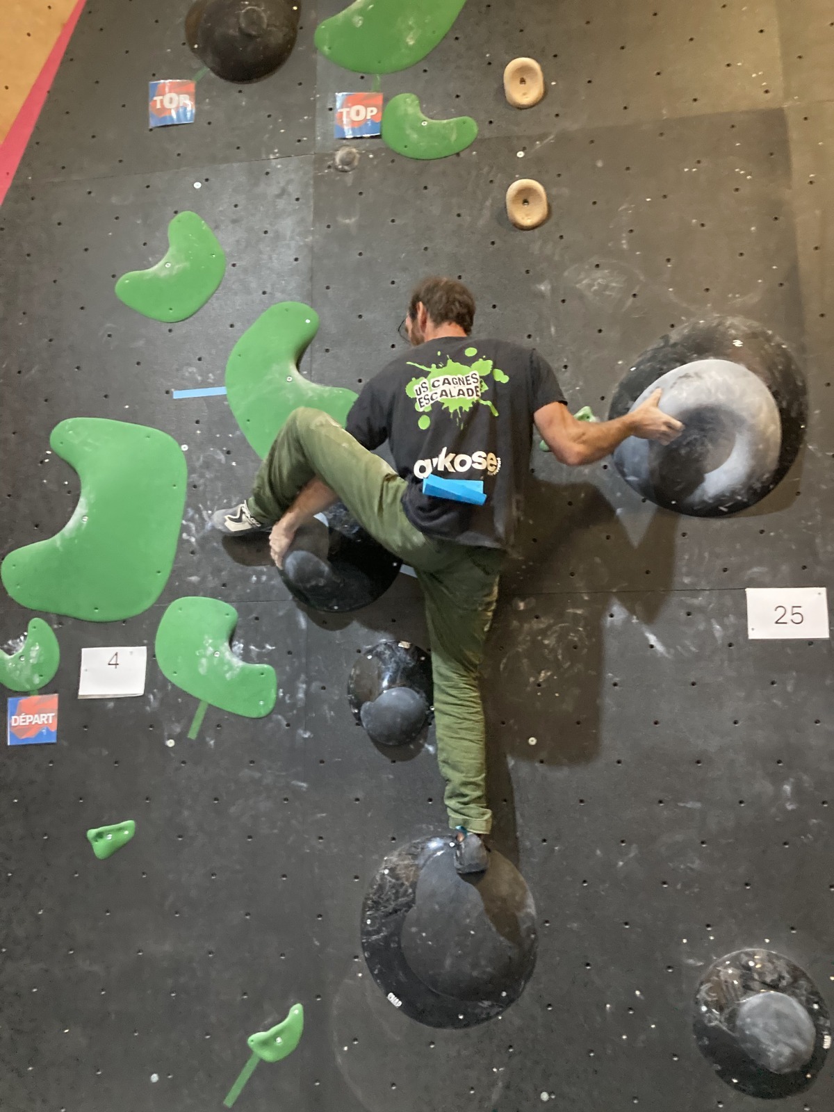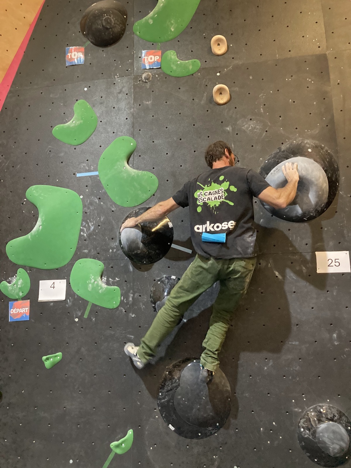 En senior, Vincent, le papa de Mani et Léon, se donne à la joie d’une compet de bloc officielle côté compétiteur. Il s’en sort très bien avec 12 blocs cochés et une très belle 10ème place !