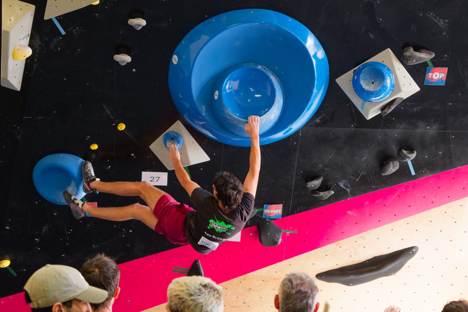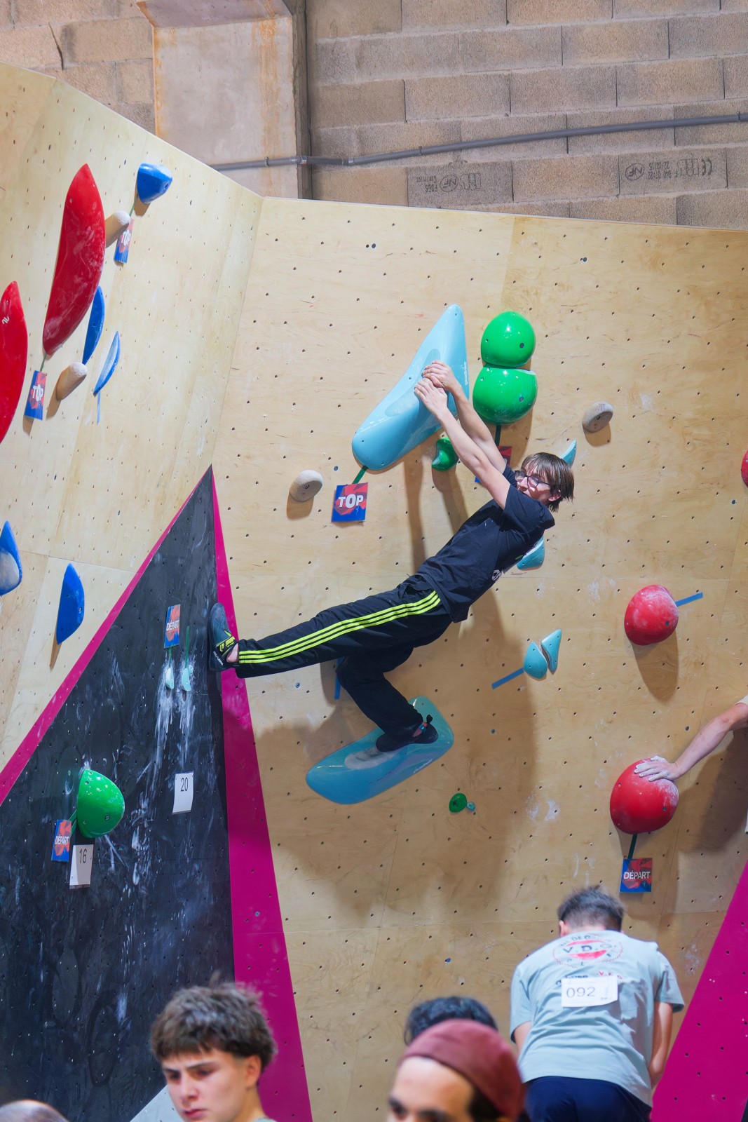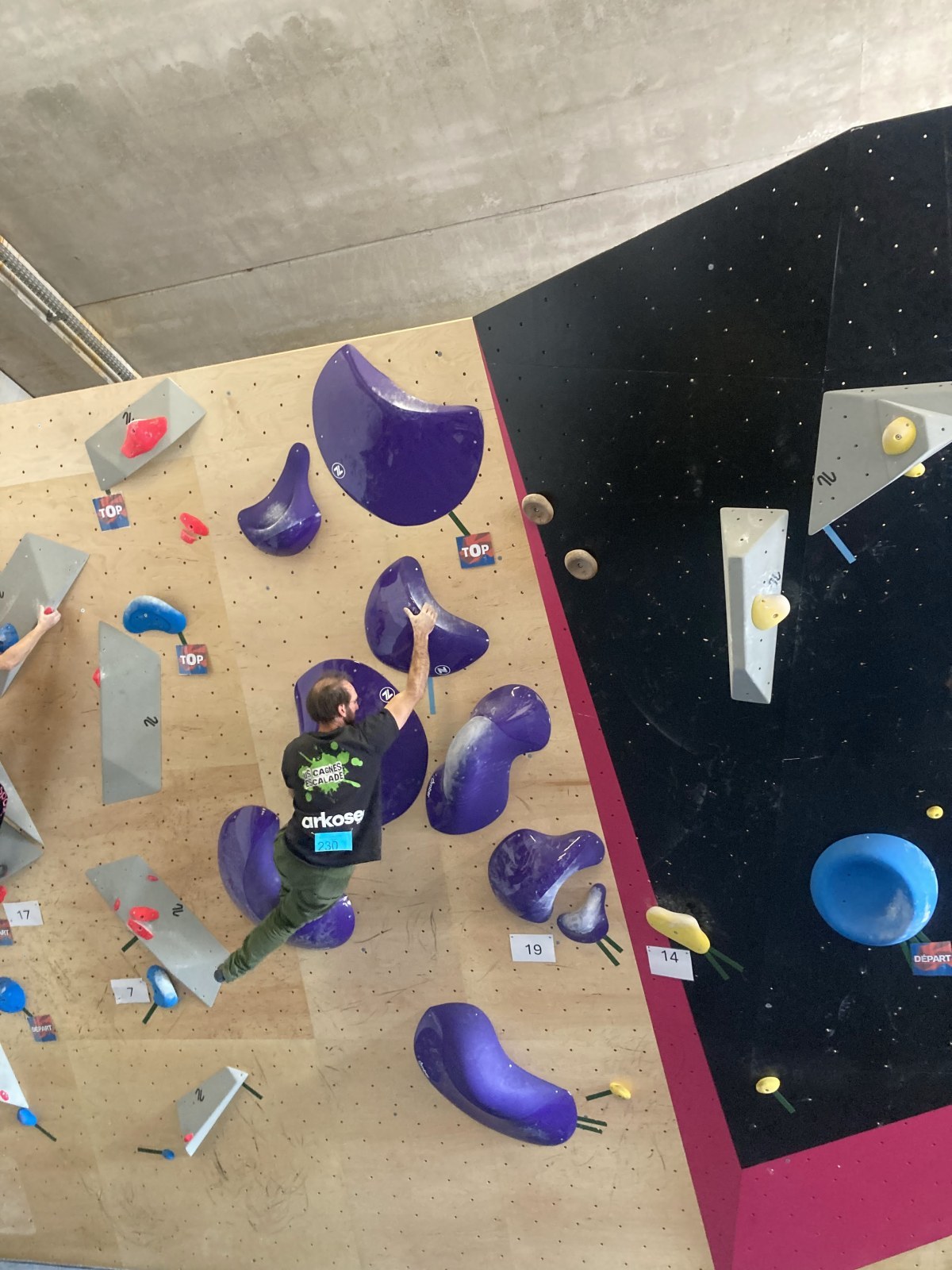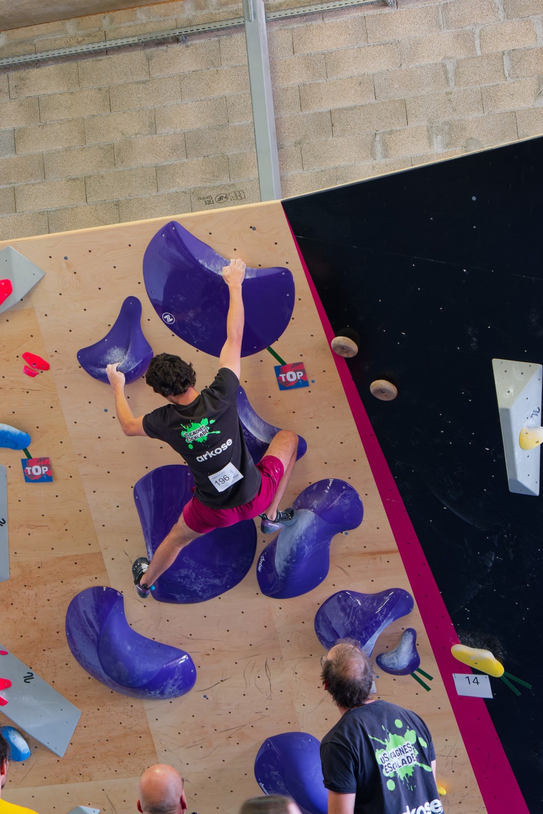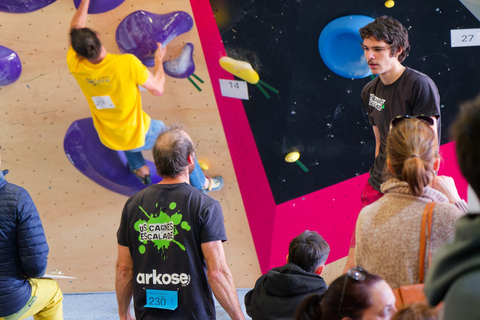 En senior, Vincent, le papa de Mani et Léon, se donne à la joie d’une compet de bloc officielle côté compétiteur. Il s’en sort très bien avec 12 blocs cochés et une très belle 10ème place !