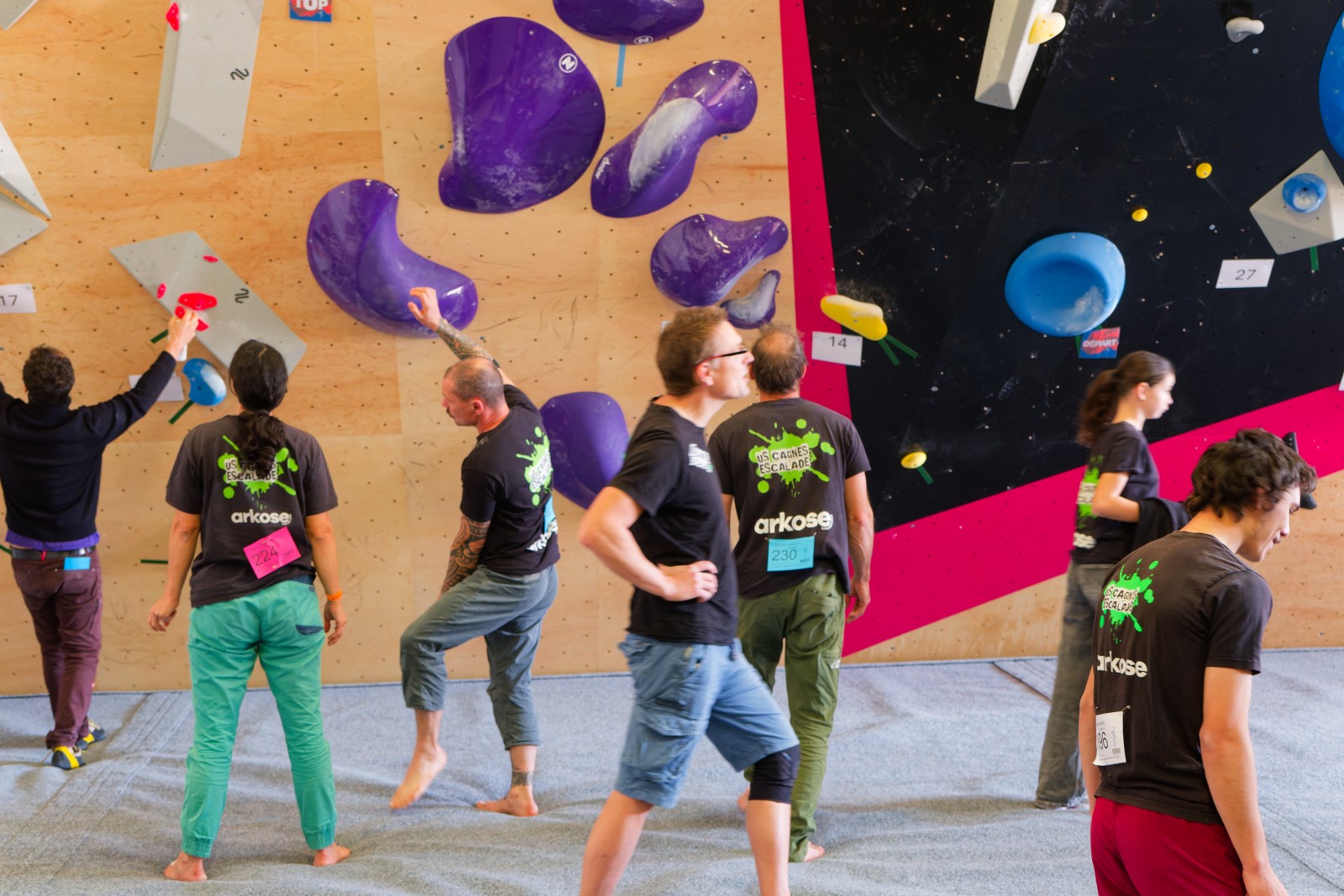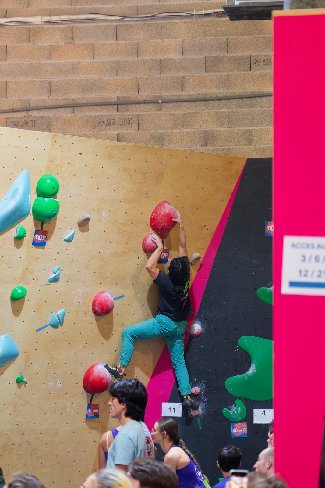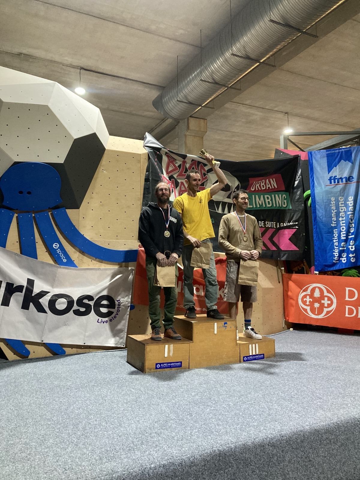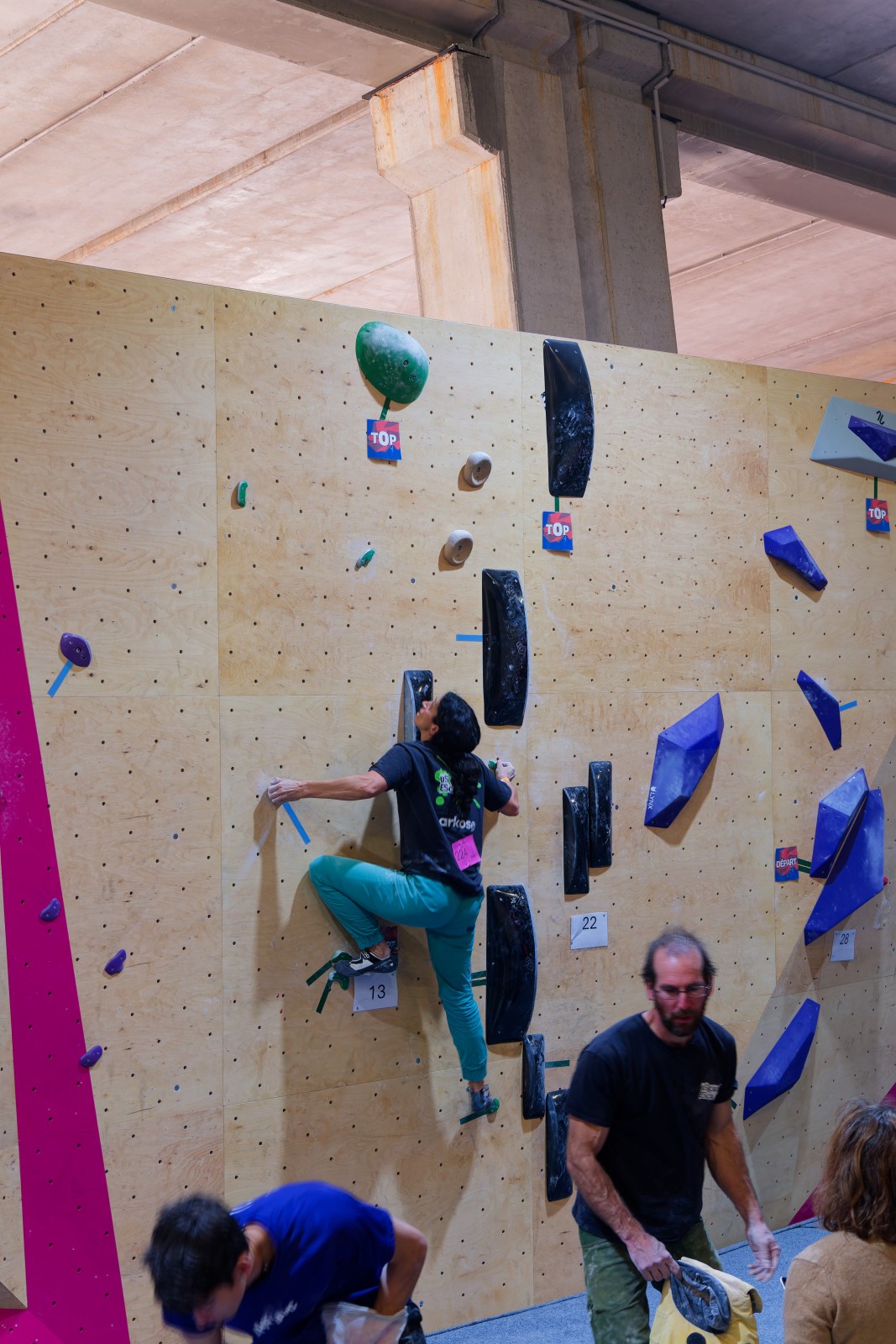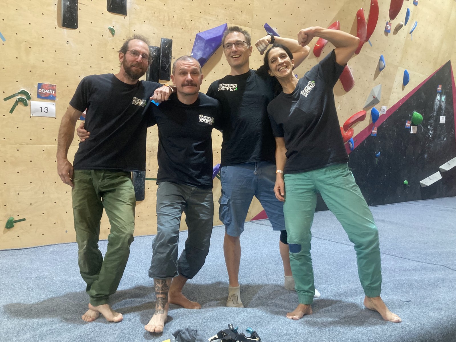 En senior, Vincent, le papa de Mani et Léon, se donne à la joie d’une compet de bloc officielle côté compétiteur. Il s’en sort très bien avec 12 blocs cochés et une très belle 10ème place !
