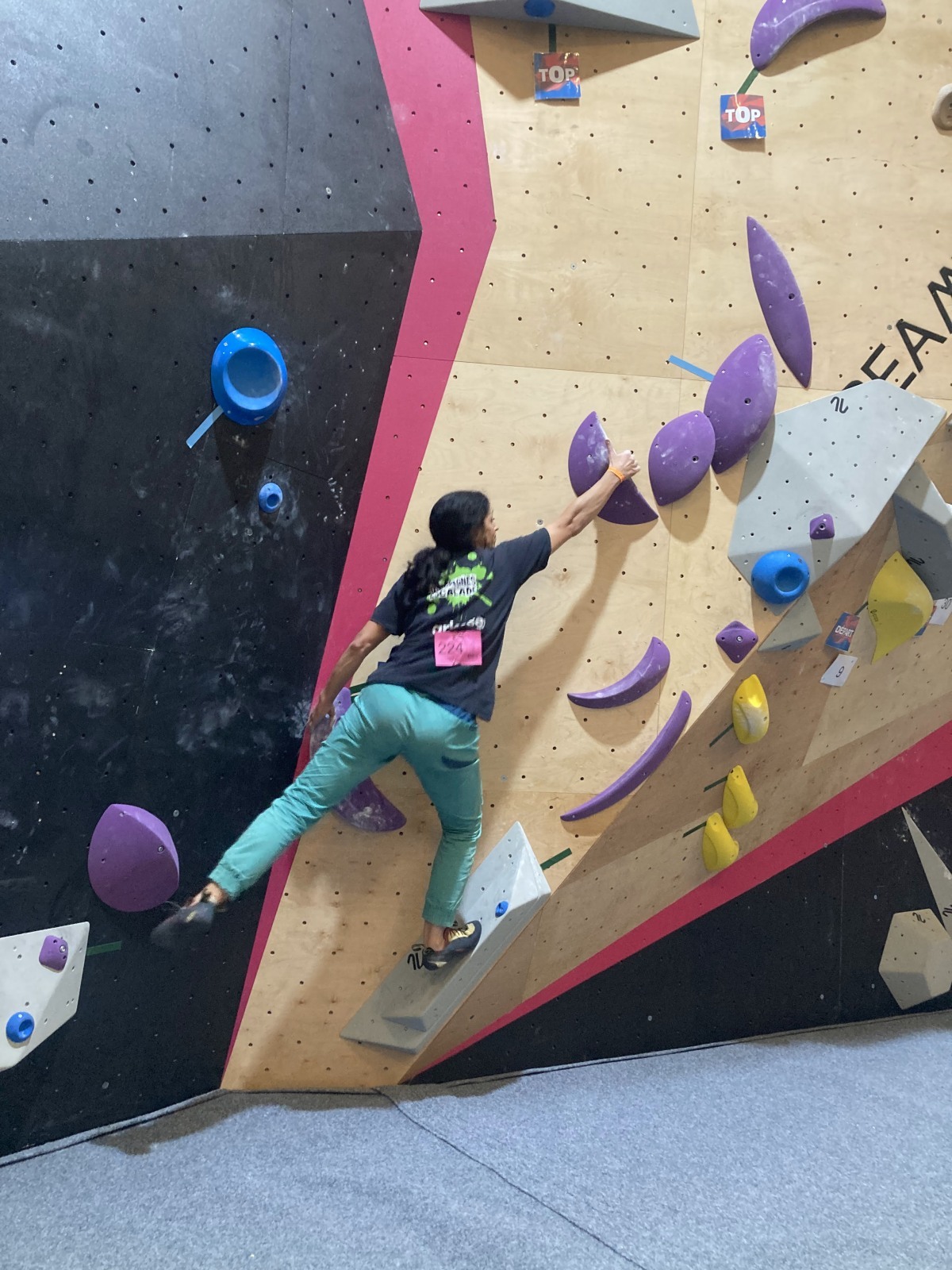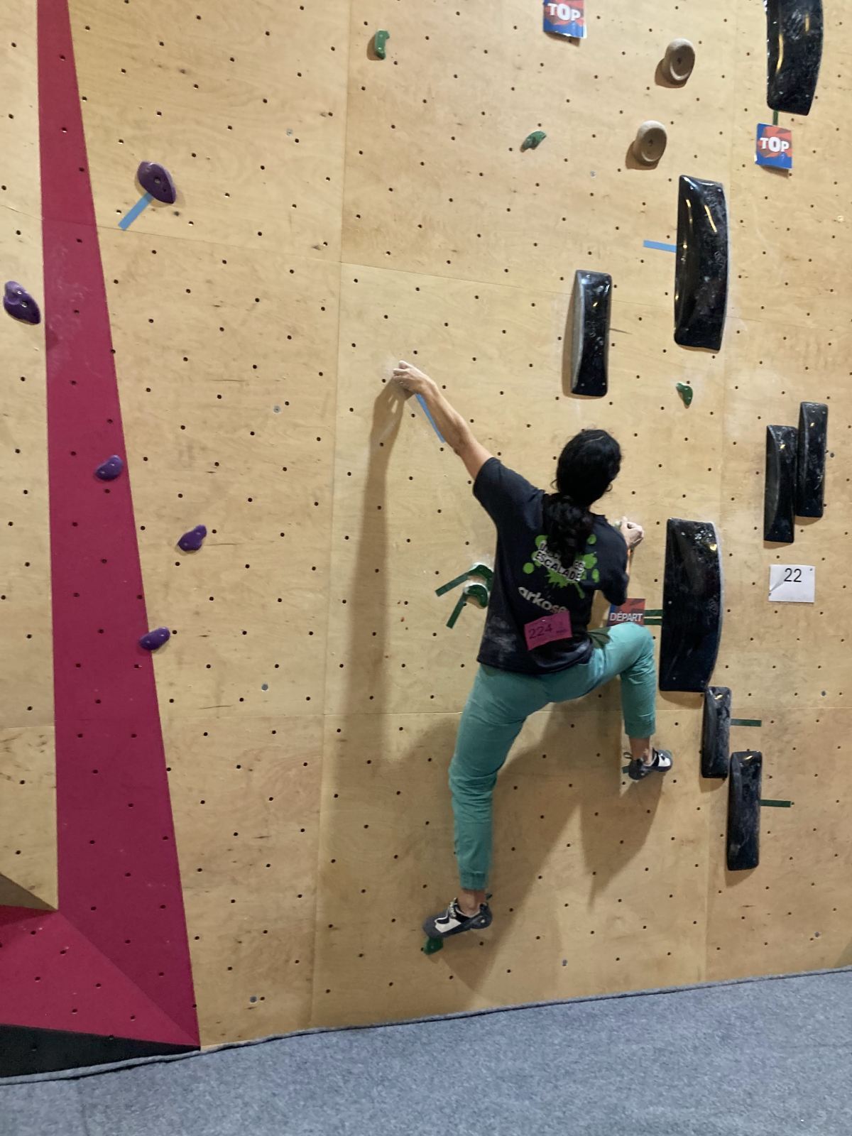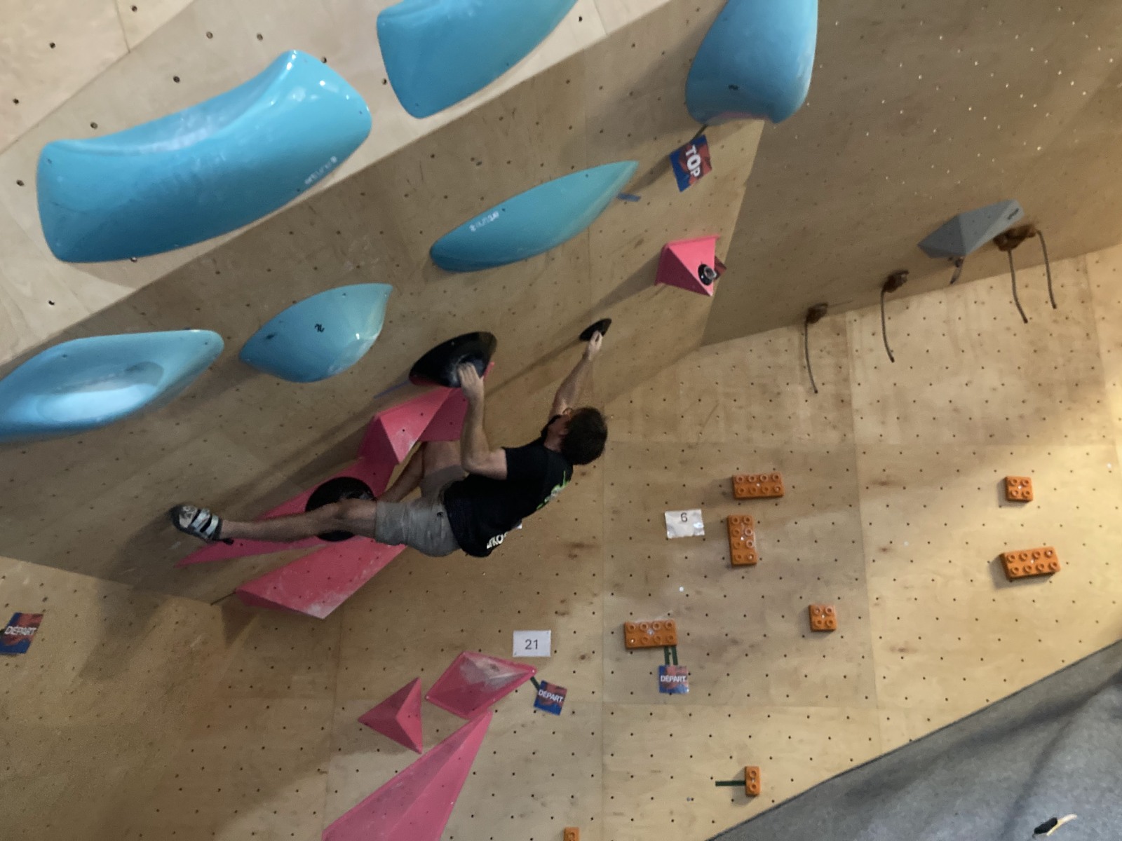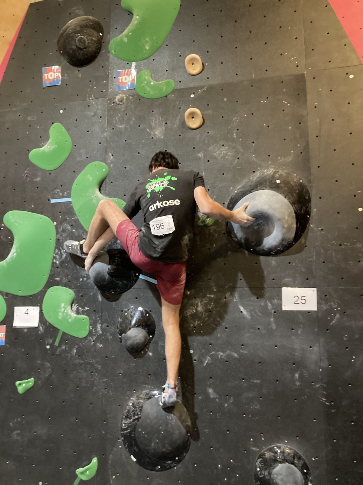 Pour finir, c’est au tour des U21, seniors et vétérans. Mathis, qui nous a fait l’honneur de rester fidèle à son club de coeur malgré un déménagement à Lyon est le seul réprésentant en U21, ce qui lui donne un titre départemental facilement. Il concourt cependant avec les seniors, où le niveau est très relevé. Le podium est inatteignable et avec 17 blocs, Mathis se place 4ème et qualifié en finale où il garde sa place.